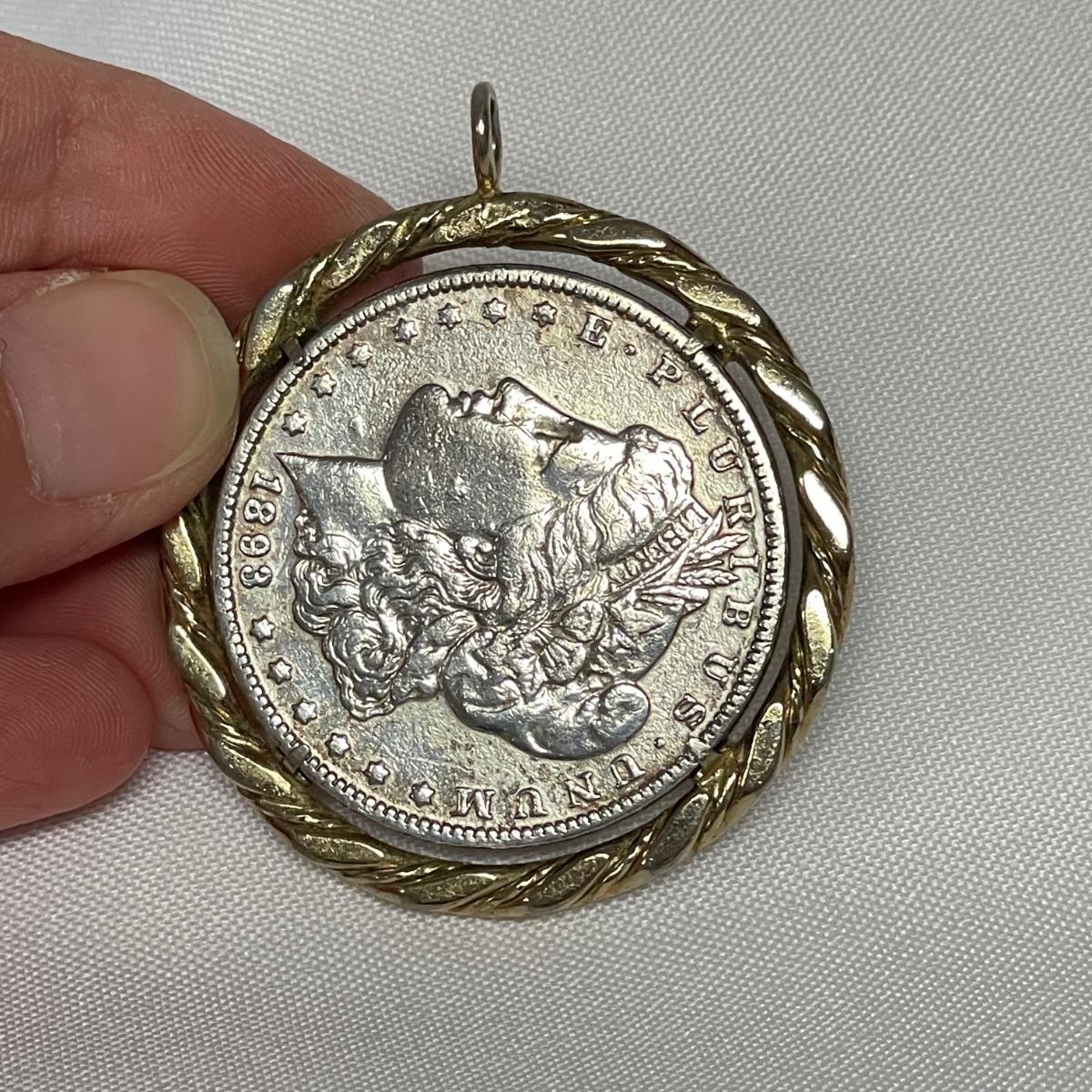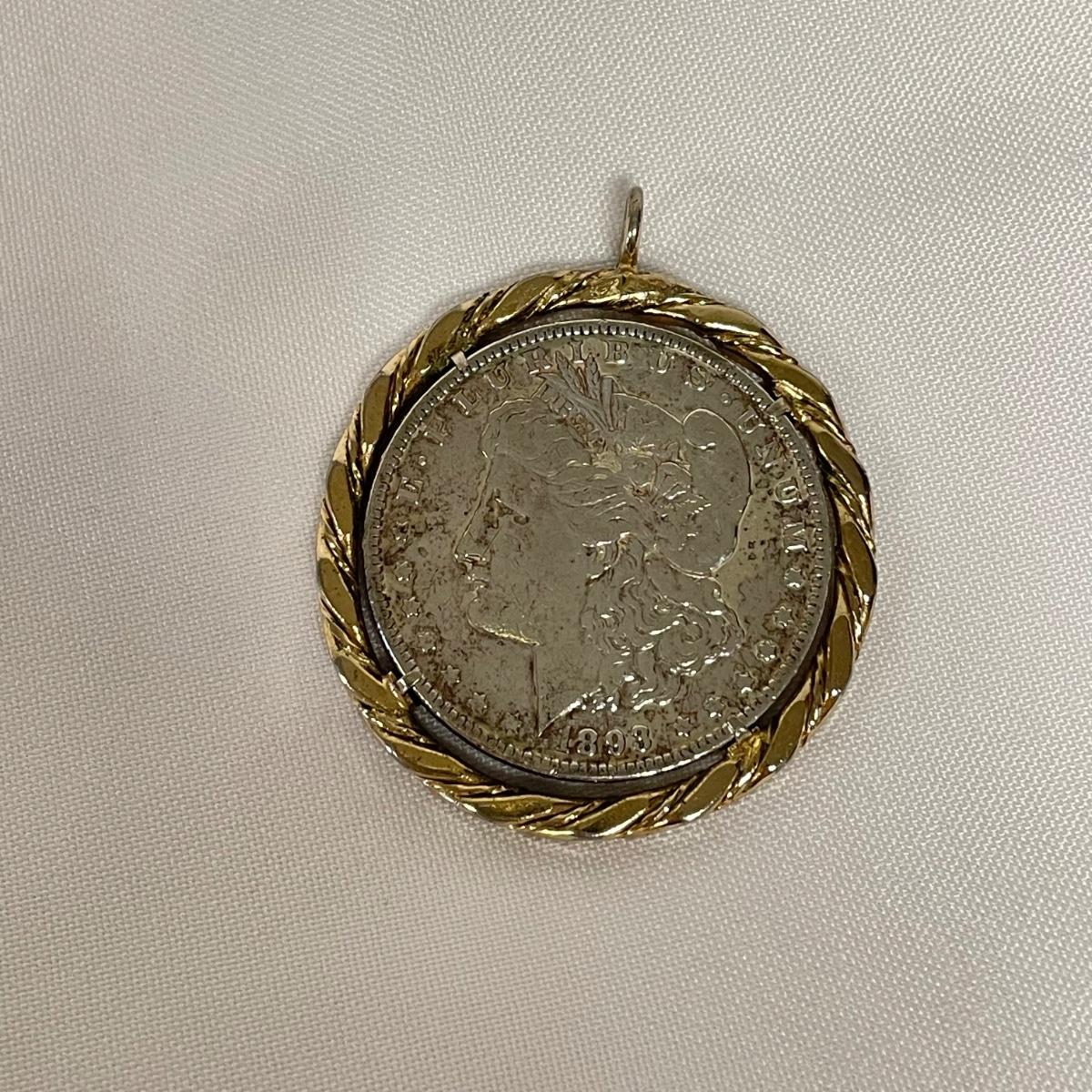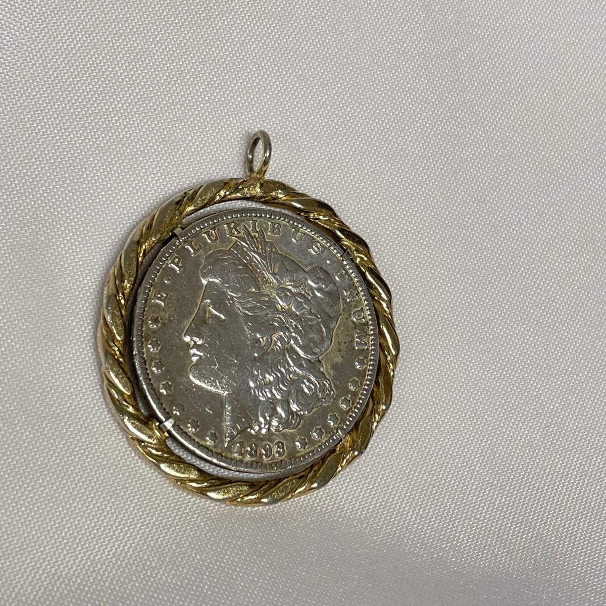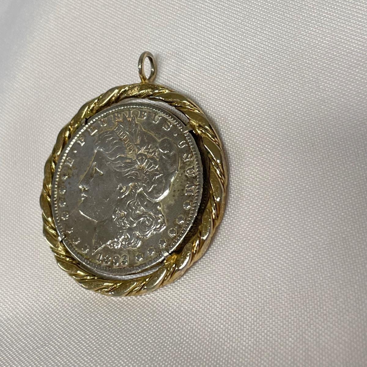 Likely a Philadelphia mint 1893 silver Morgan Dollar in a thick gold colored pendant setting. Ring can spin in its setting. See images. Shipping available. All sales are final. No returns or refunds. Please bid accordingly.