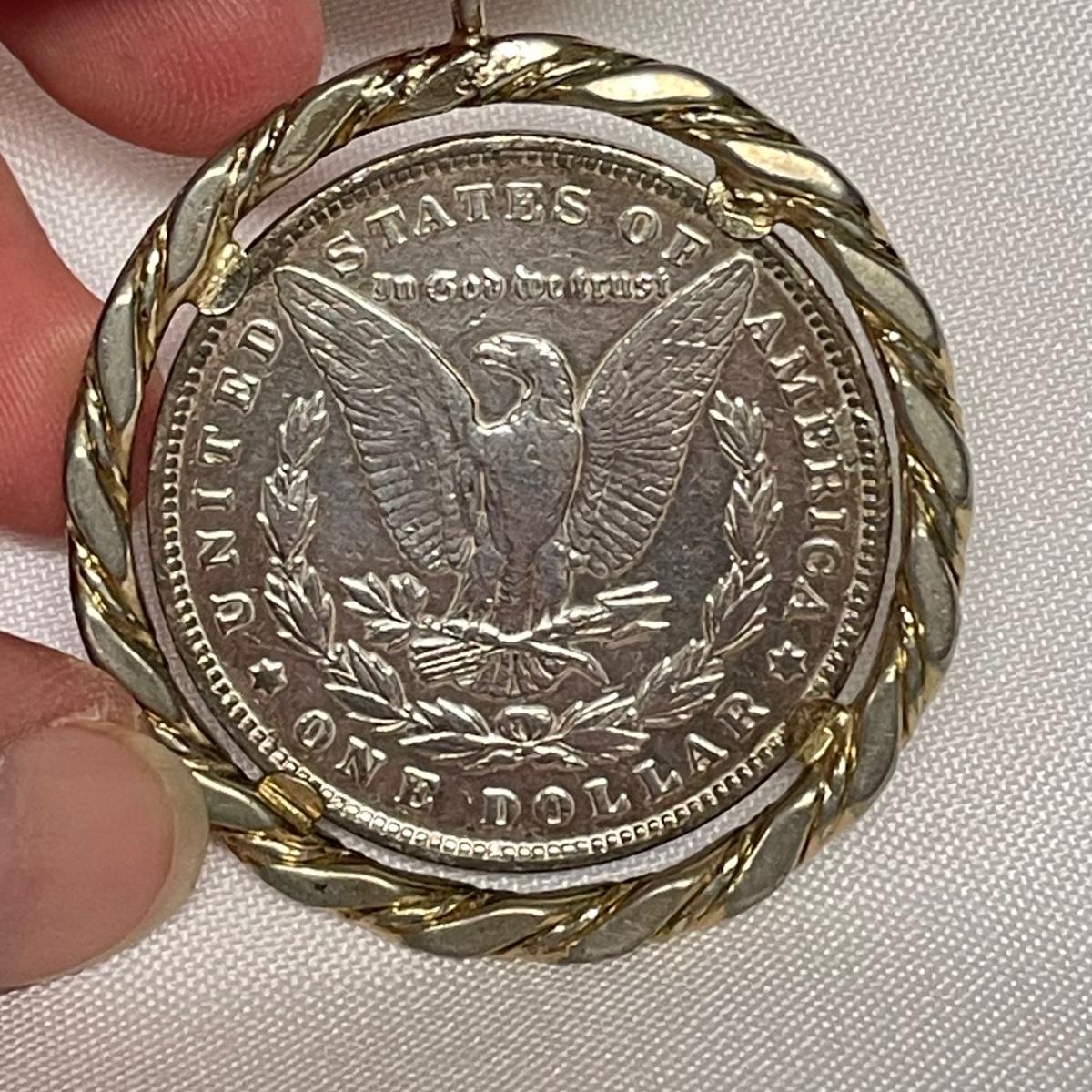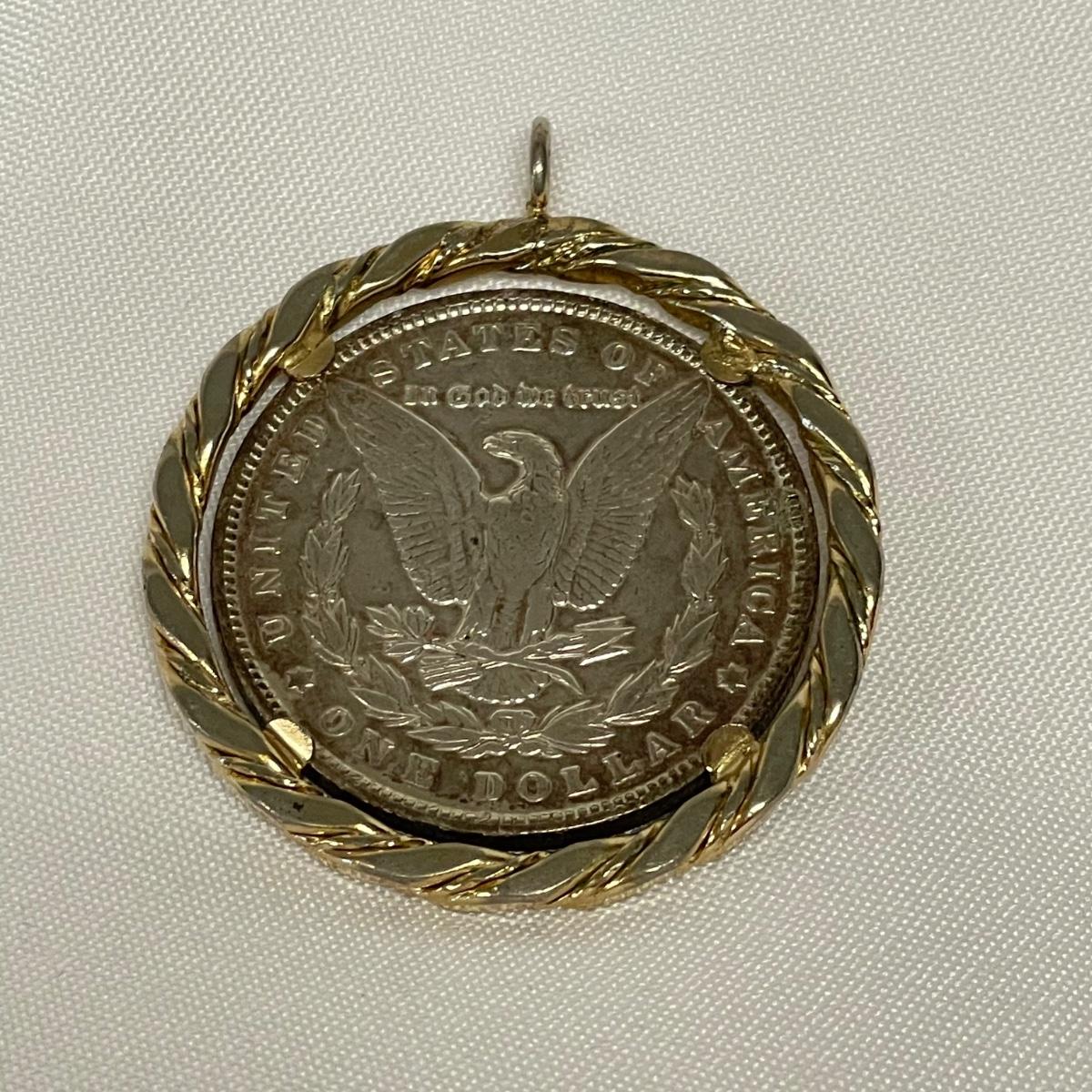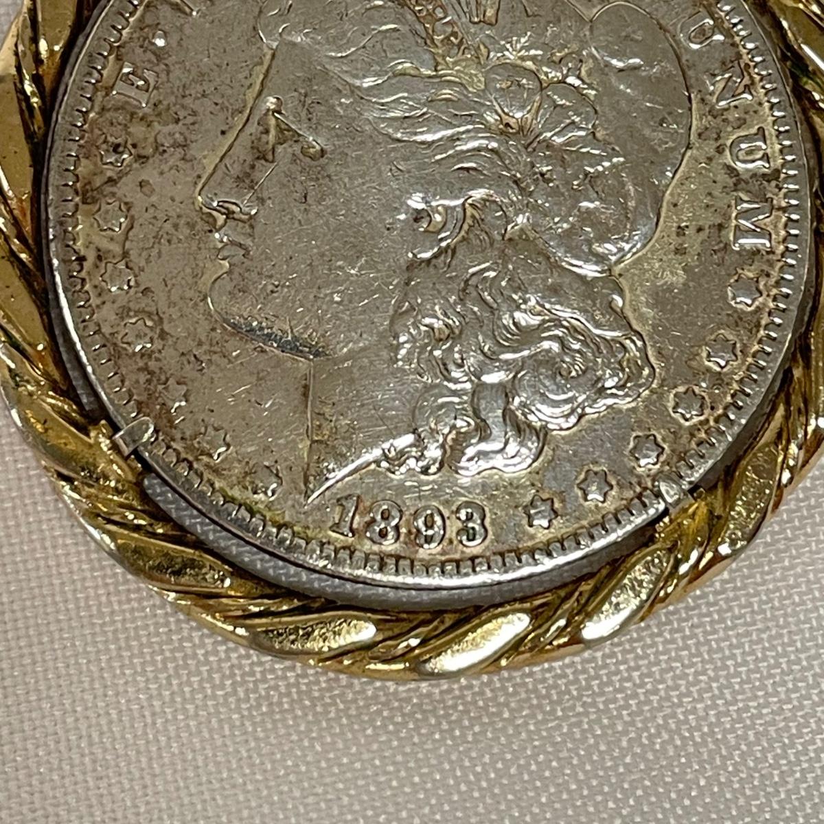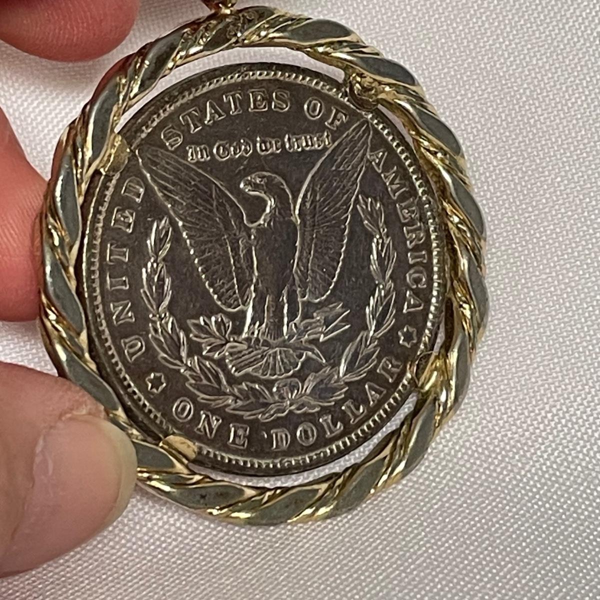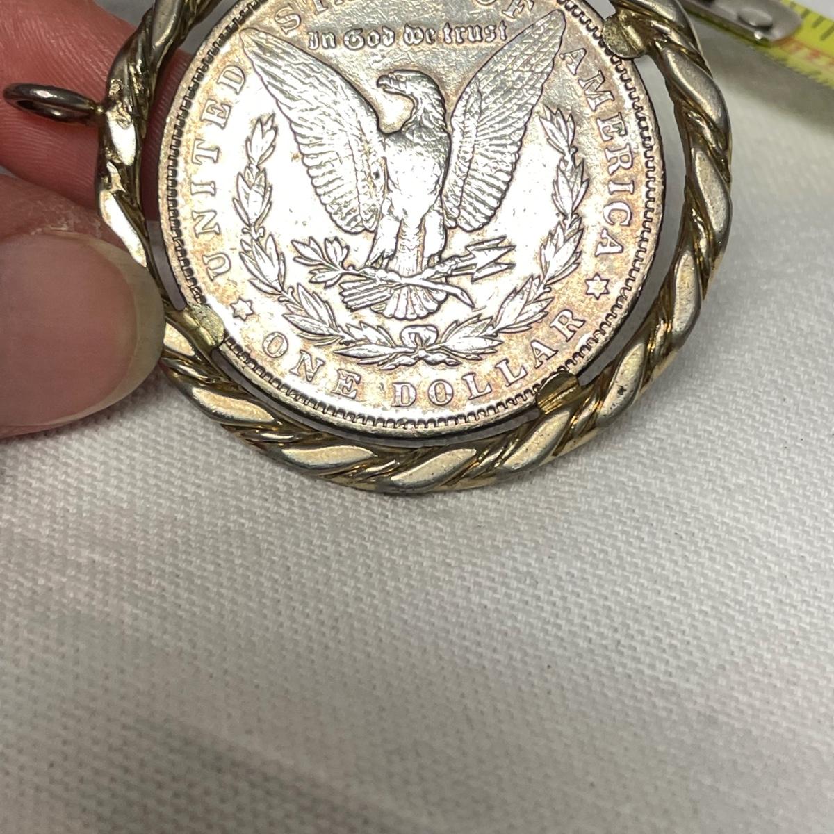 Likely a Philadelphia mint 1893 silver Morgan Dollar in a thick gold colored pendant setting. Ring can spin in its setting. See images. Shipping available. All sales are final. No returns or refunds. Please bid accordingly.