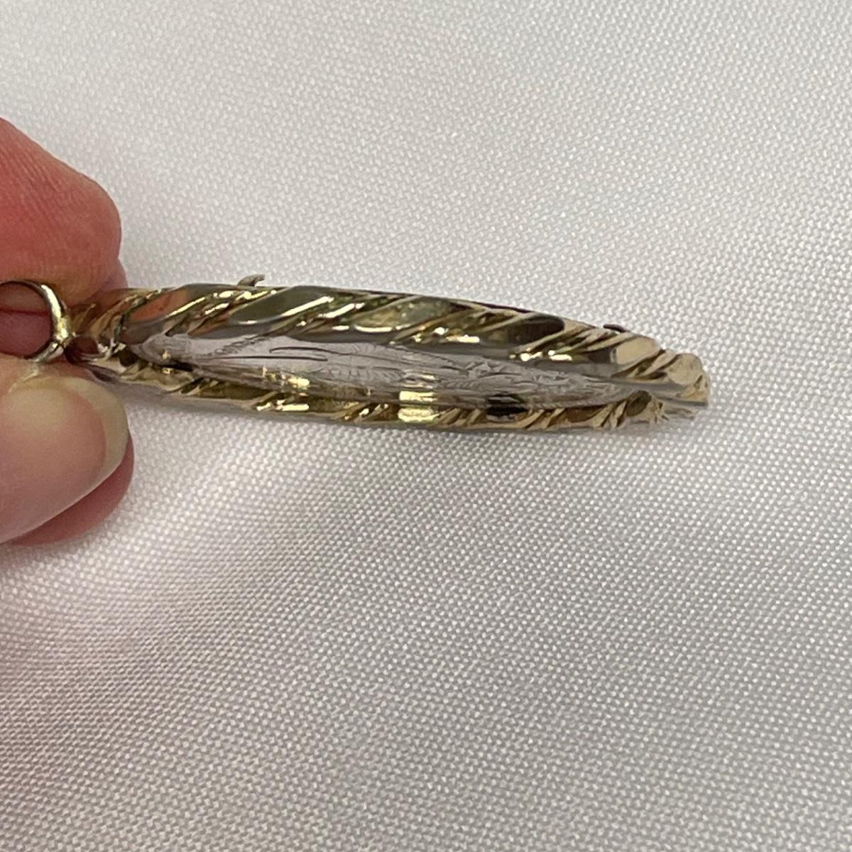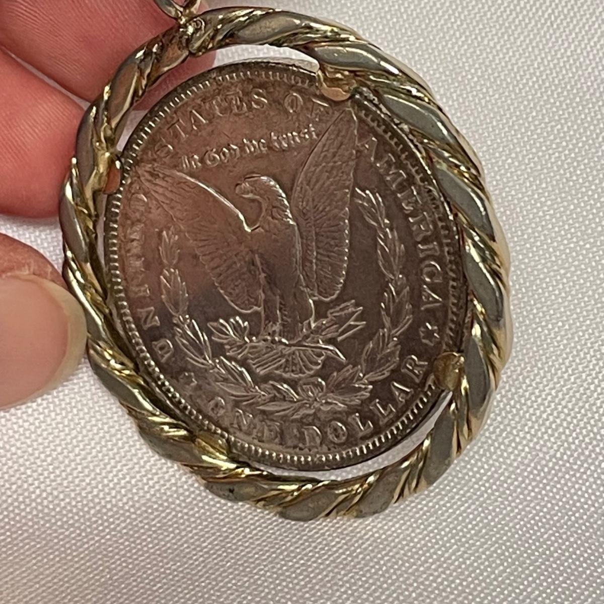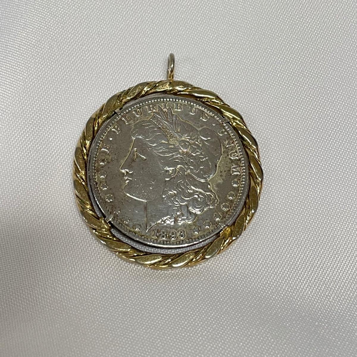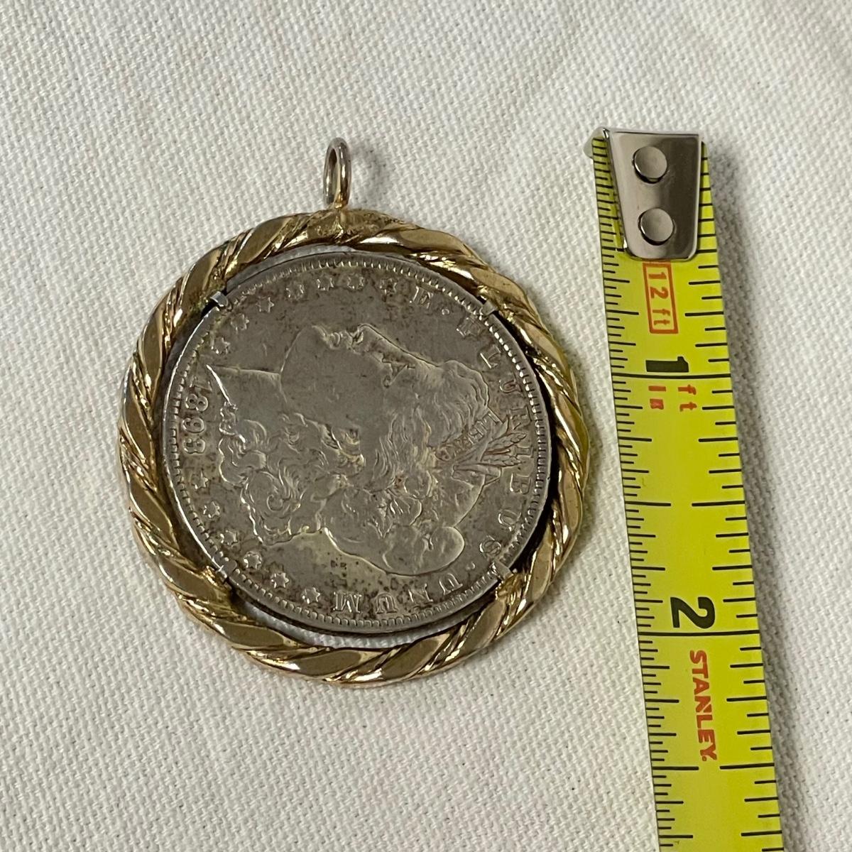 Likely a Philadelphia mint 1893 silver Morgan Dollar in a thick gold colored pendant setting. Ring can spin in its setting. See images. Shipping available. All sales are final. No returns or refunds. Please bid accordingly.