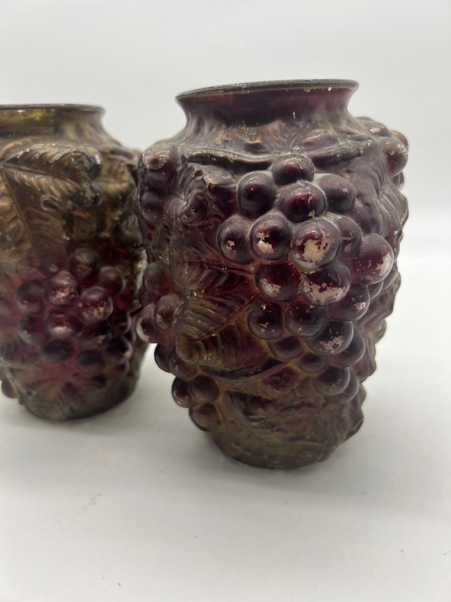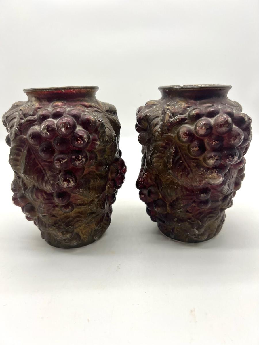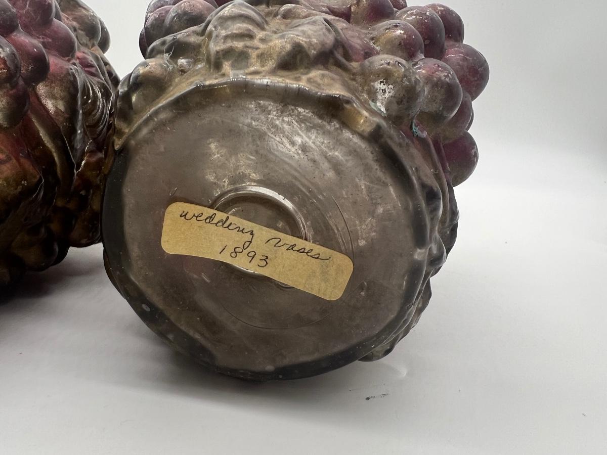 Remember the days when we wrote special stories about pieces? Well, these vases have a hand written note that say wedding vases 1893! Believed to be Goofus Glass. See pictures as some of the color has rubbed off. Vases measure 7 inches tall, approximately 6 inches wide.