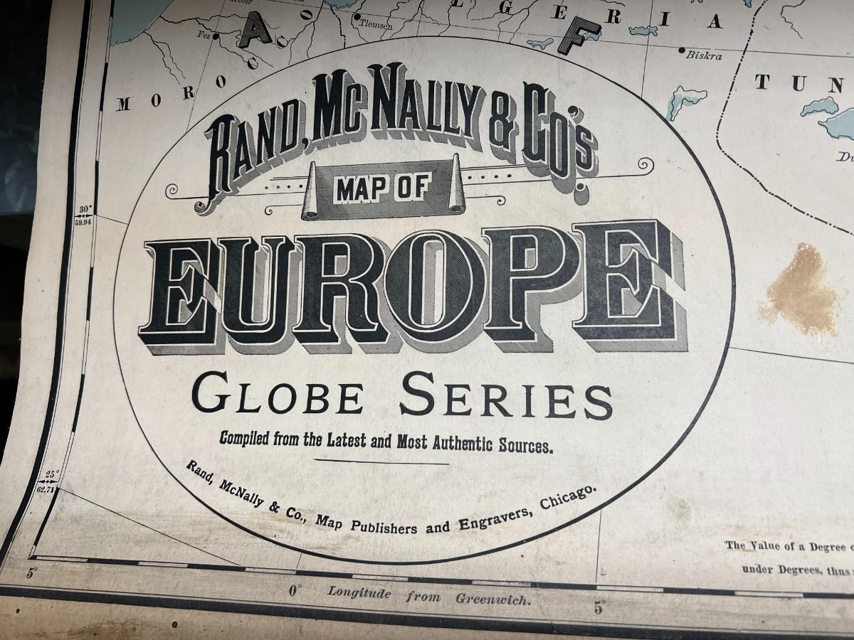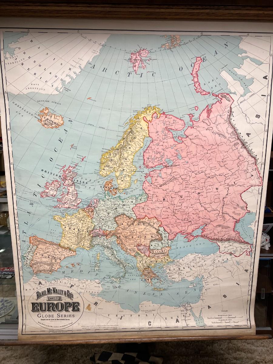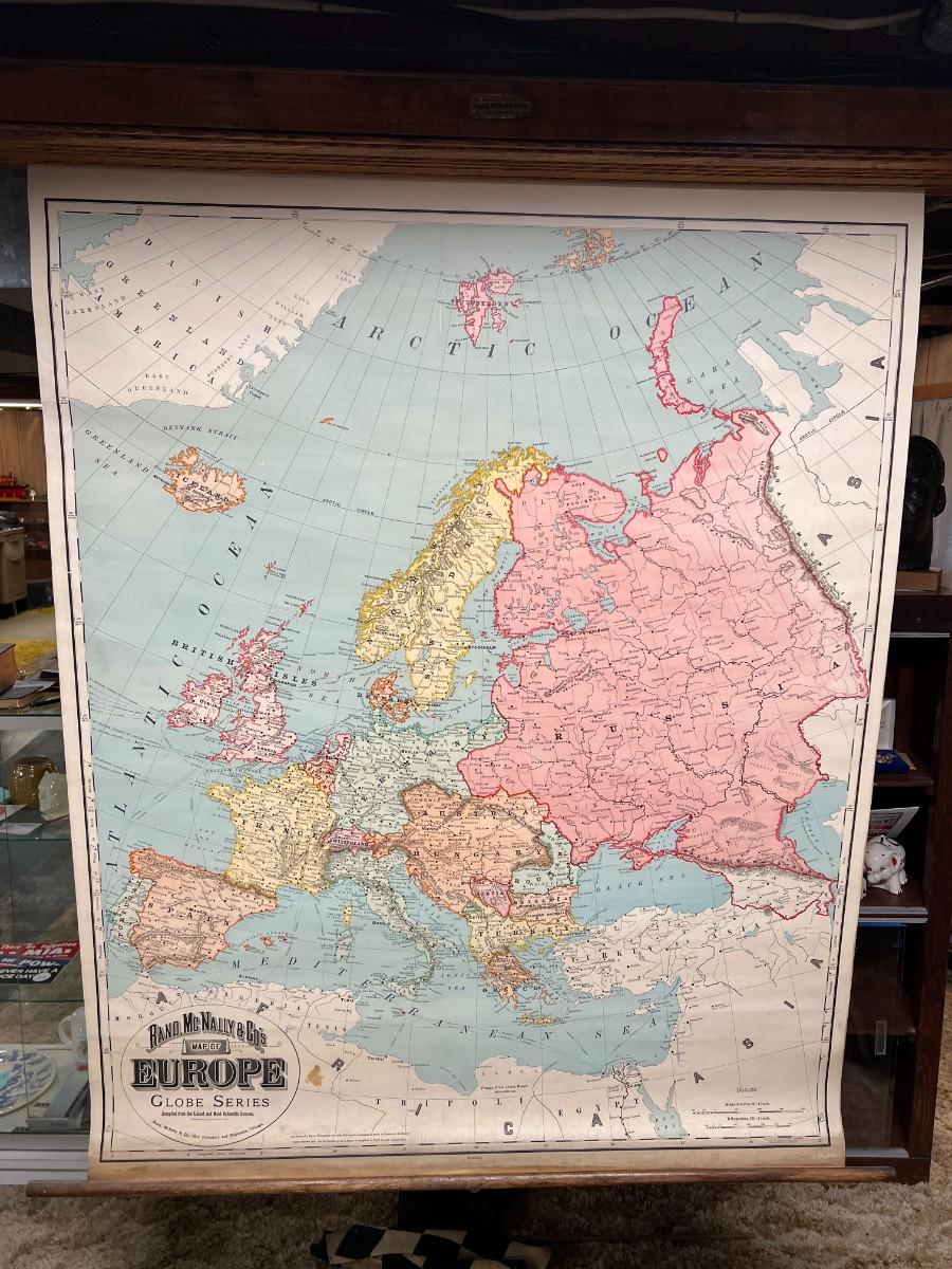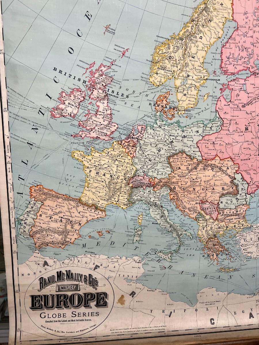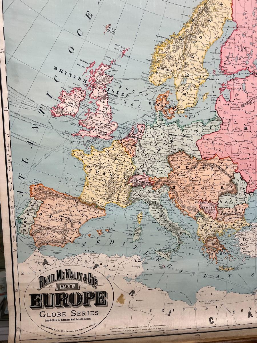 1898 Antique Rand, McNally & Co.'s Map of Europe in Original Wood Pull-Down Case. A rare find! Manufactured by Rand, McNally & Co Map Publishers and Engravers, of Chicago, New York, and London. Map of Europe from the Globe Series. Good condition, as shown.
