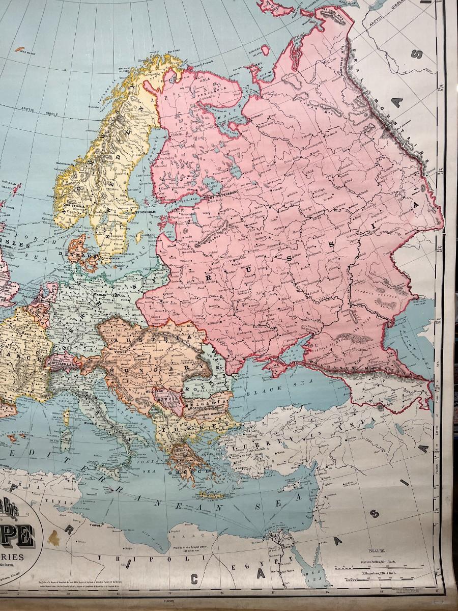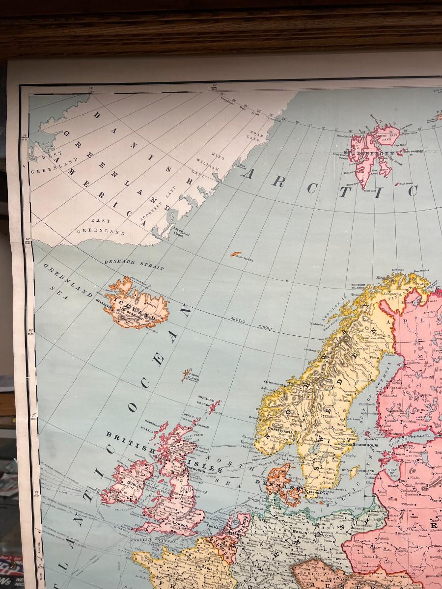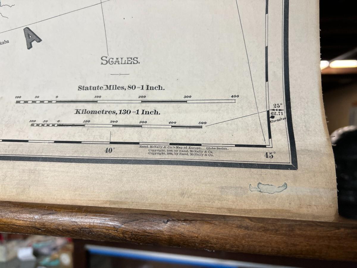 1898 Antique Rand McNally & Co Map of Europe in Original Wood Pull-Down Case