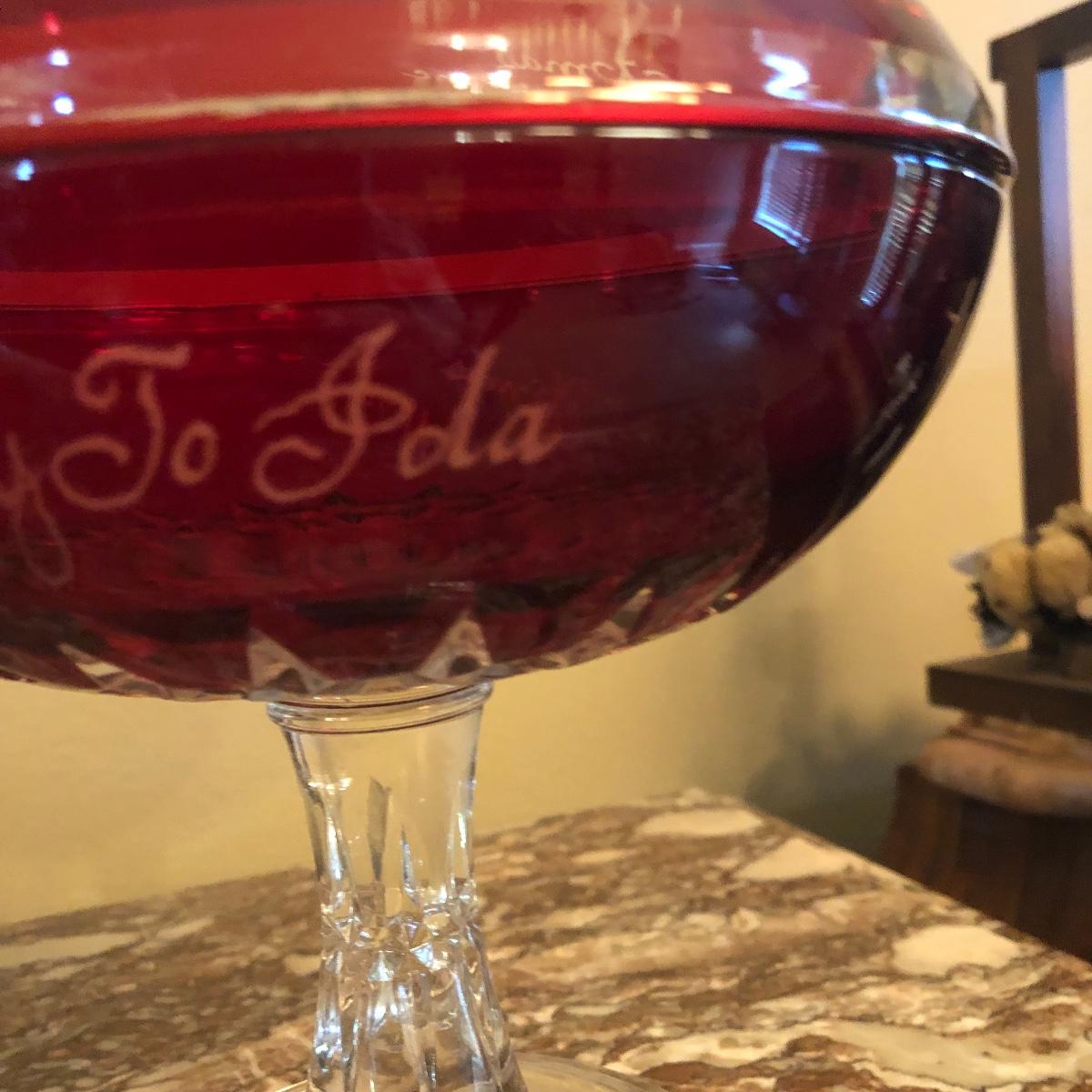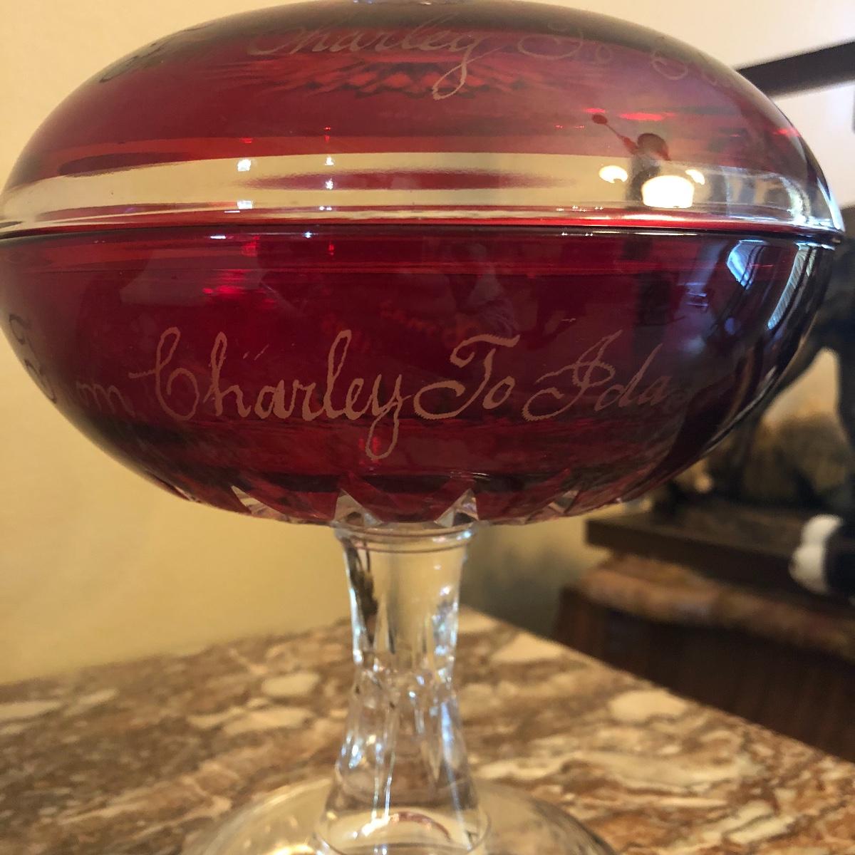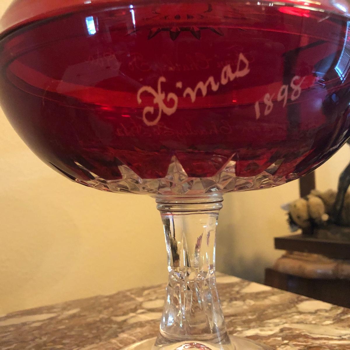 This is a unique candy dish. It is red and clear crystal but is etched Xmas 1898 and from Charley to Ida. Gorgeous piece 11” high