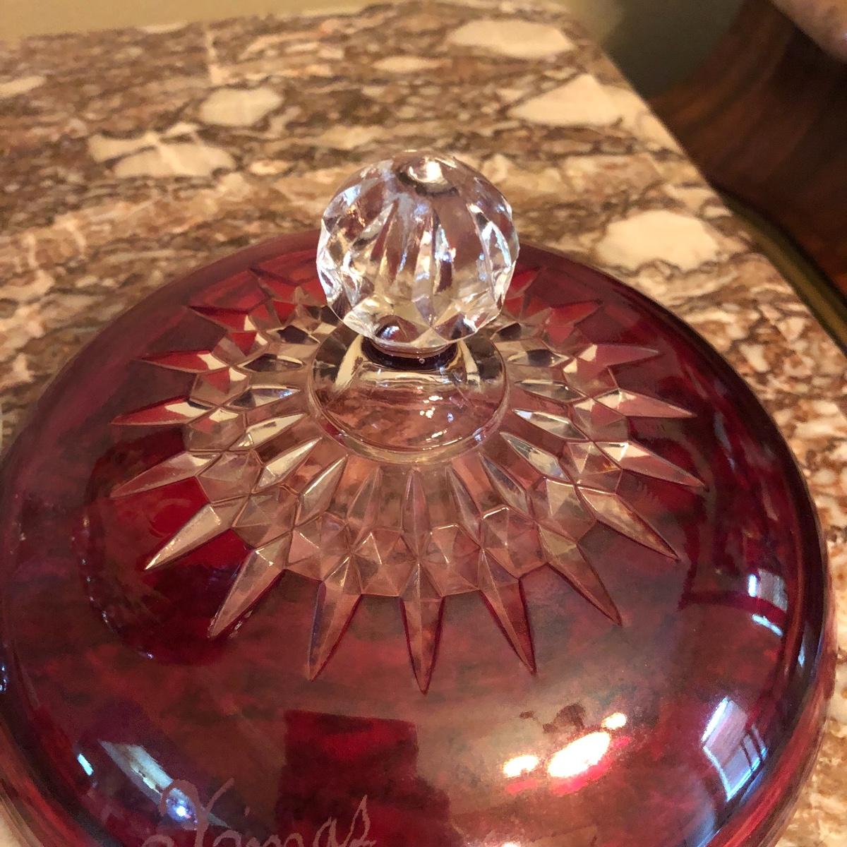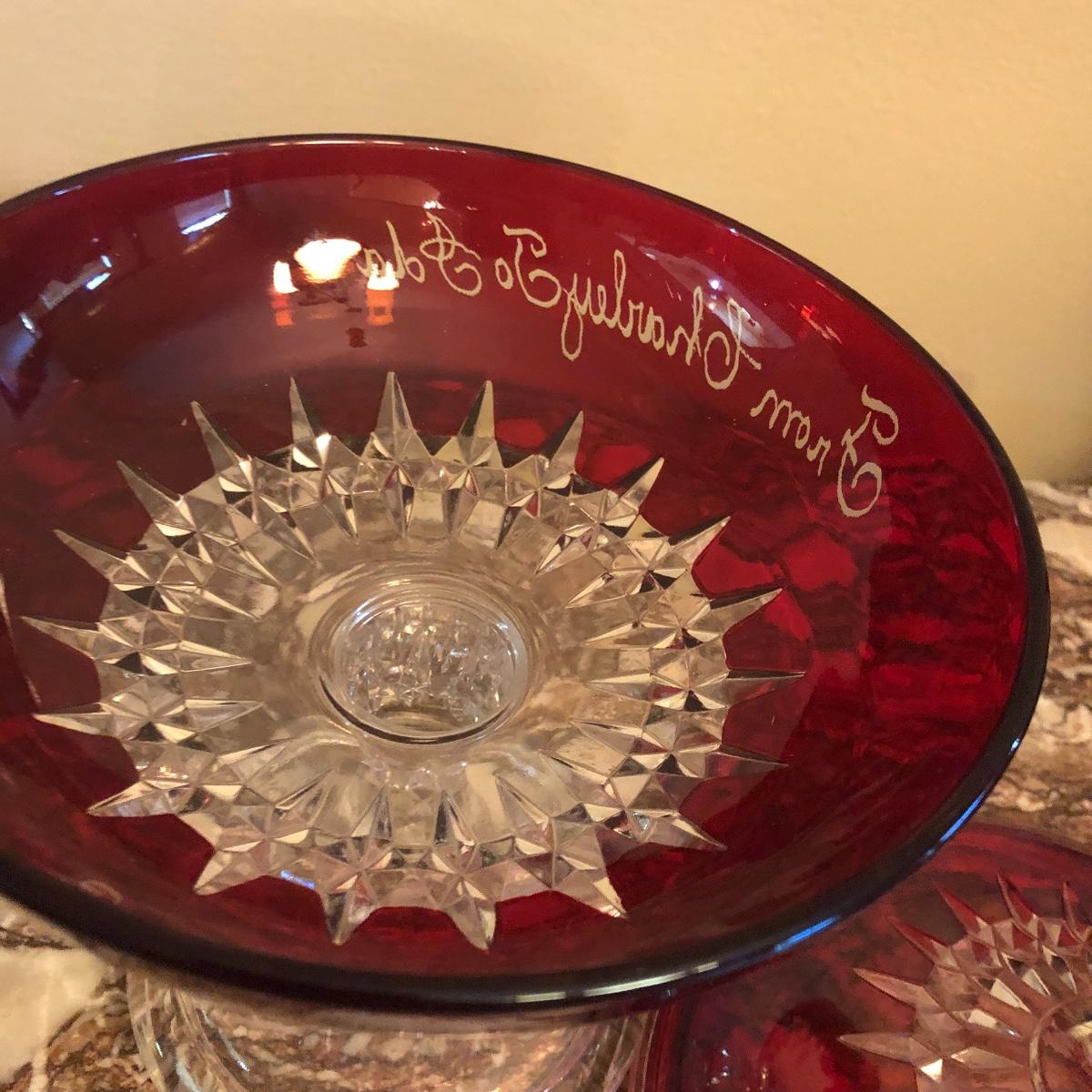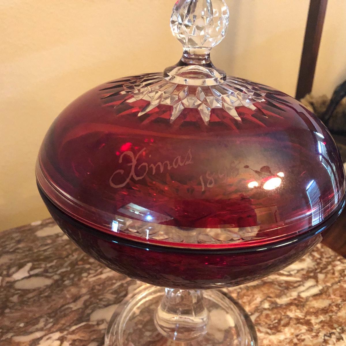 This is a unique candy dish. It is red and clear crystal but is etched Xmas 1898 and from Charley to Ida. Gorgeous piece 11” high