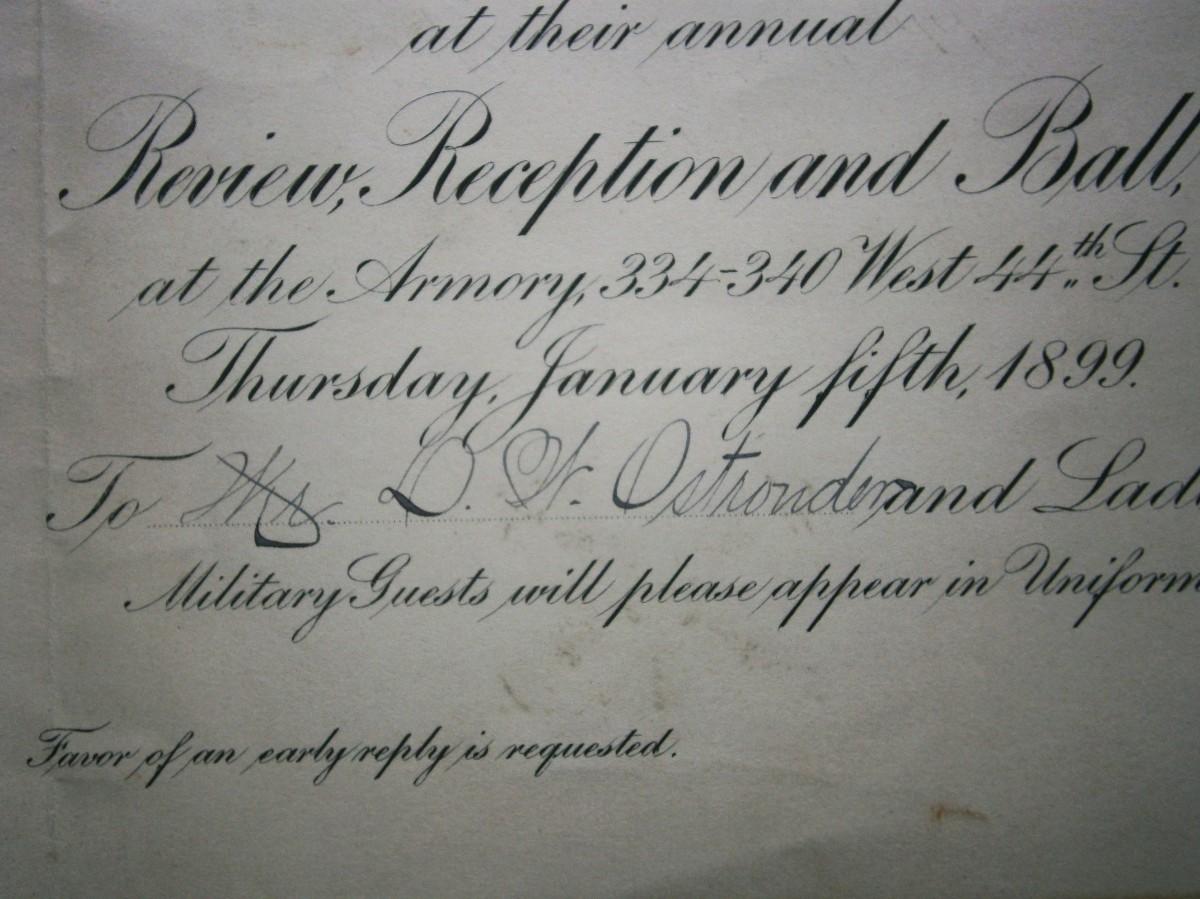 1899 1st Battery, NJ NY Invitation to Ball by Capt. Lewis Wendel to Mr. D. W. Ostronder, Capt. Wendel was later convicted of padding the military books, died in 1914.