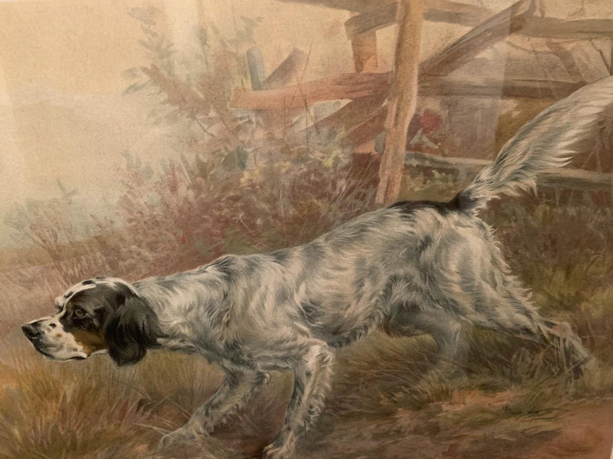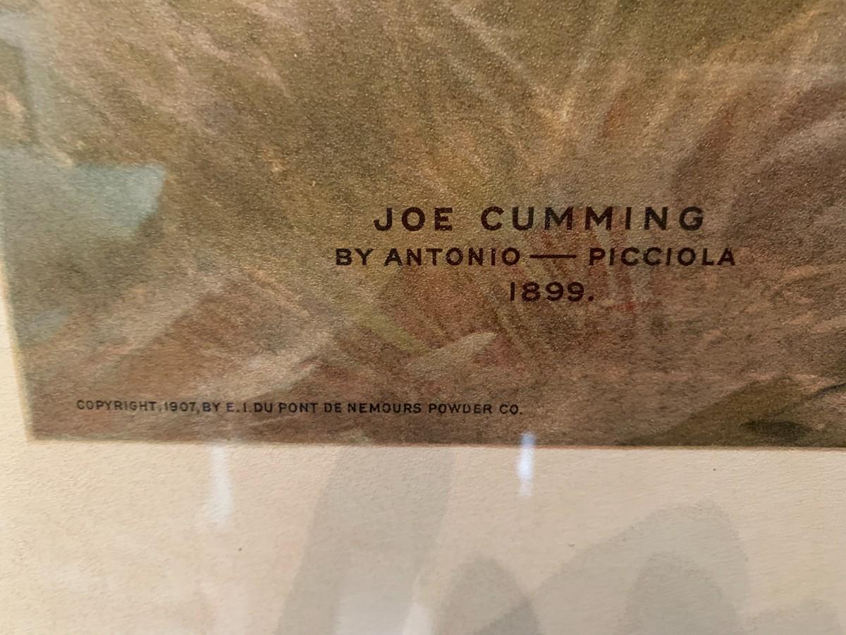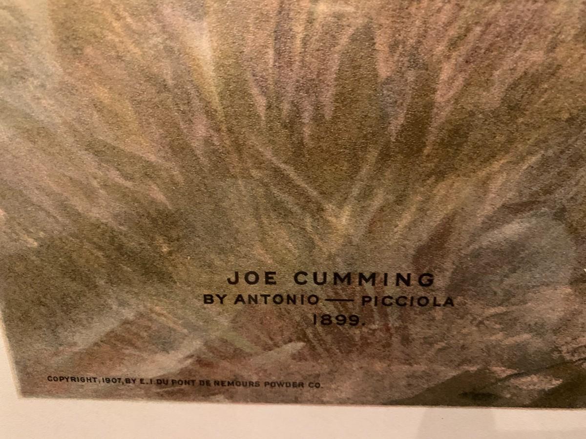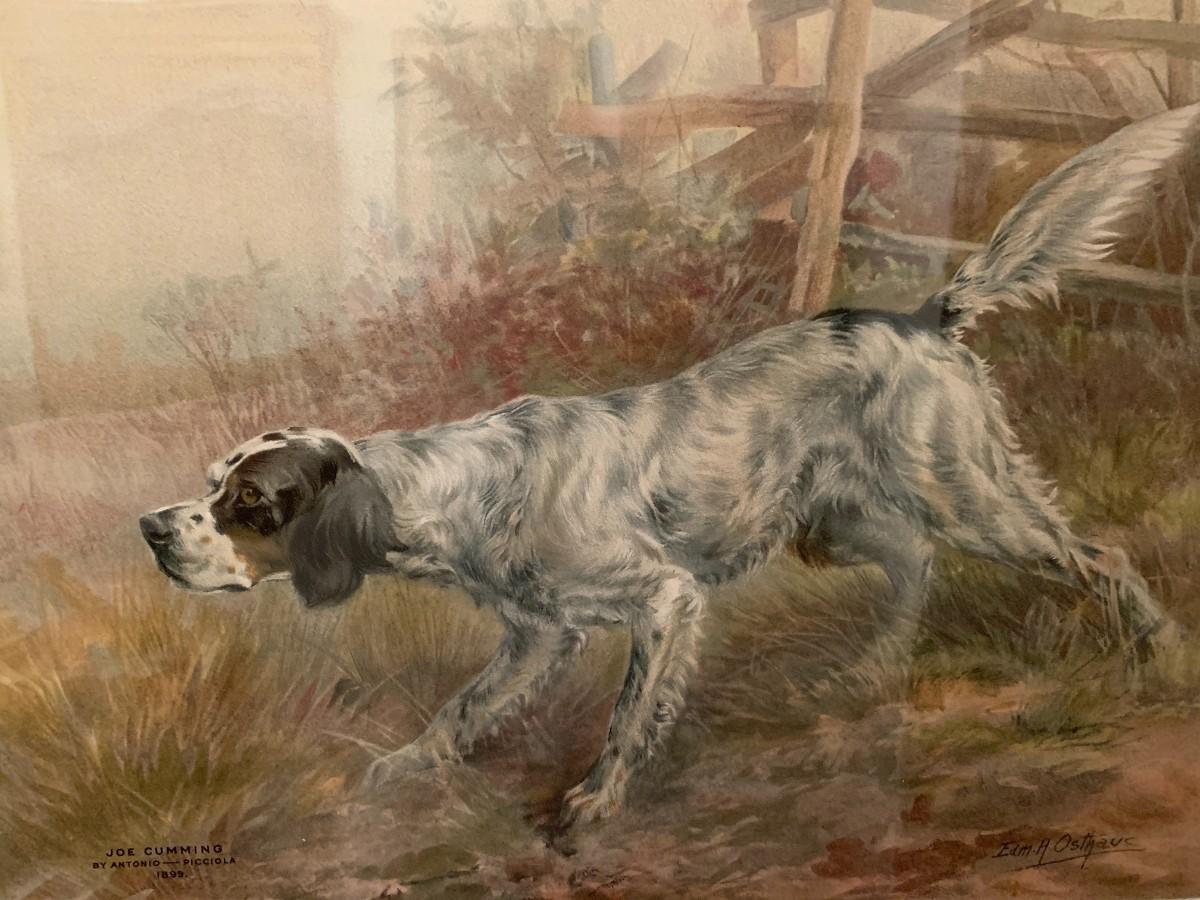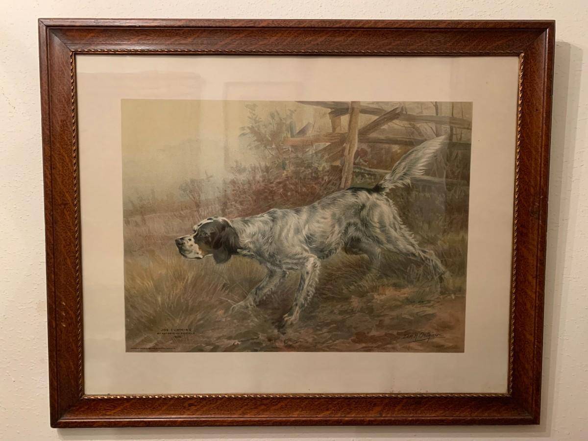 Antique Edmond H. Osthaus hunting dog lithograph signed by artist Edm. H. Osthaus. Titled "Joe Cumming by Antonio-Picciola-1899" In right hand corner is signature of artist. Copyright 1907 by E.F. DuPont De Memours Powder Co. Item is excellent condition. Frame appears to be walnut and upon close examination, has a couple scuffs, otherwise overall condition is SUBERB!