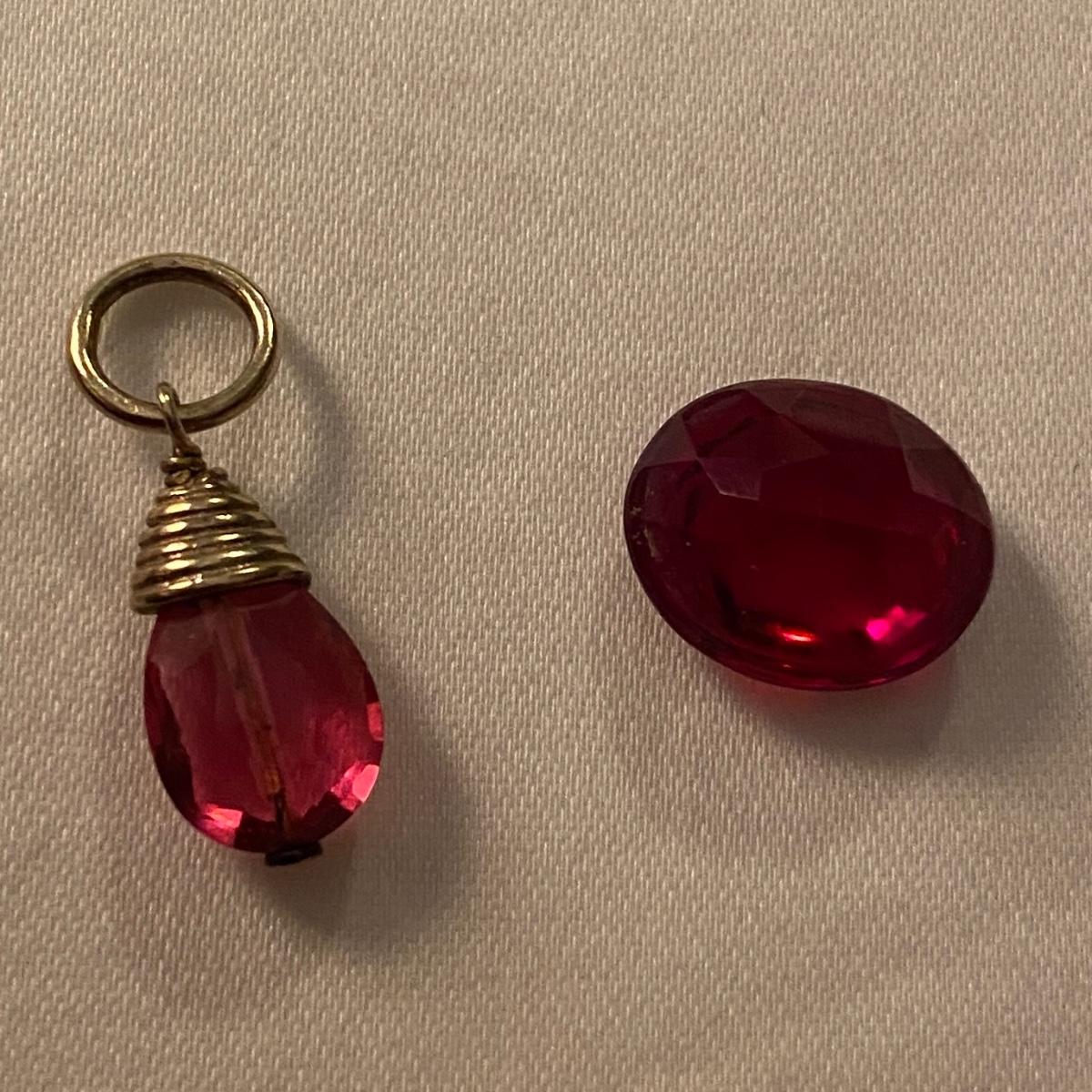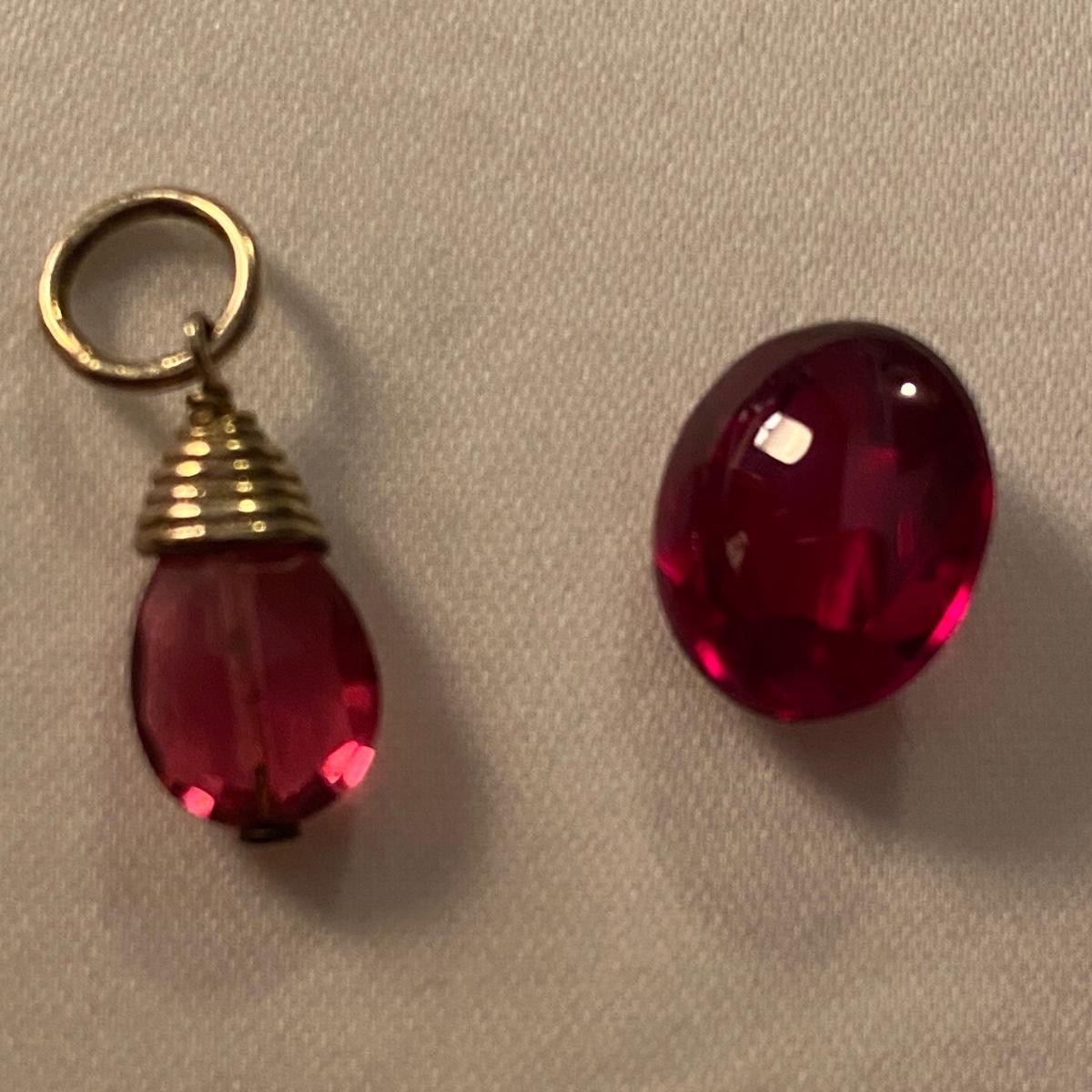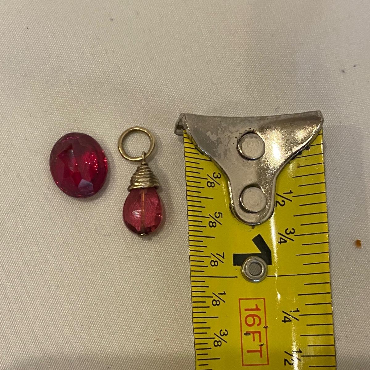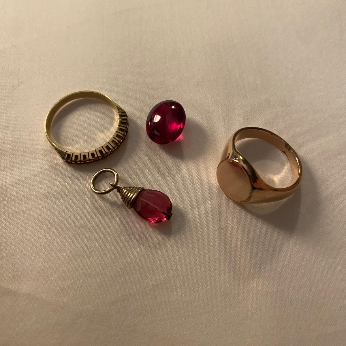 Ruby colored loose stone, small pendant and Ruby and gold ring are in this lot as well as a solid gold colored ring (has a few scratches on surface that may need to be buffed out). The Ruby and gold ring appears to be marked 18k. Authenticity is not guaranteed on stone or gold so please come to preview or to test for yourself or bid accordingly. Shipping available.