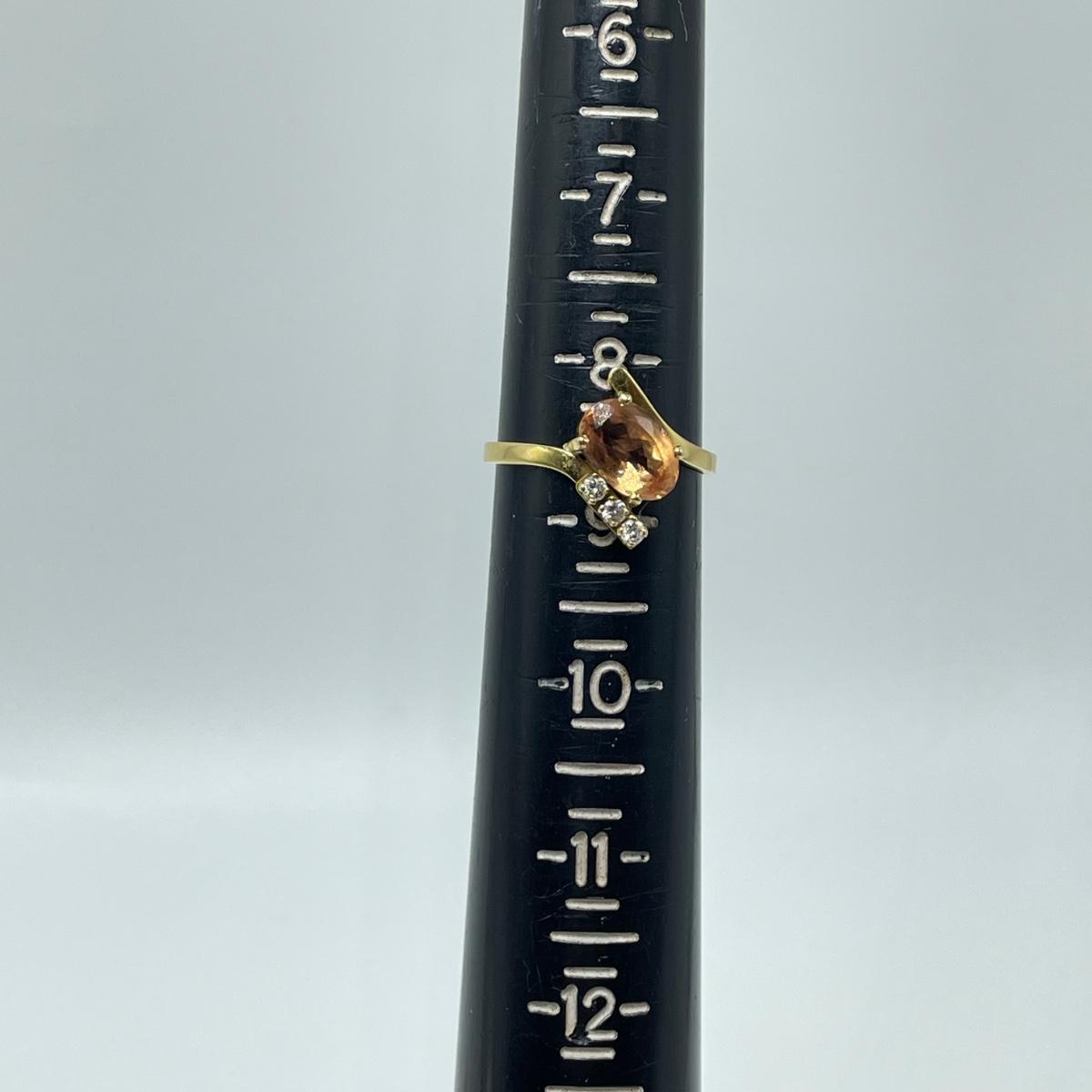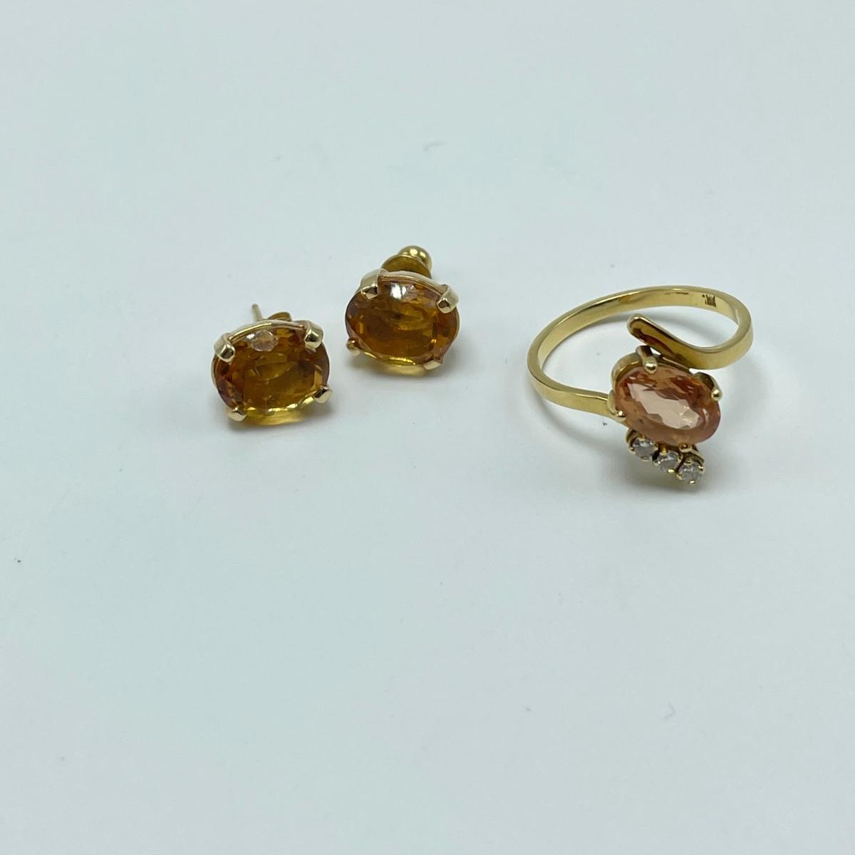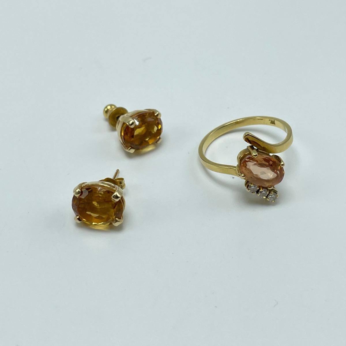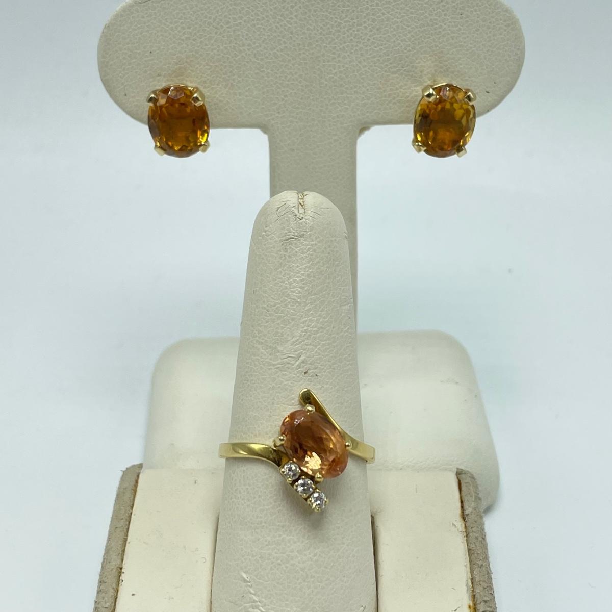 Lot includes a gold ring marked 18k with a citrine-colored stone and three small moissanite stone. Also includes a pair of gold-colored earrings with citrine-colored stones. No known markings on the earrings. All sales are final. No returns or refunds. Please bid accordingly.