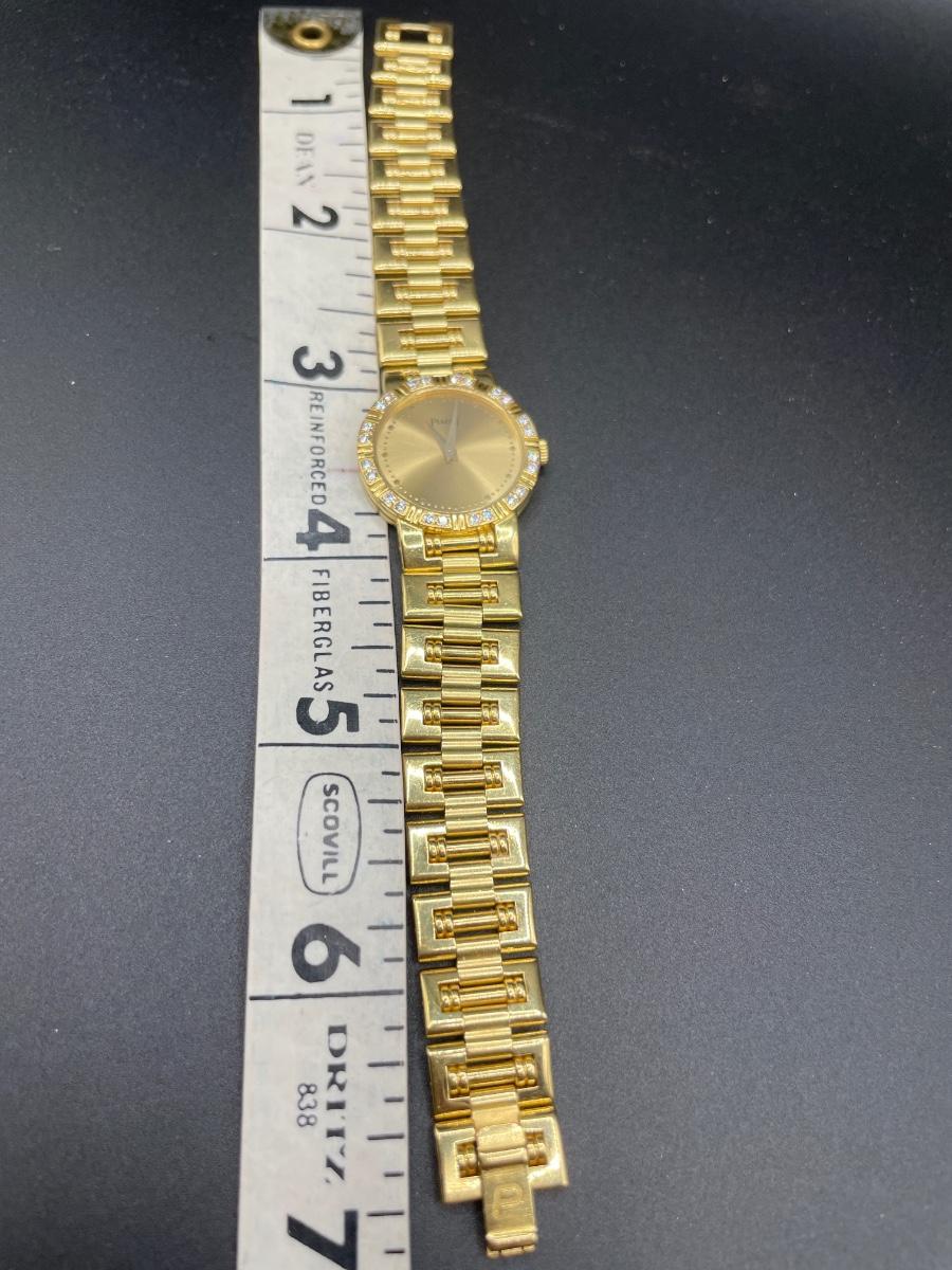 Stunning 18k gold watch w/ a gold tone dial & diamonds on the bezel. This is a timeless classic!