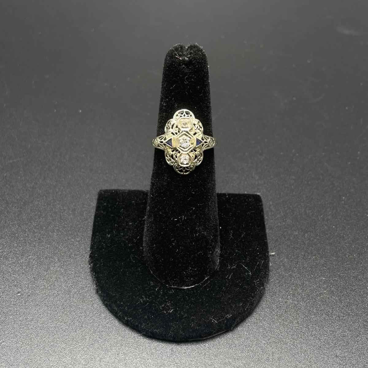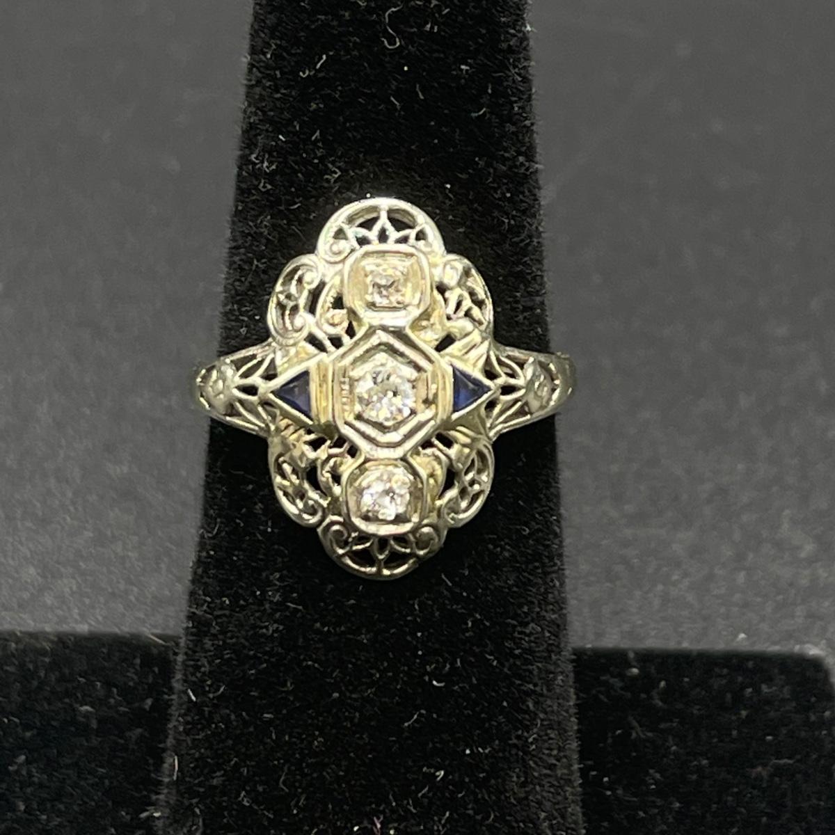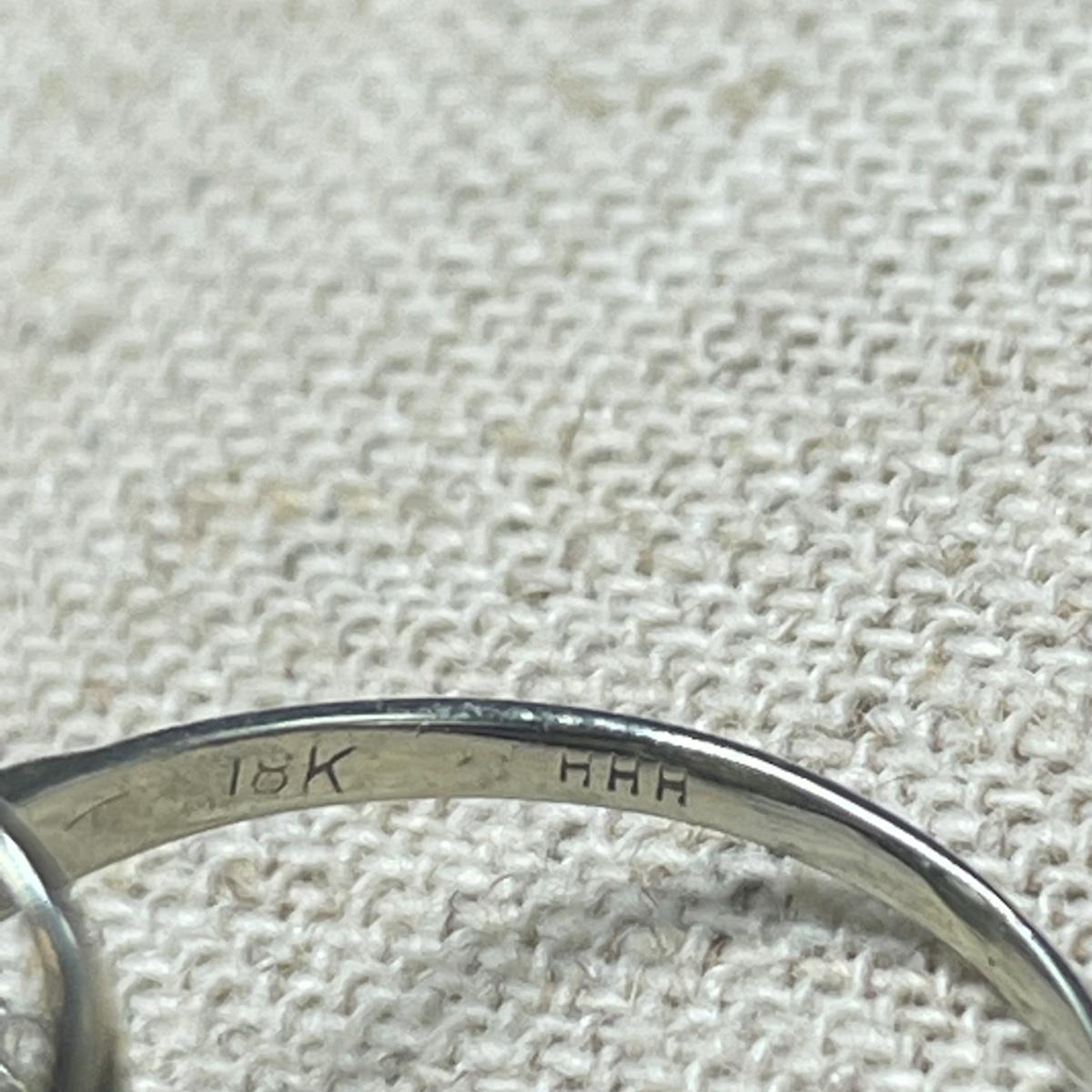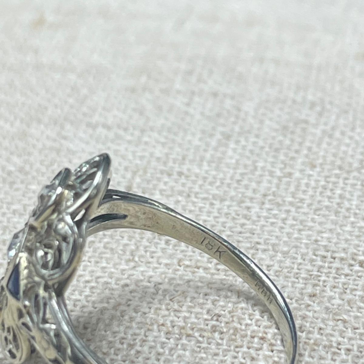 White gold ring marked HHH and 18K. Ring appears to have two triangle gems that appear to be sapphires. The rhinestones do not register on our diamond tester. See images. Shipping available.