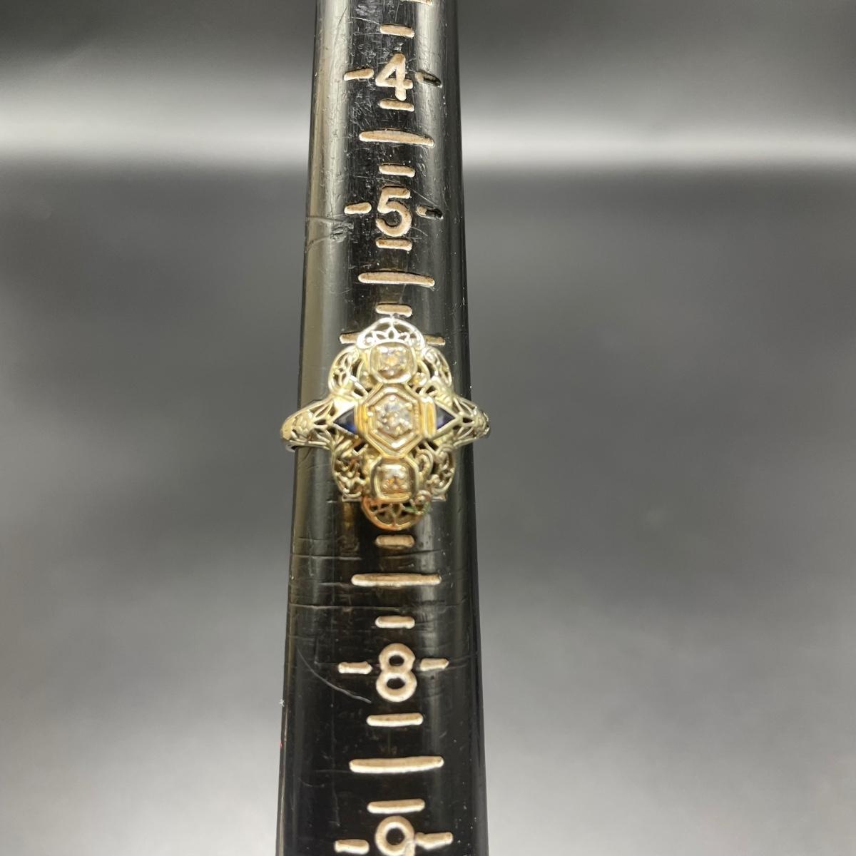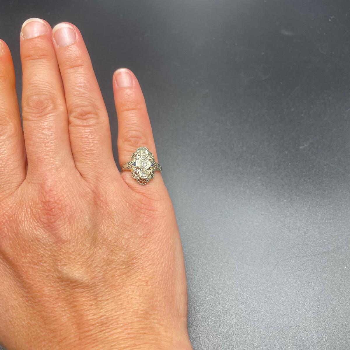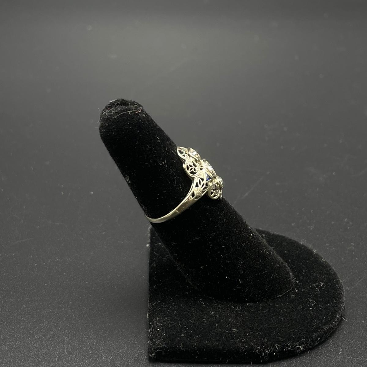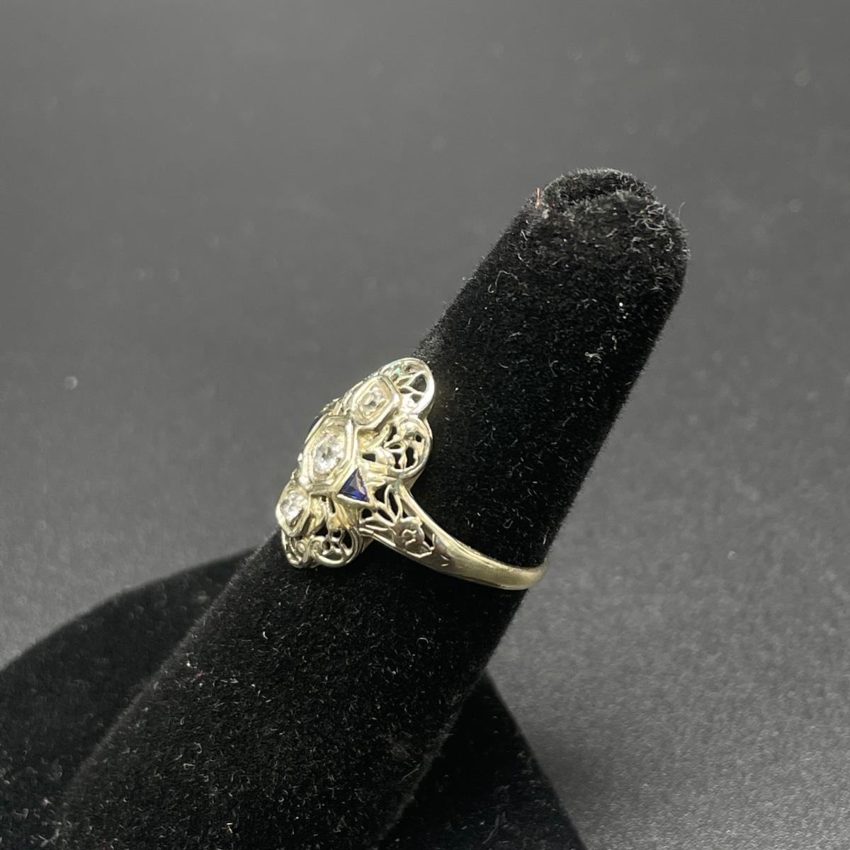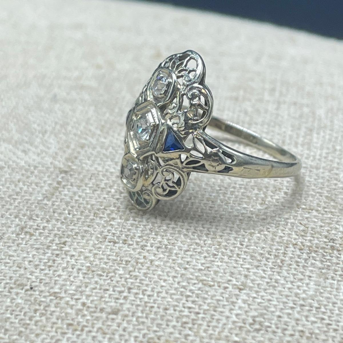 White gold ring marked HHH and 18K. Ring appears to have two triangle gems that appear to be sapphires. The rhinestones do not register on our diamond tester. See images. Shipping available.