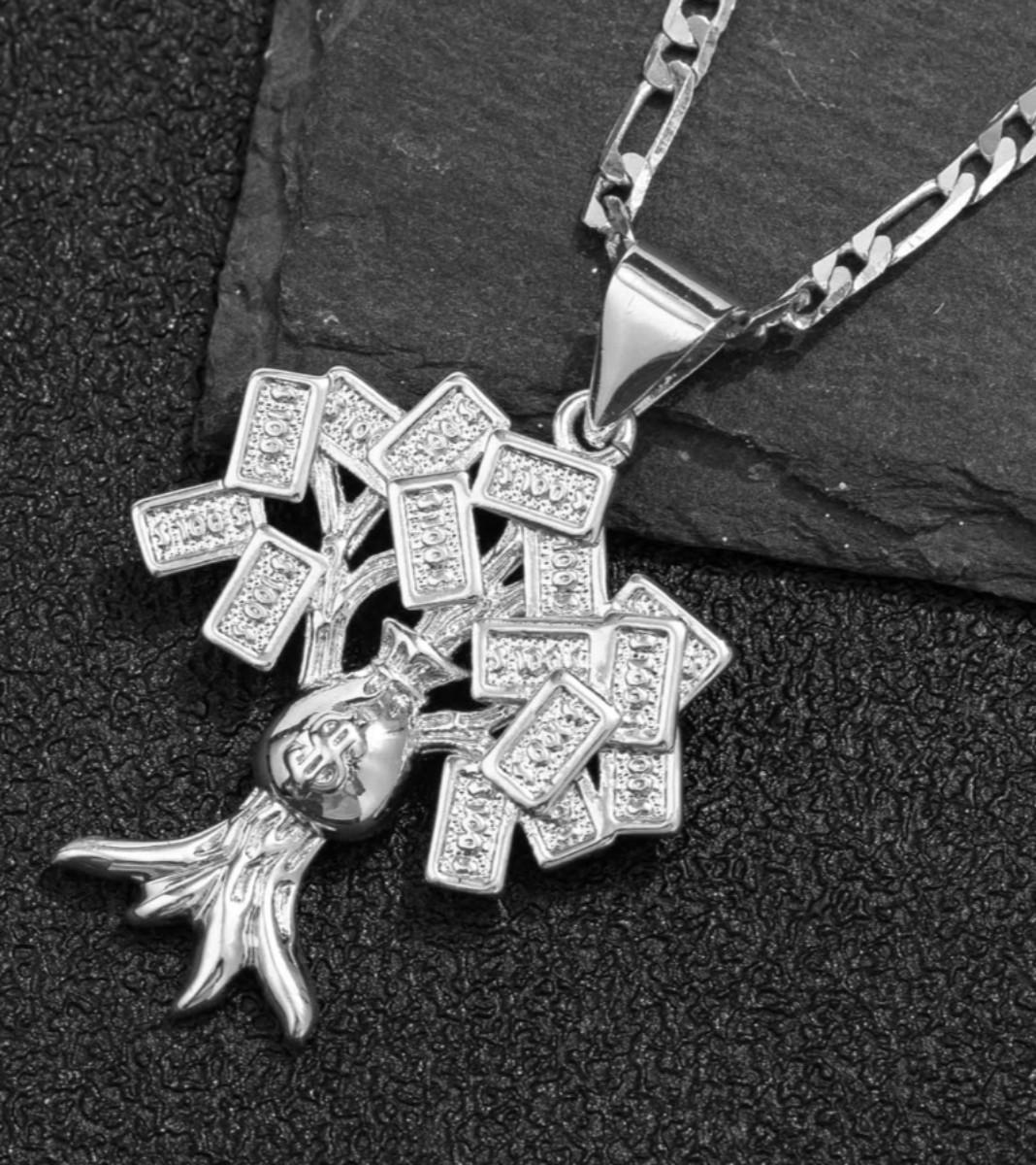 18K white Gold Plated 100 Dollar Bill Tree Pendant Necklace