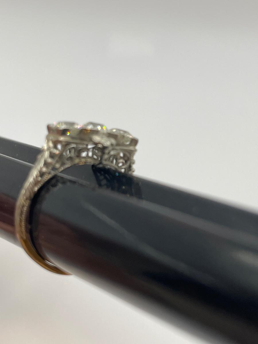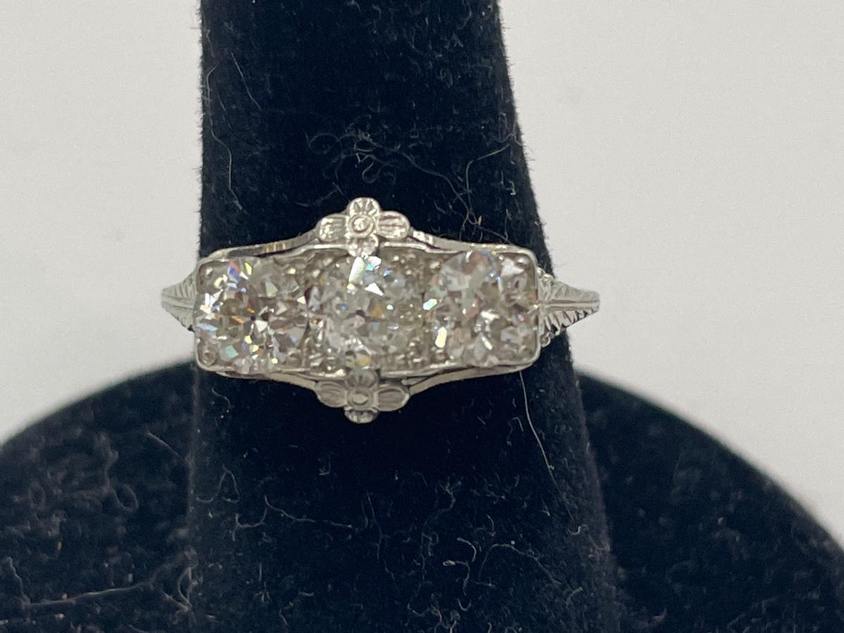 Old European mine cut diamond & 18k white gold 3 stone ring. Each diamond is approximately 1/3 carat each.