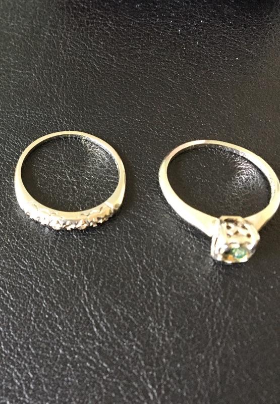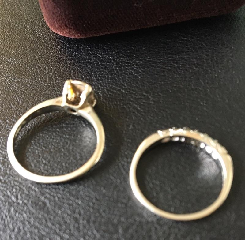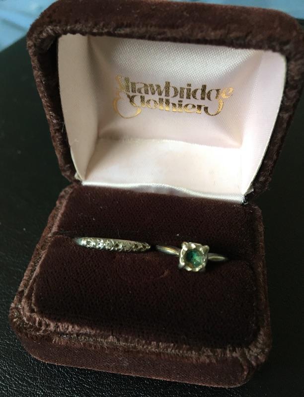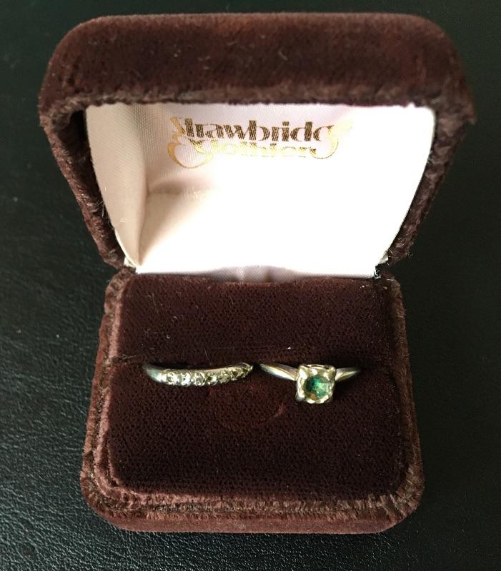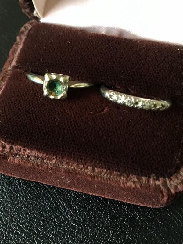 Includes engagement ring, wedding band and box. Will need stones. Weight of both rings is 4.5 grams.