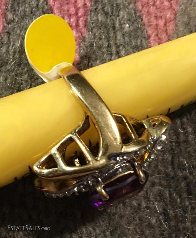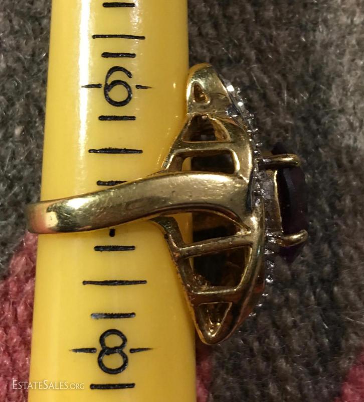 Beautiful amethyst ring marked 18KT HGE. Not positive of the stones, ring weighs 12.5 grams.