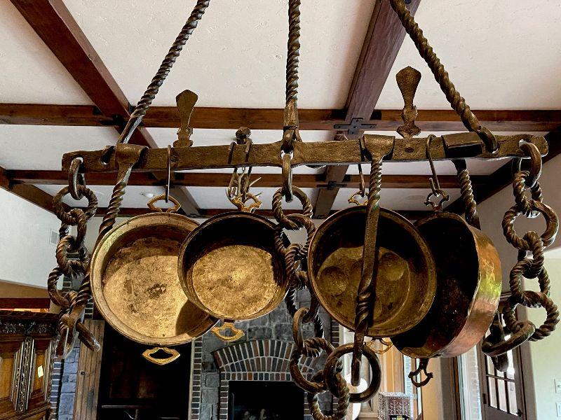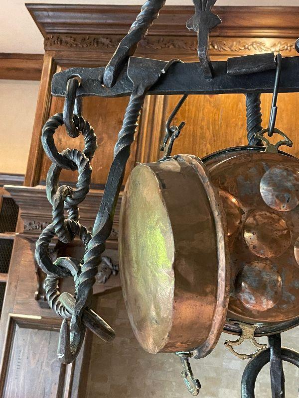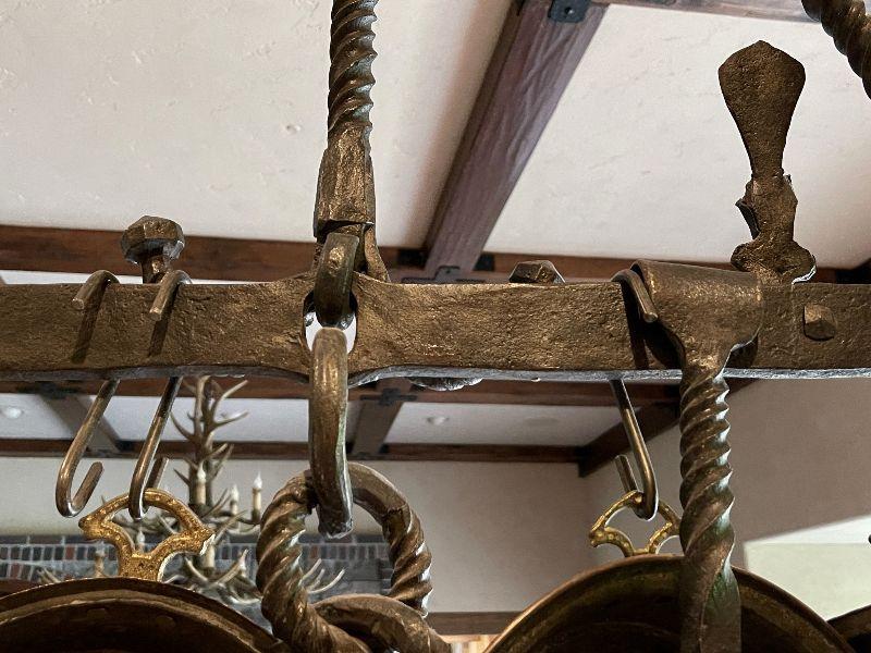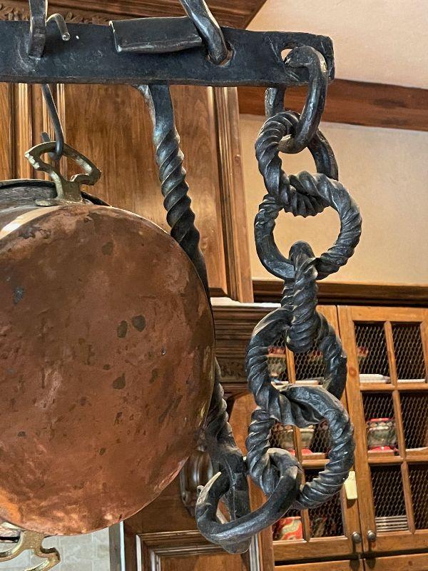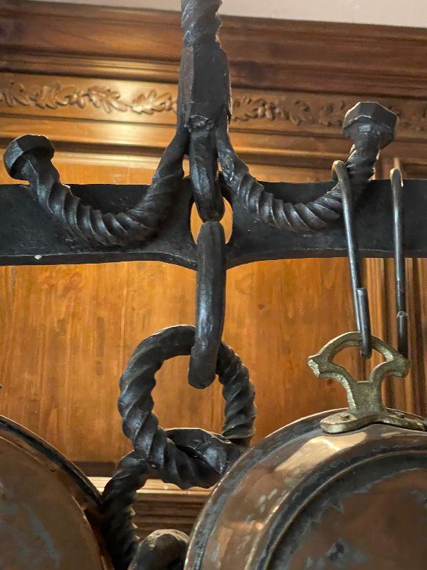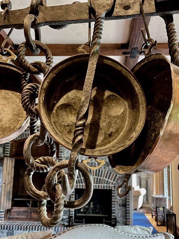 The subject item is a truly unique and rare rack designed to hang in the monumental fireplace of a chateau kitchen, providing convenient access to copper pots, pans, and various cooking vessels. All hand forged with fancy twist-iron frame and and dresses with hanging loops and hooks.