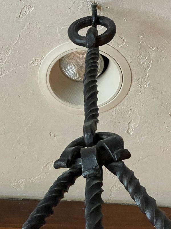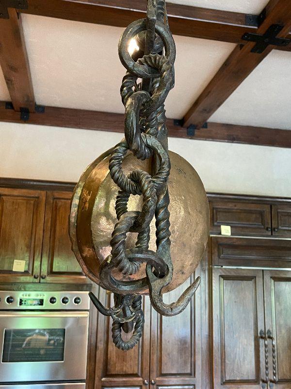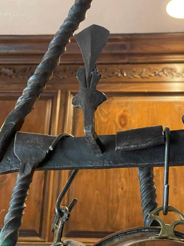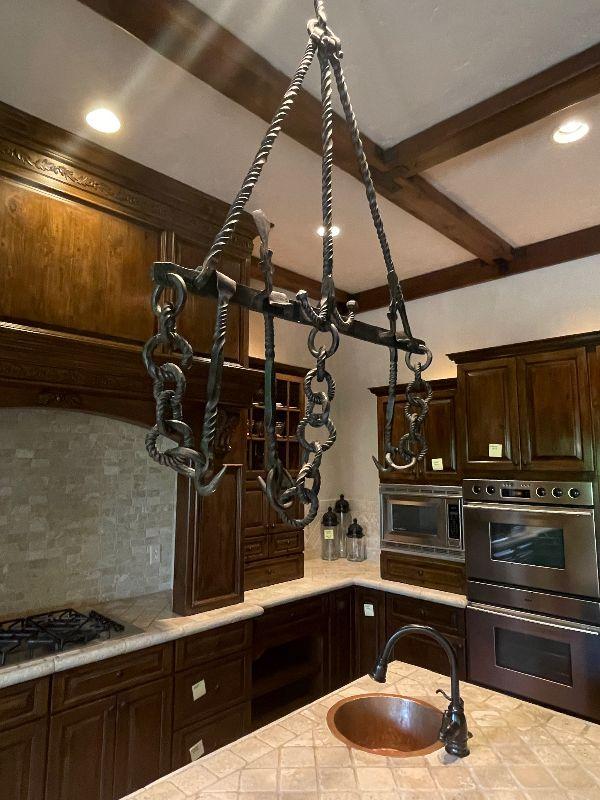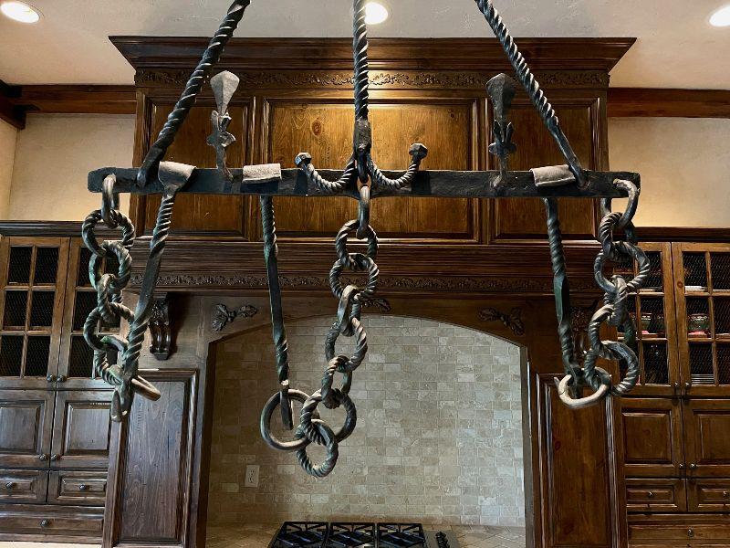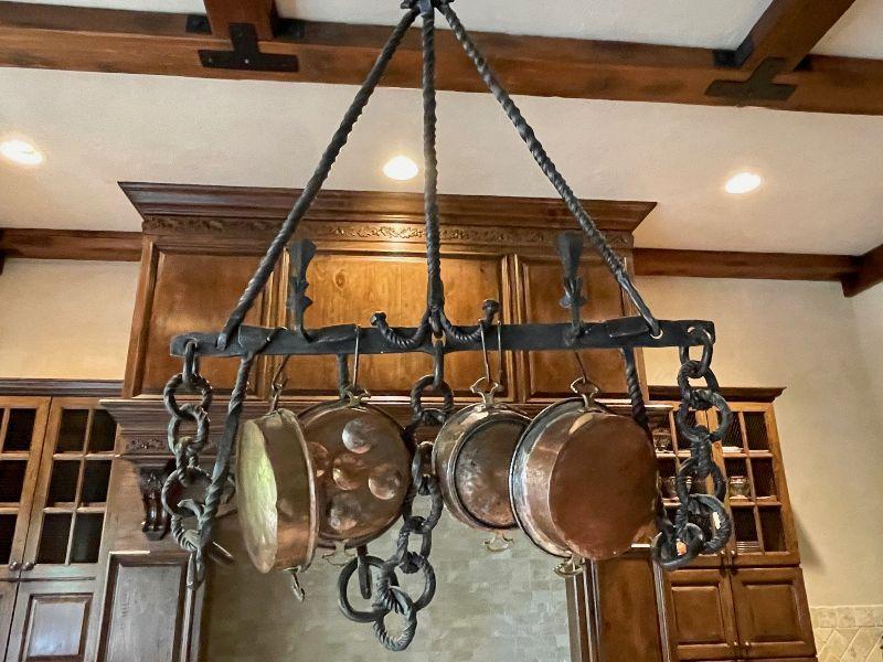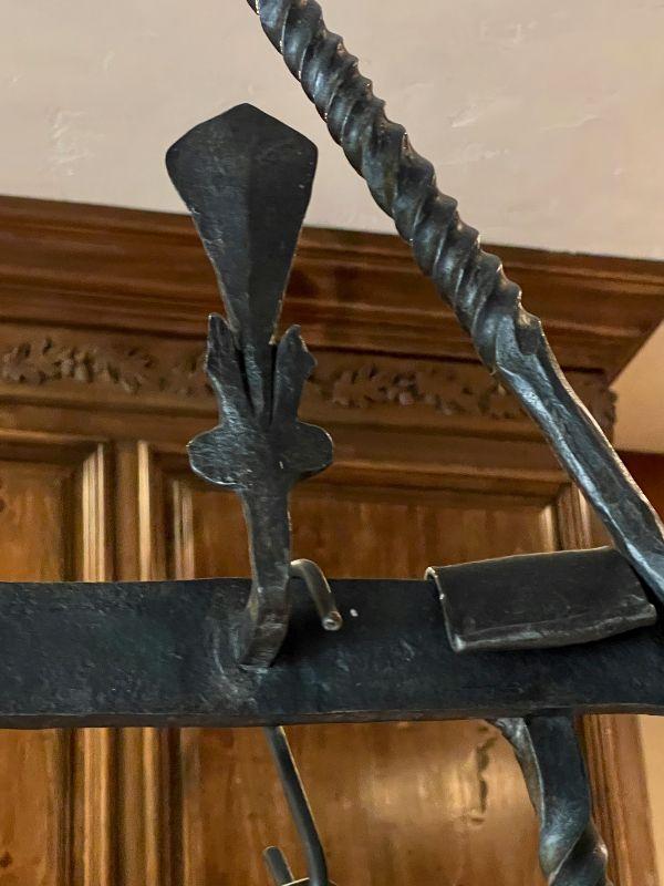 The subject item is a truly unique and rare rack designed to hang in the monumental fireplace of a chateau kitchen, providing convenient access to copper pots, pans, and various cooking vessels. All hand forged with fancy twist-iron frame and and dresses with hanging loops and hooks.