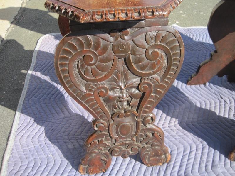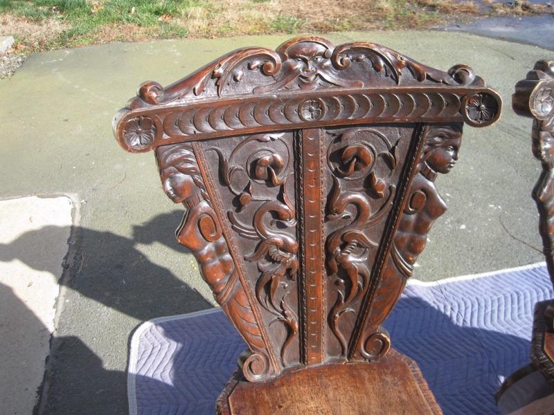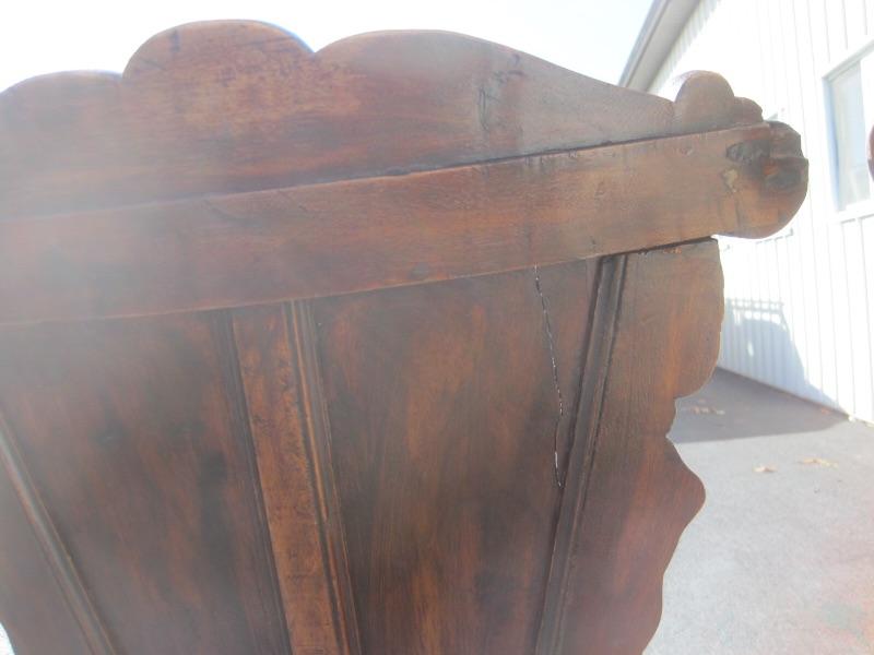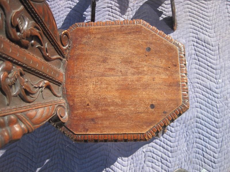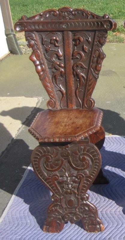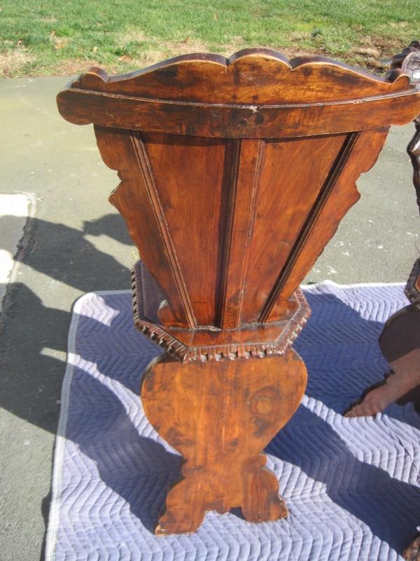 A wonderful 18th century Italian carved walnut Sgabello chair. The entire surface is covered with boldly carved decoration from top to bottom.