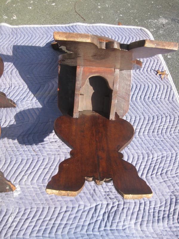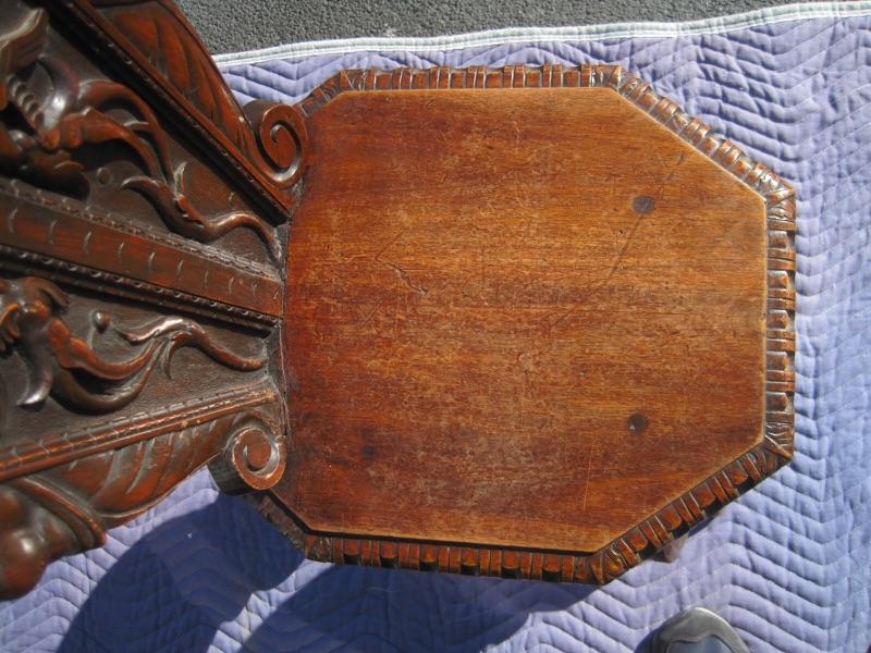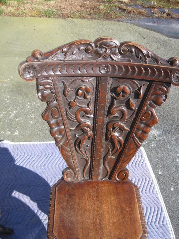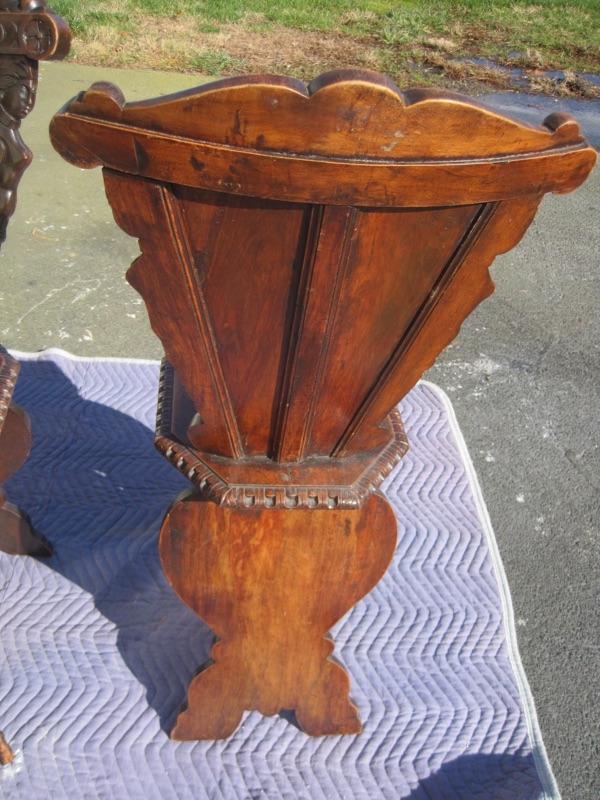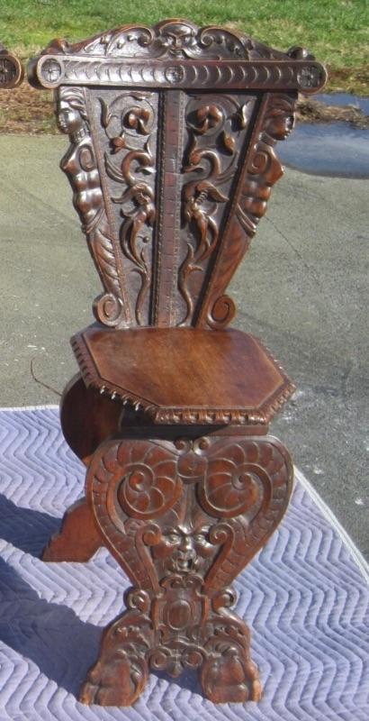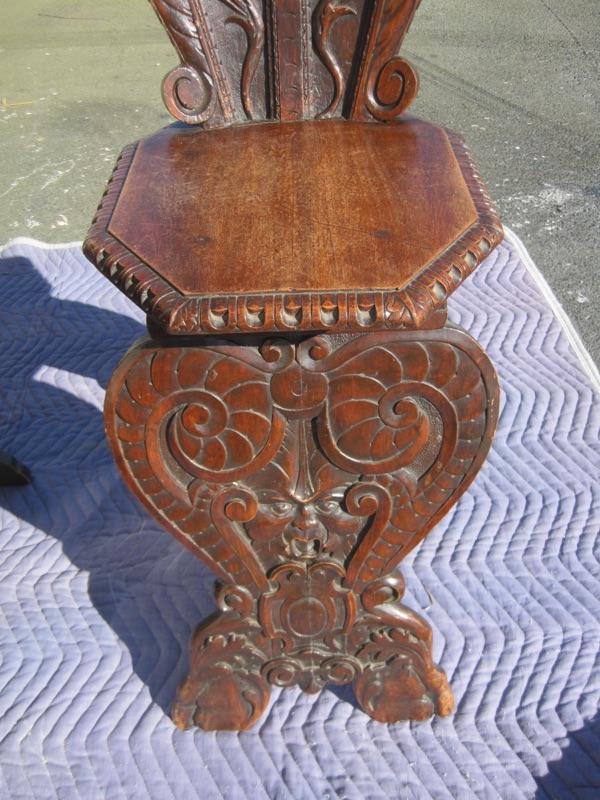 A wonderful 18th century Italian carved walnut Sgabello chair. The entire surface is covered with boldly carved decoration from top to bottom. There are some wear marks and scratches on it, which is typical for chairs of this age. The chair is about 41" tall and 21" wide at the top. Packaging and shipping is available.
