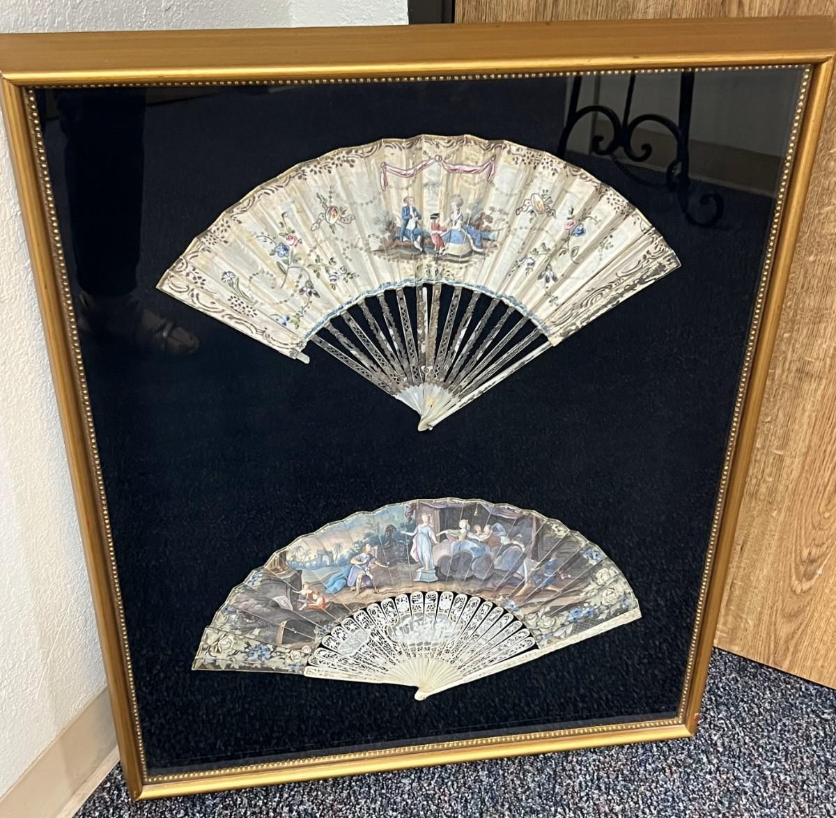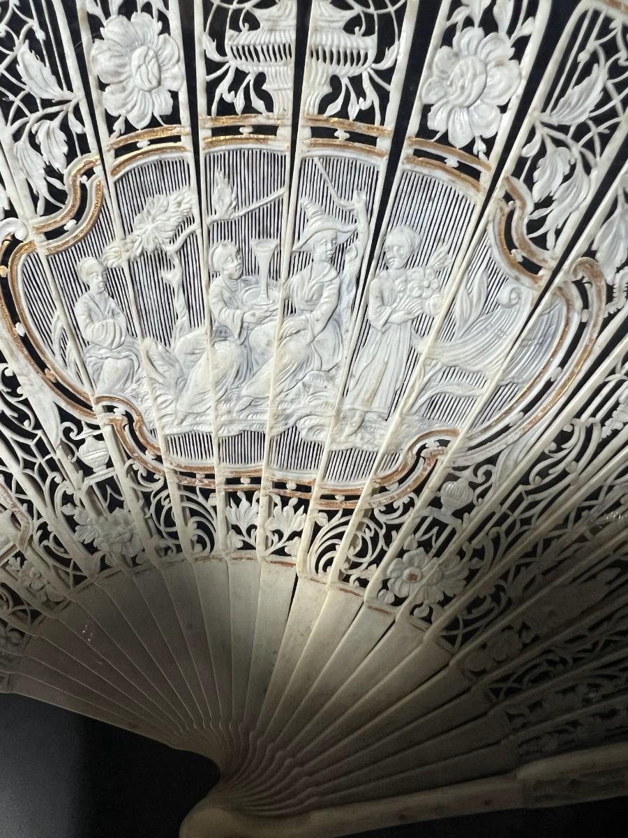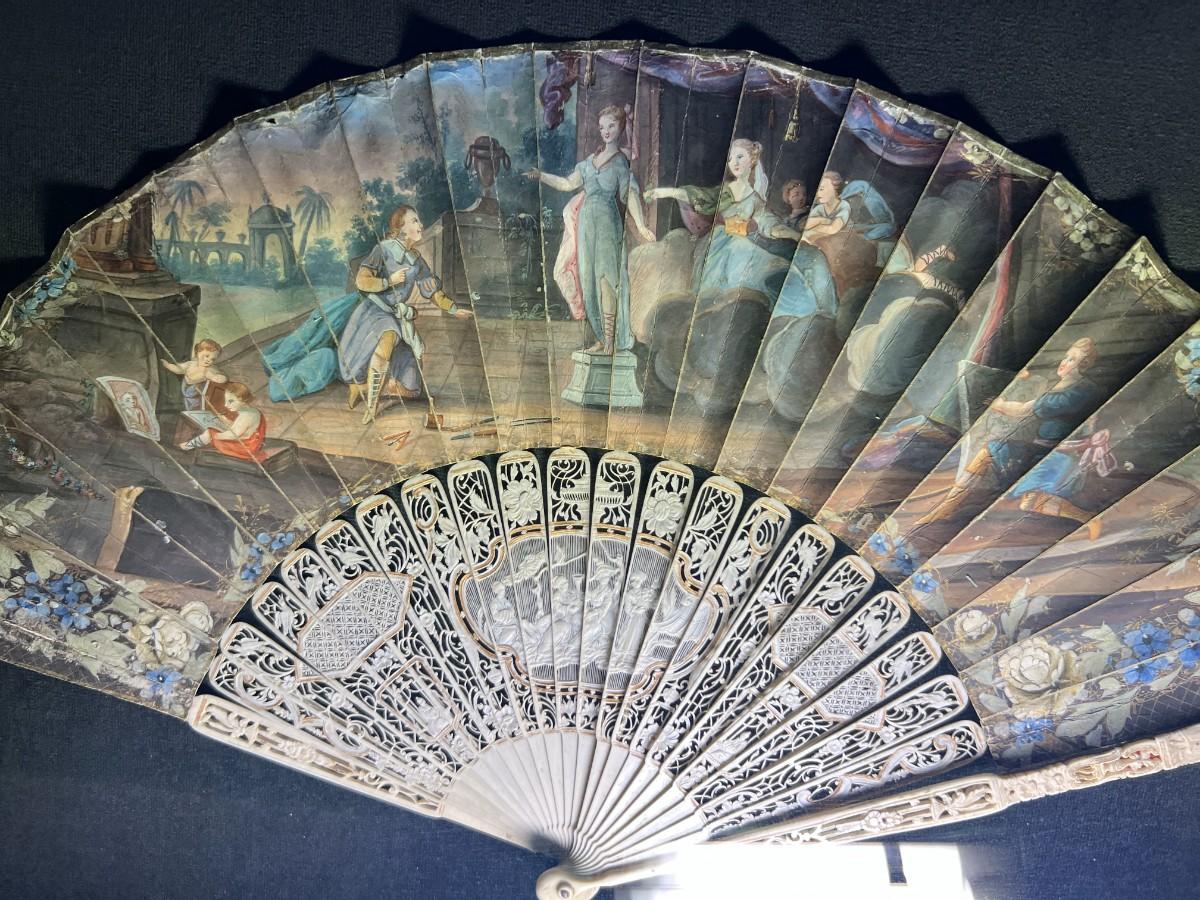 The French fan features an oval cartouche with what appears to be a classical scene, possibly depicting Diana and Endymion, a common motif in 18th century fan art, often found in significant collections like the Royal Collection. The use of materials like ivory and mother of pearl, along with detailed carving and painting, suggests it was a luxury item. You see this type of carving on Cameos.