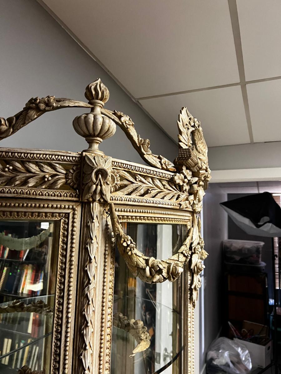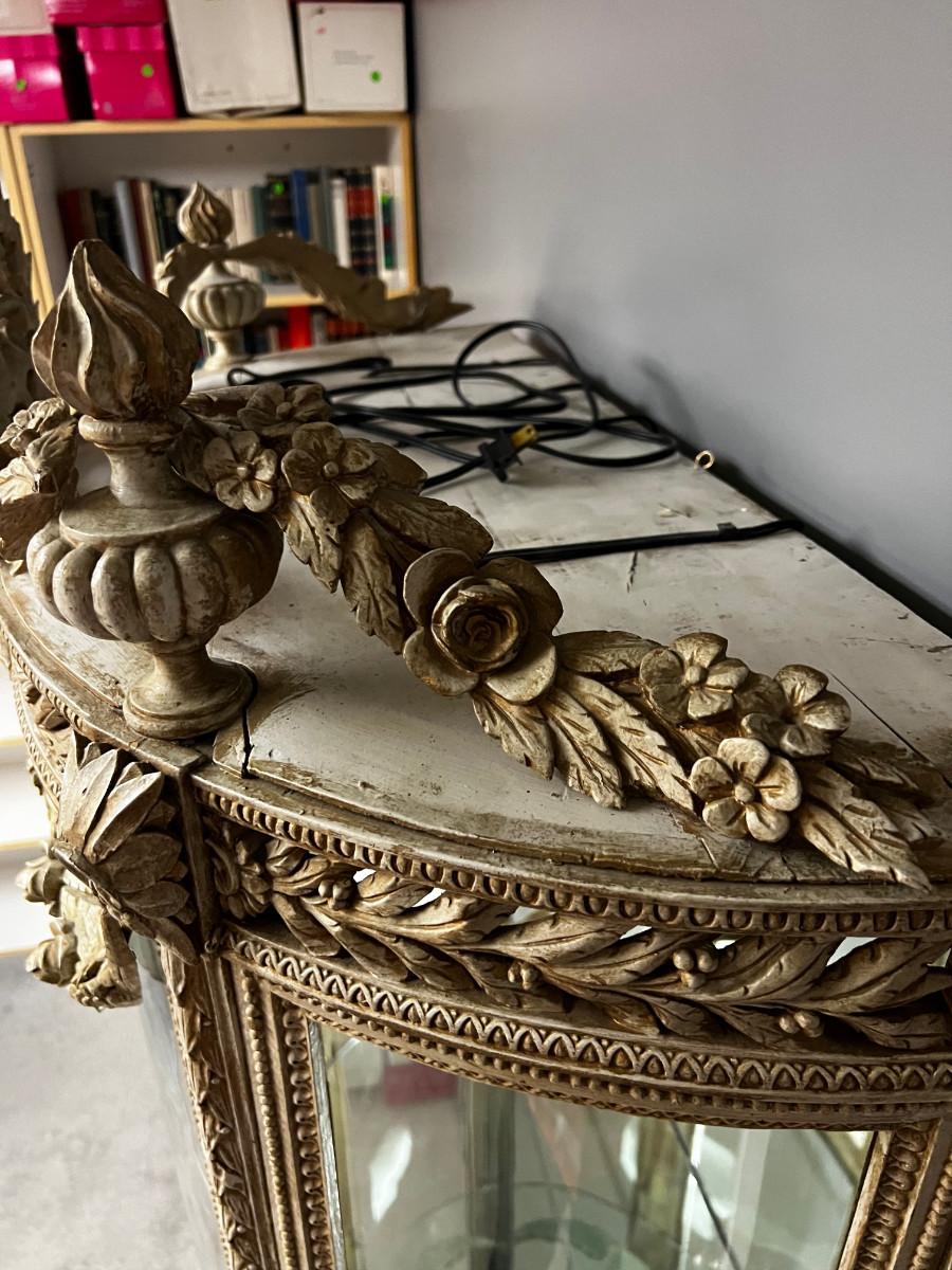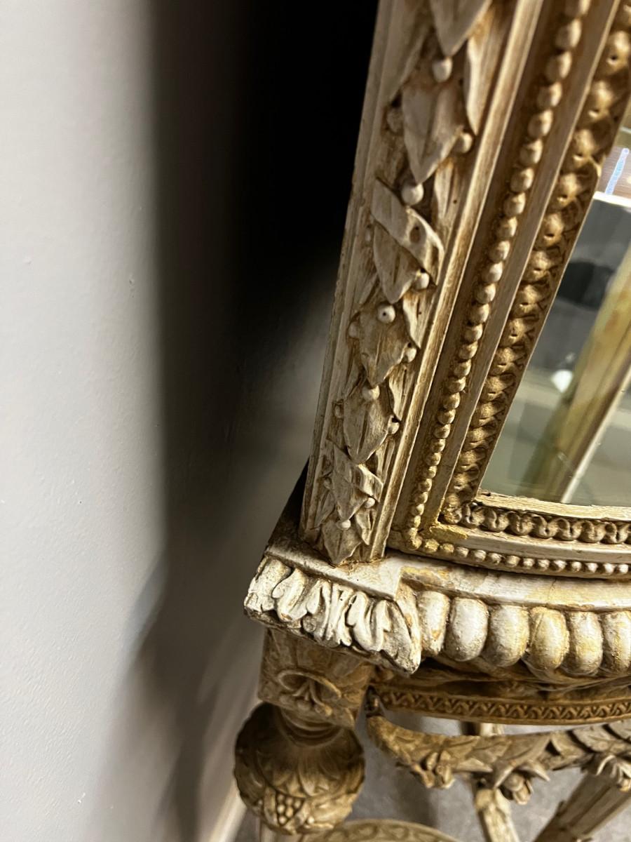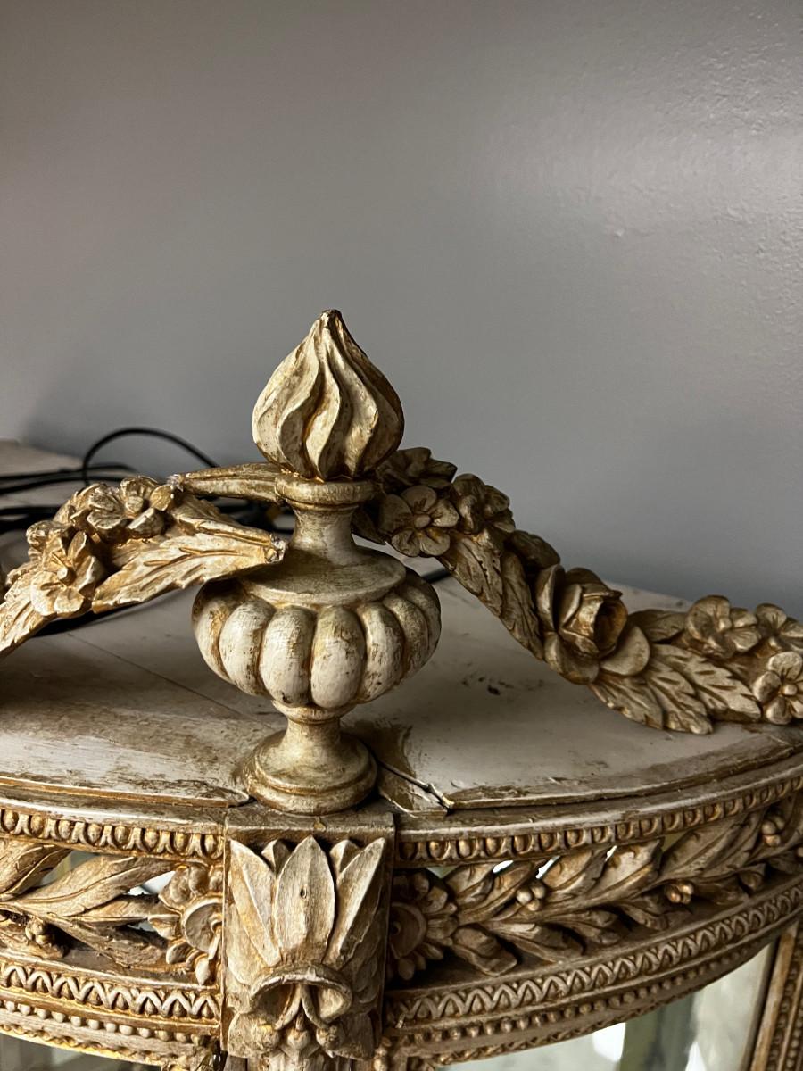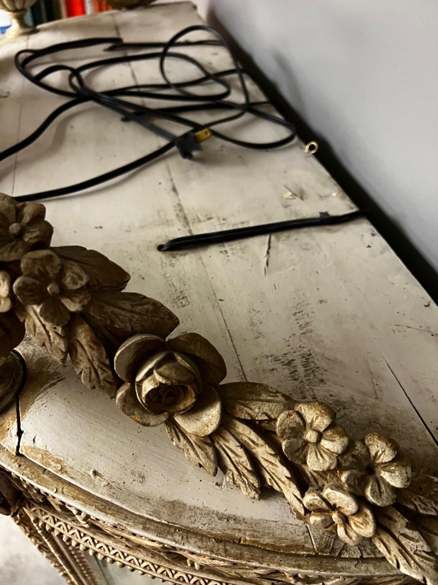 2 Pieces with detachable swag, carved, detailed Wood. Incredible! Mirrors and Lighting added after the fact! Measures: 79" High X 21" Deep X 42" Across. Gesso paint taupe tone over white. Very unique item. Probably one of the oldest items we have sold at auction !!!