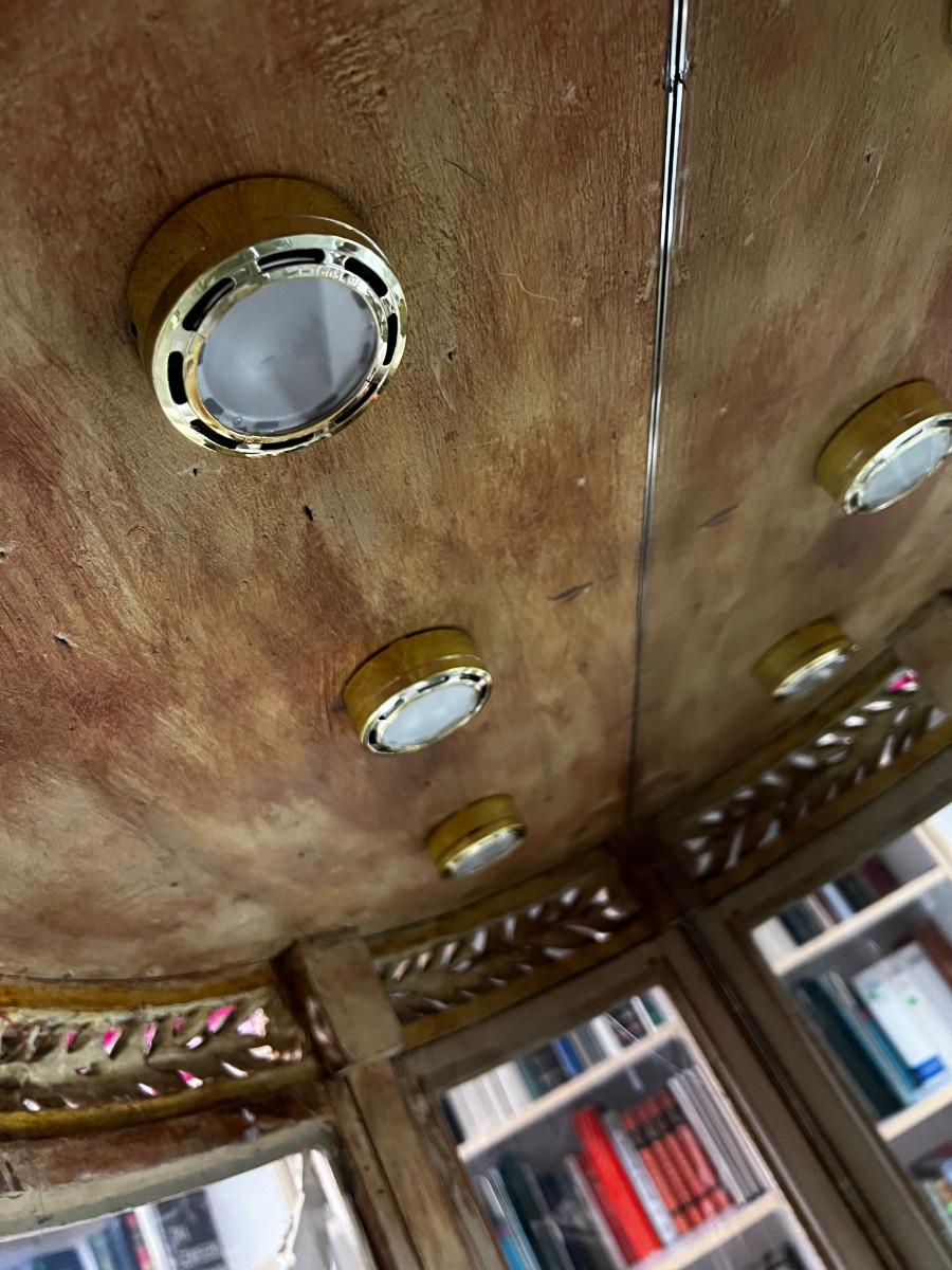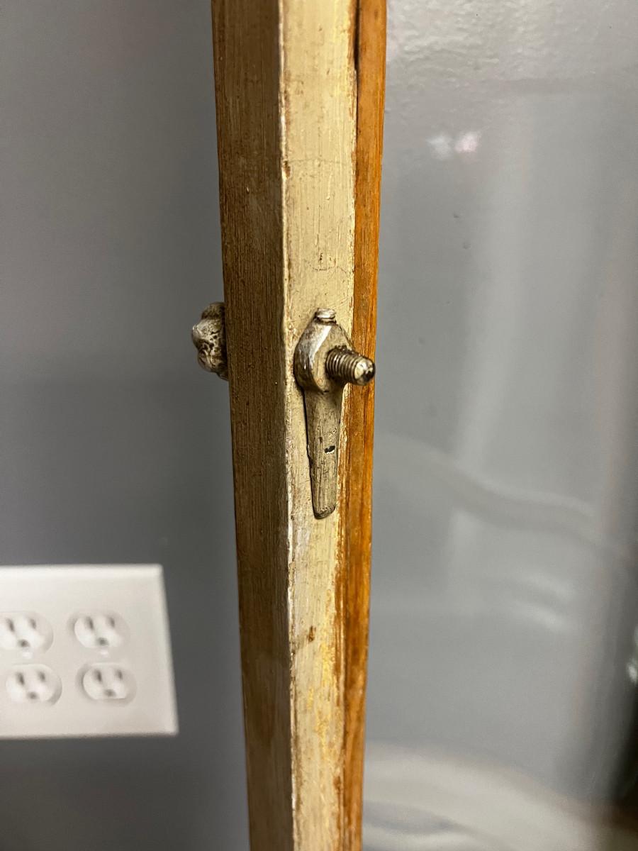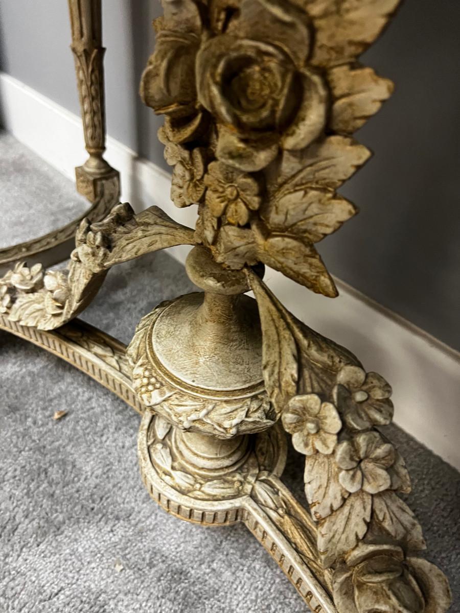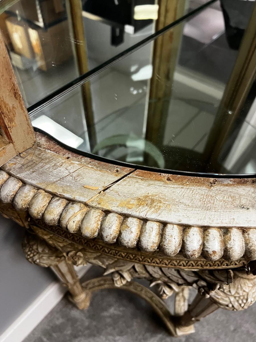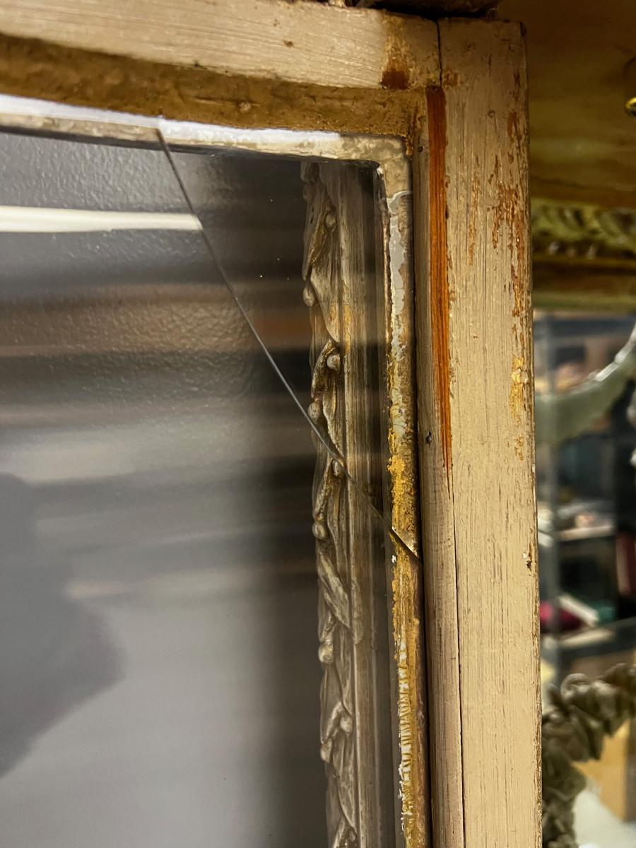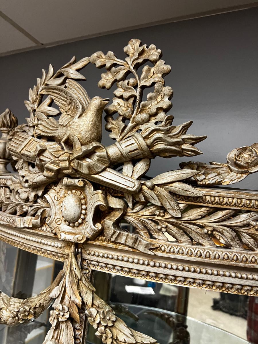 2 Pieces with detachable swag, carved, detailed Wood. Incredible! Mirrors and Lighting added after the fact! Measures: 79" High X 21" Deep X 42" Across. Gesso paint taupe tone over white. Very unique item. Probably one of the oldest items we have sold at auction !!!