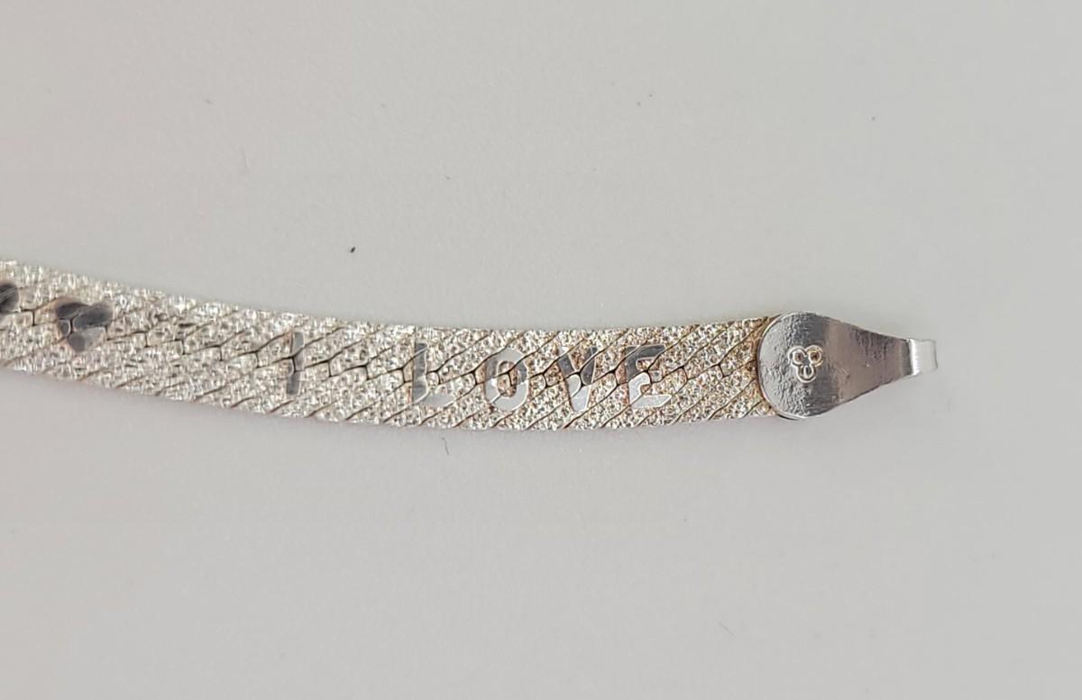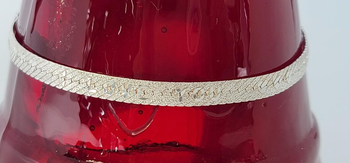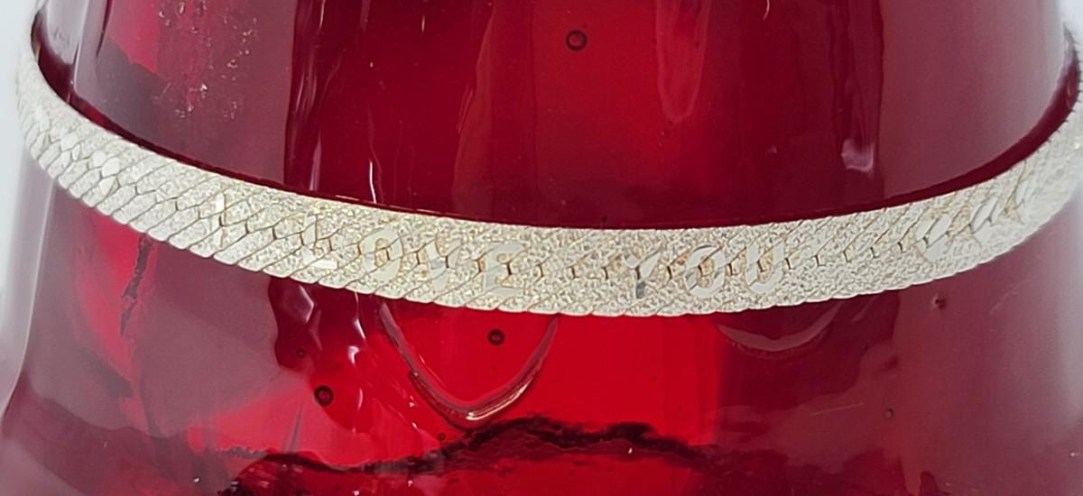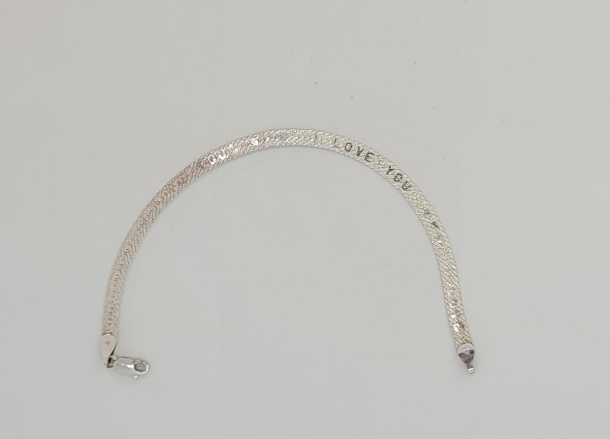 Herringbone Sterling Silver Bracelet with Hearts and the words I Love You.
