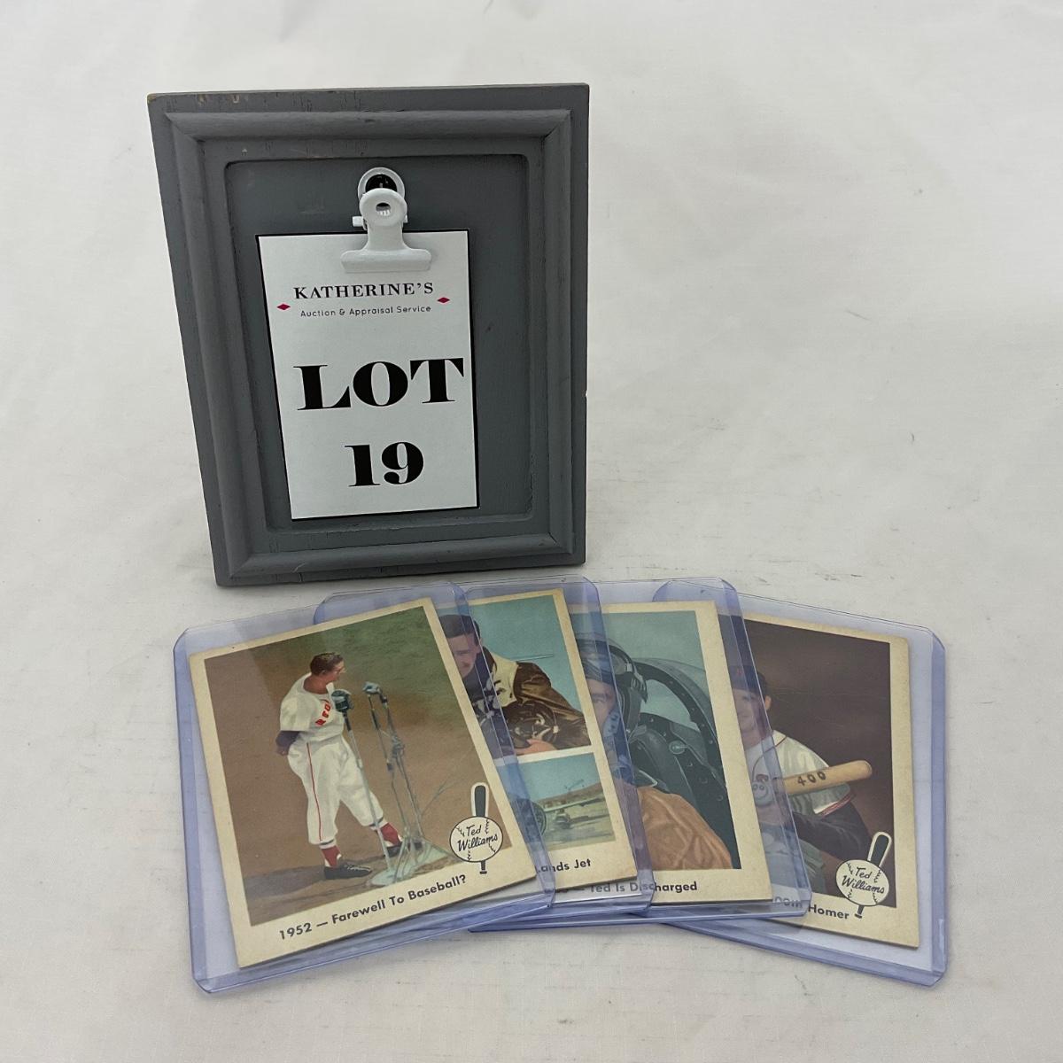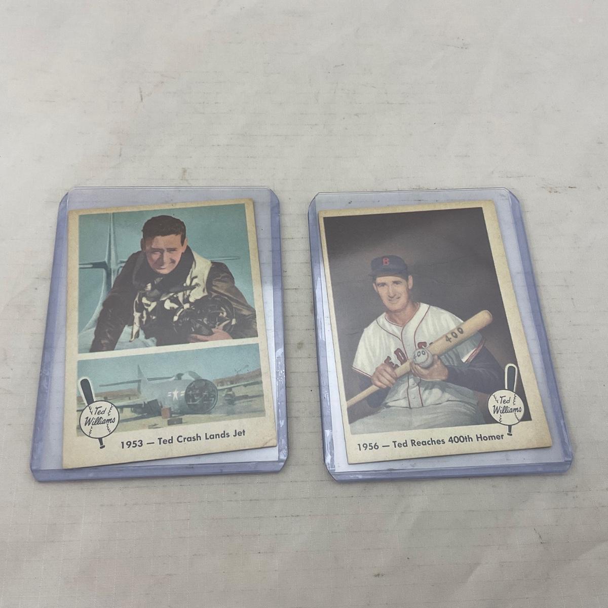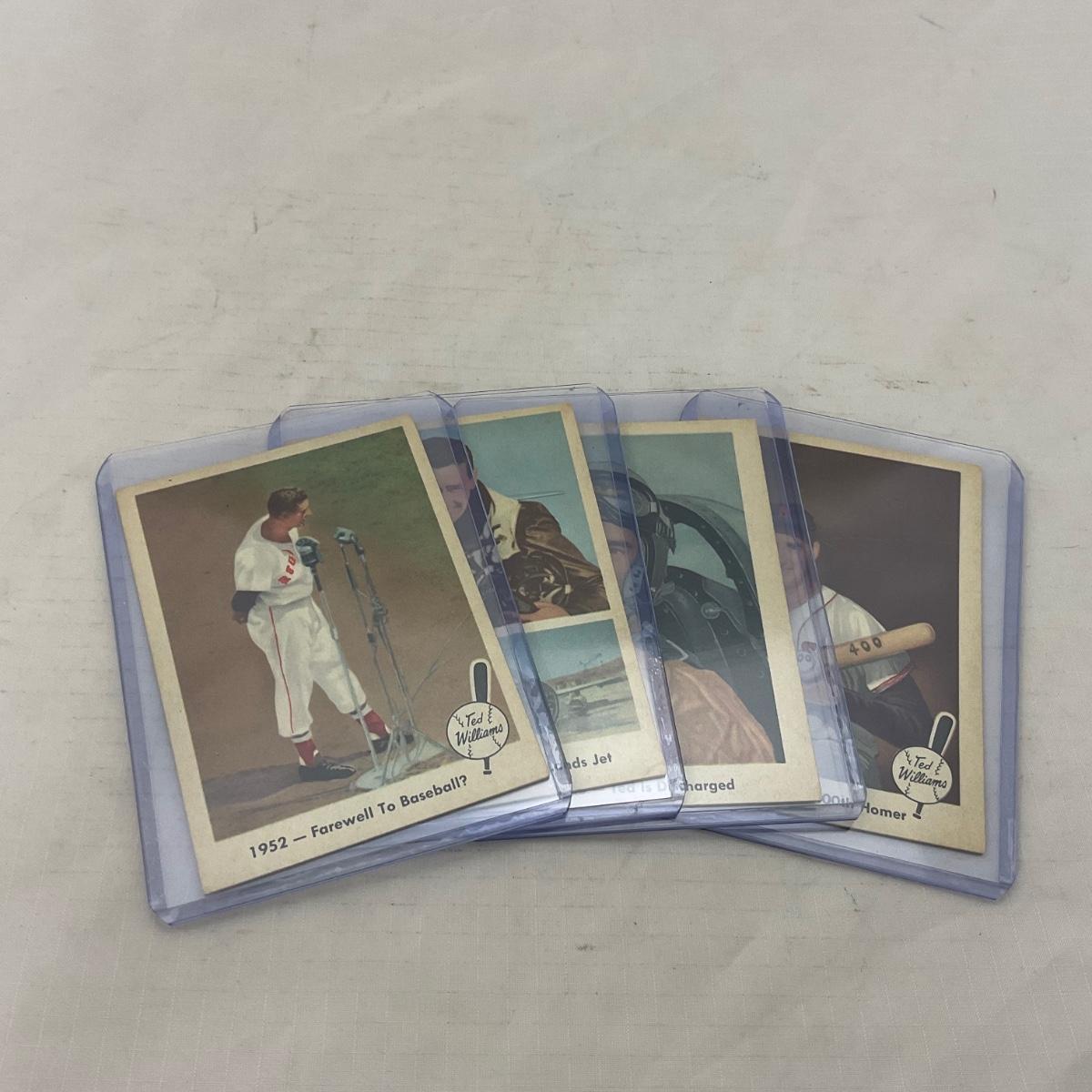 Collection of four 1959 FLEER Ted Williams vintage Baseball cards. Cards come with the sleeves as pictured. Please see photos for details and condition. ::: Shipping is available on this lot. If you require shipping you must let us know at the close of the auction. We will coordinate with you after the item has been won. Shipping fees will include insurance up to or exceeding the value of all items being mailed. If you have any questions regarding this lot please contact the auctioneer either via this website, by direct email or by phone. PICK UP TIMES and other important information can be found in the TERMS and DESCRIPTION of the auction. Please take a look for pertinent information. Thanks!