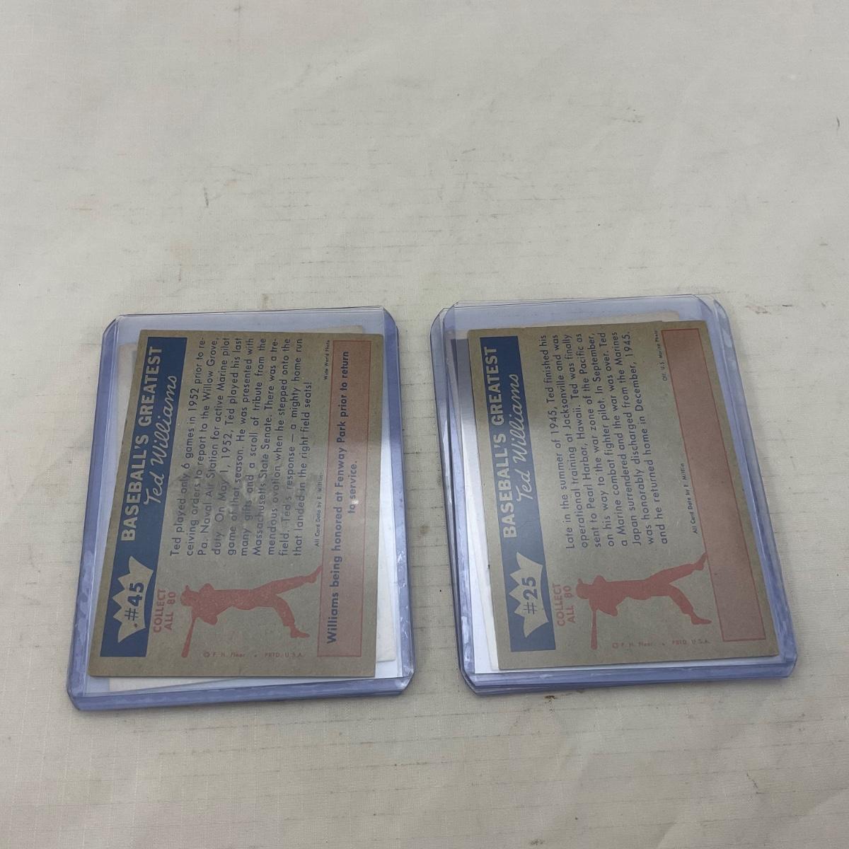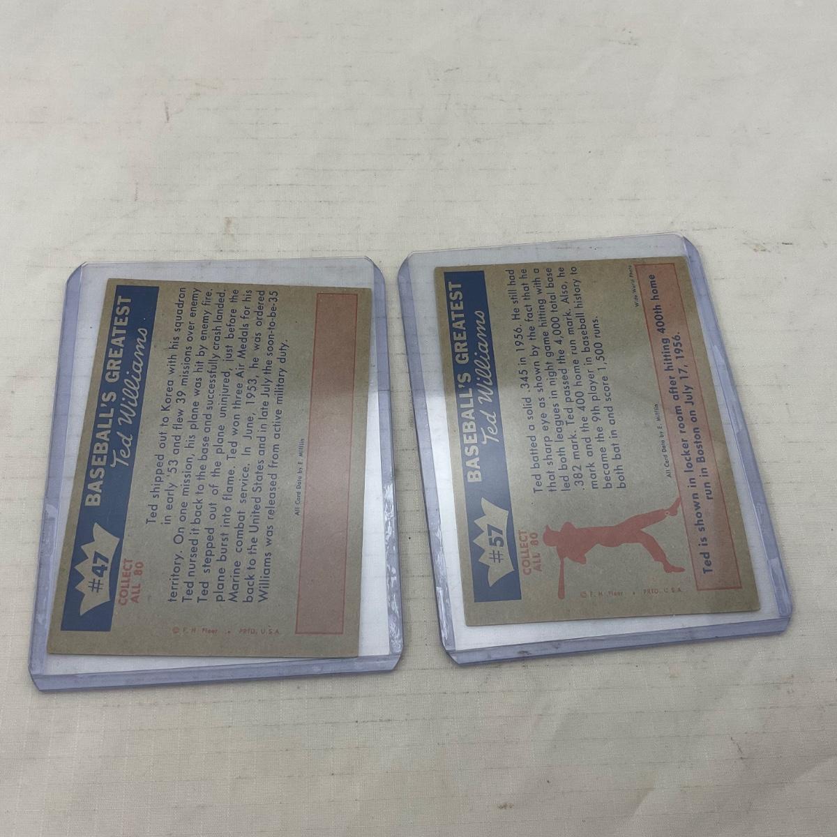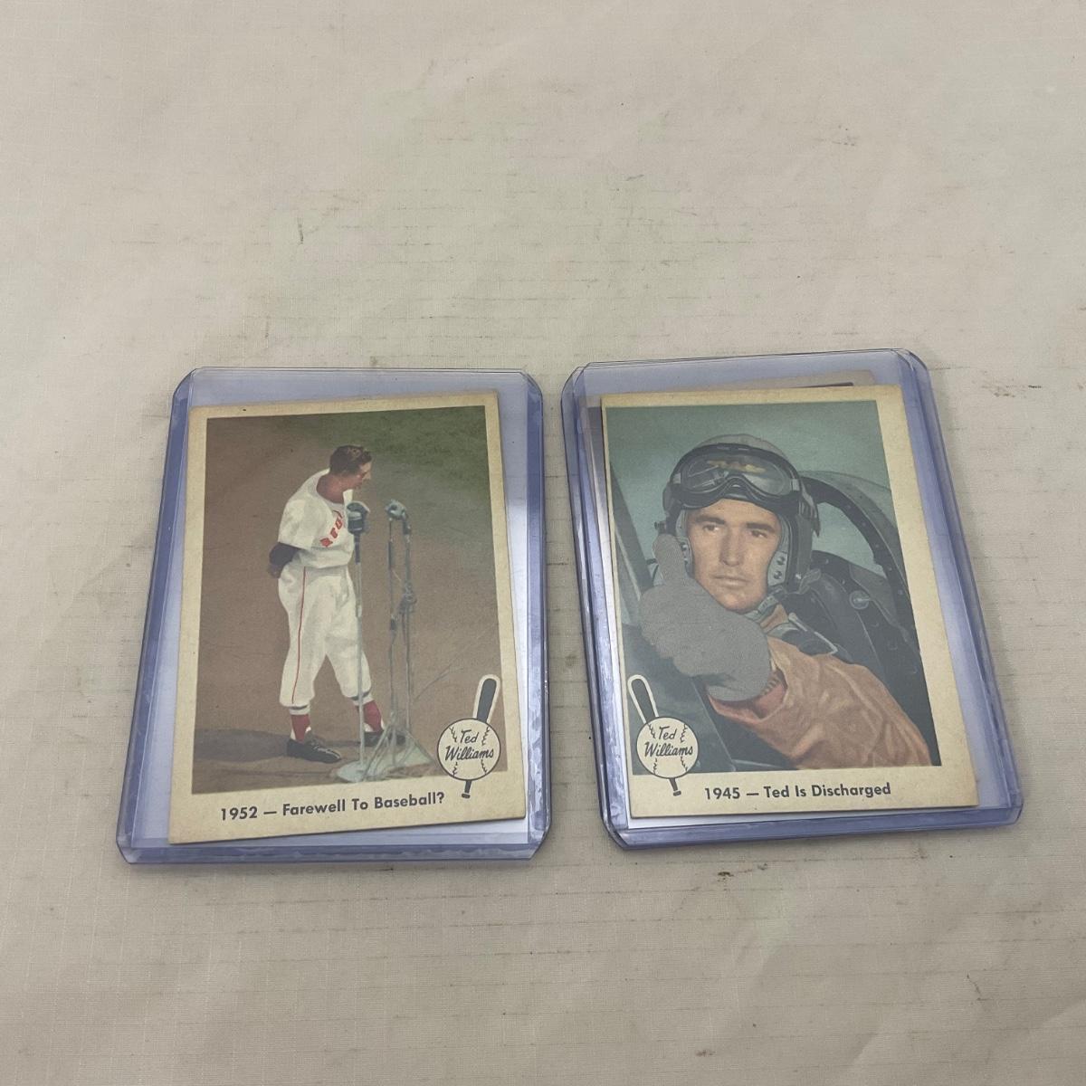 Collection of four 1959 FLEER Ted Williams vintage Baseball cards. Cards come with the sleeves as pictured. Please see photos for details and condition. ::: Shipping is available on this lot. If you require shipping you must let us know at the close of the auction. We will coordinate with you after the item has been won. Shipping fees will include insurance up to or exceeding the value of all items being mailed. If you have any questions regarding this lot please contact the auctioneer either via this website, by direct email or by phone. PICK UP TIMES and other important information can be found in the TERMS and DESCRIPTION of the auction. Please take a look for pertinent information. Thanks!