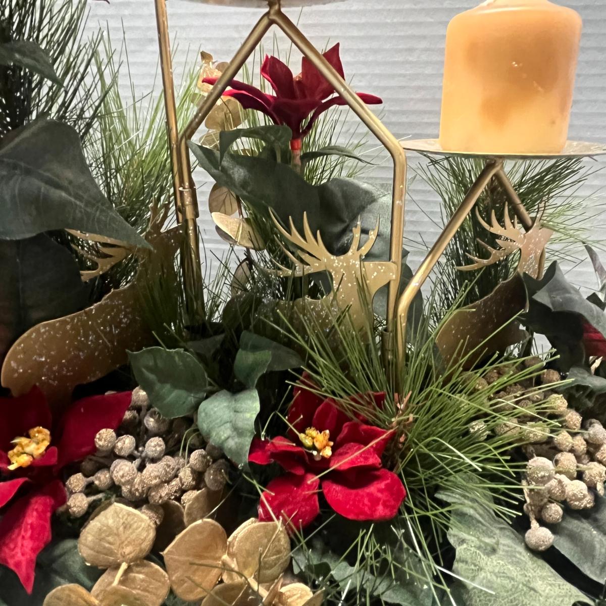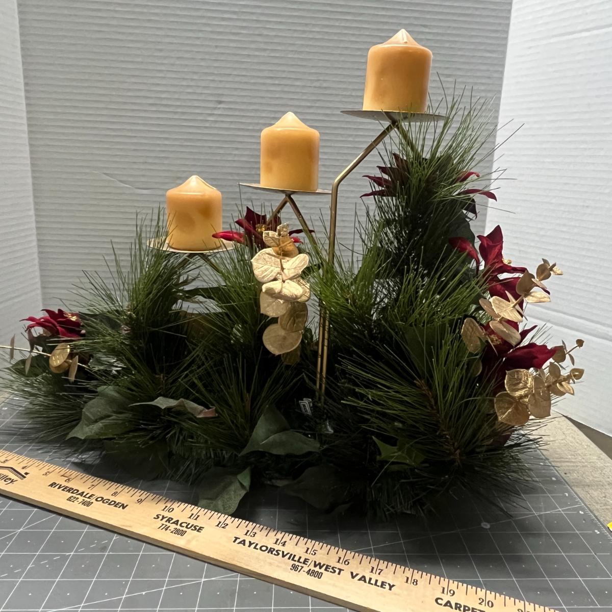 3 yellow candles, poinsettias, pine, berries, gold accents.
