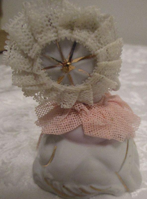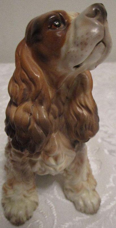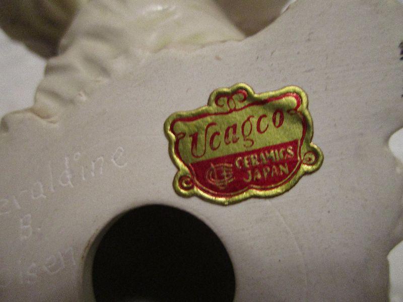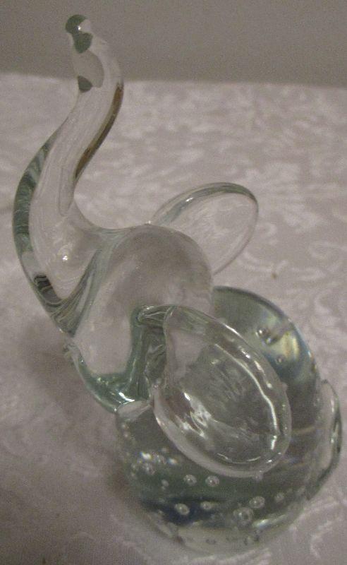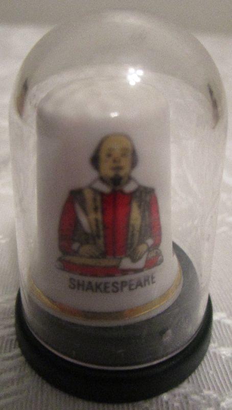 Dog, 5.5" marked UCAGCO Ceramics Japan; Lady with parasol 3.5"; Crystal Elephant 5"; Bone China Thimple in case, Shakespeare picture and name on the front on the back is printed "Parting is such sweet sorrow", marked made in England