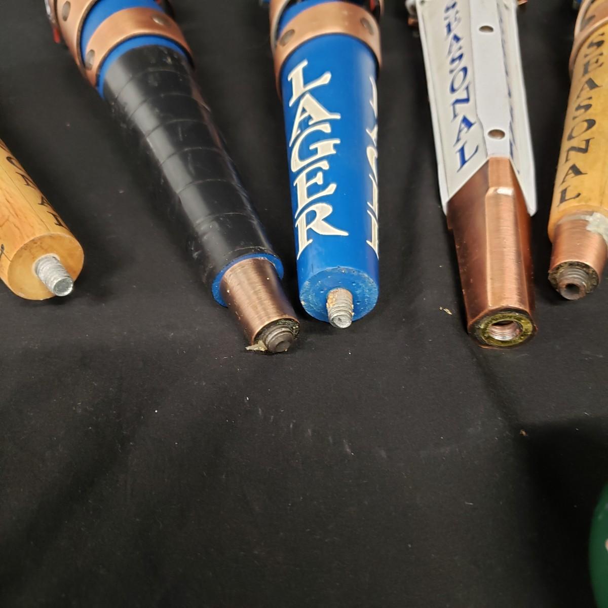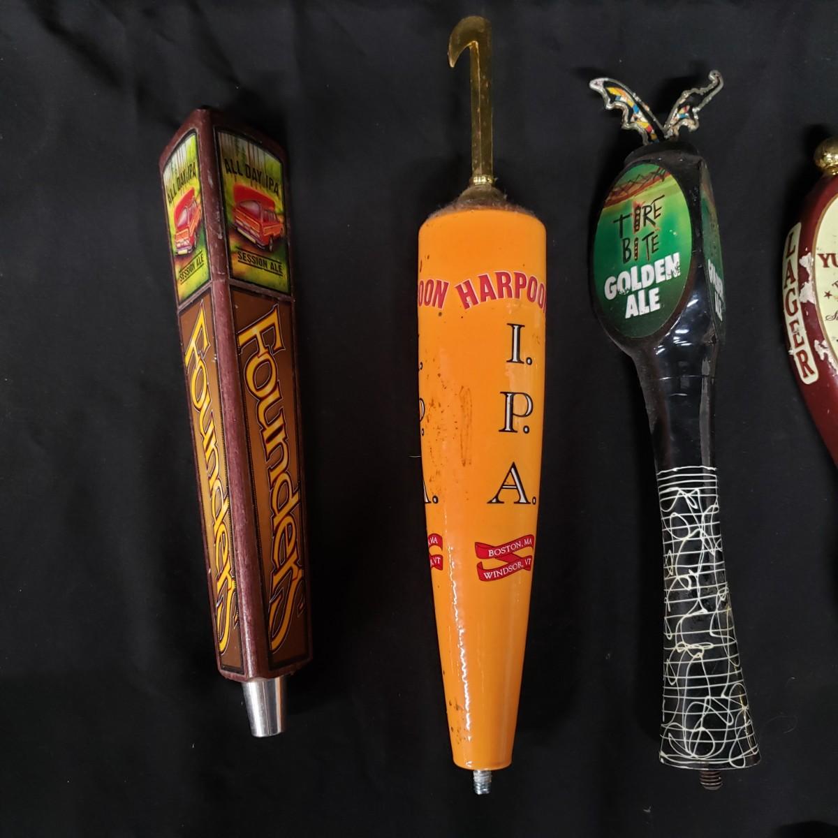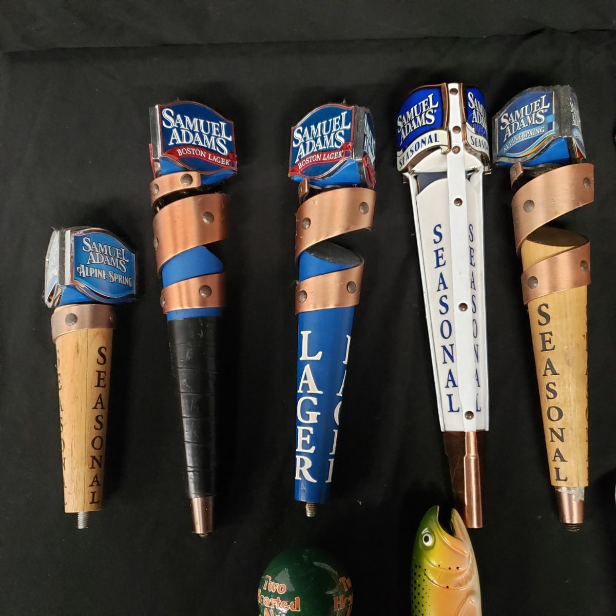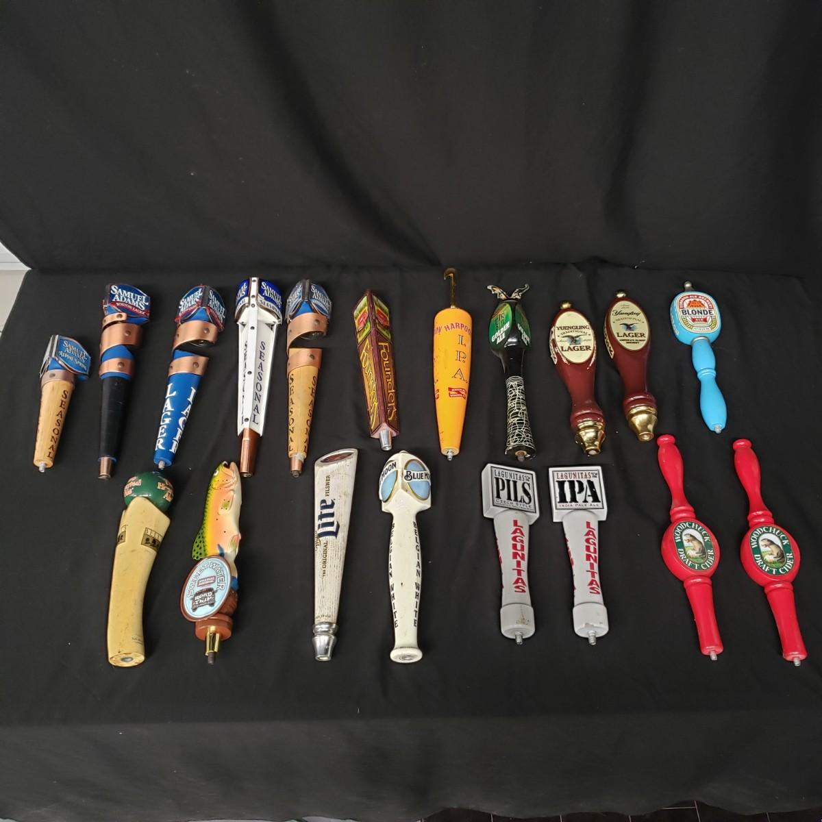 19 Beer taps ready for you! There are 5 Samuel Adams taps ranging from 9 inches tall to 13 inches tall, 1 Founders 11 inches tall, 1 Bell's 10 inches tall, 1 Sweet Water 11.5 inches tall, 1 Miller Lite 13 inches tall that looks like part of a baseball bat, 1 Blue Moon 11 inches tall, 1 Harpoon 14 inches tall, 2 Yuengling 12 inches tall, 1 Tire Bite 13 inches tall, 2 Lagunitas 10 inches tall. 2 Woodchuck 13 inches, and 1 Red Hook 12 inches. All taps are made from wood and some with metal embellishments. Shipping available.