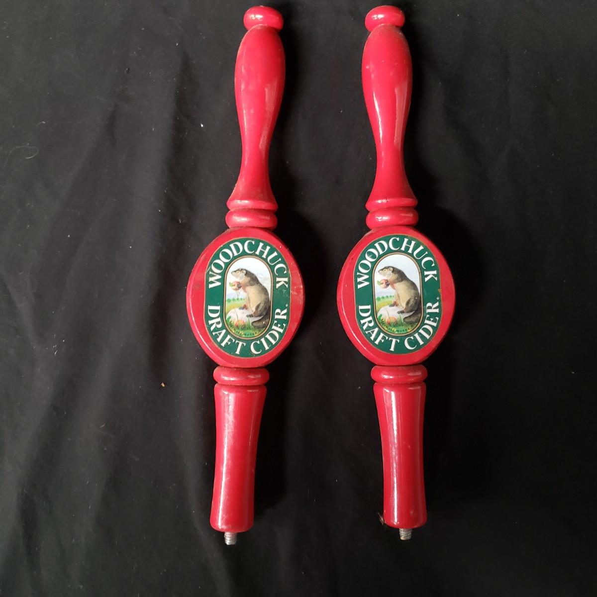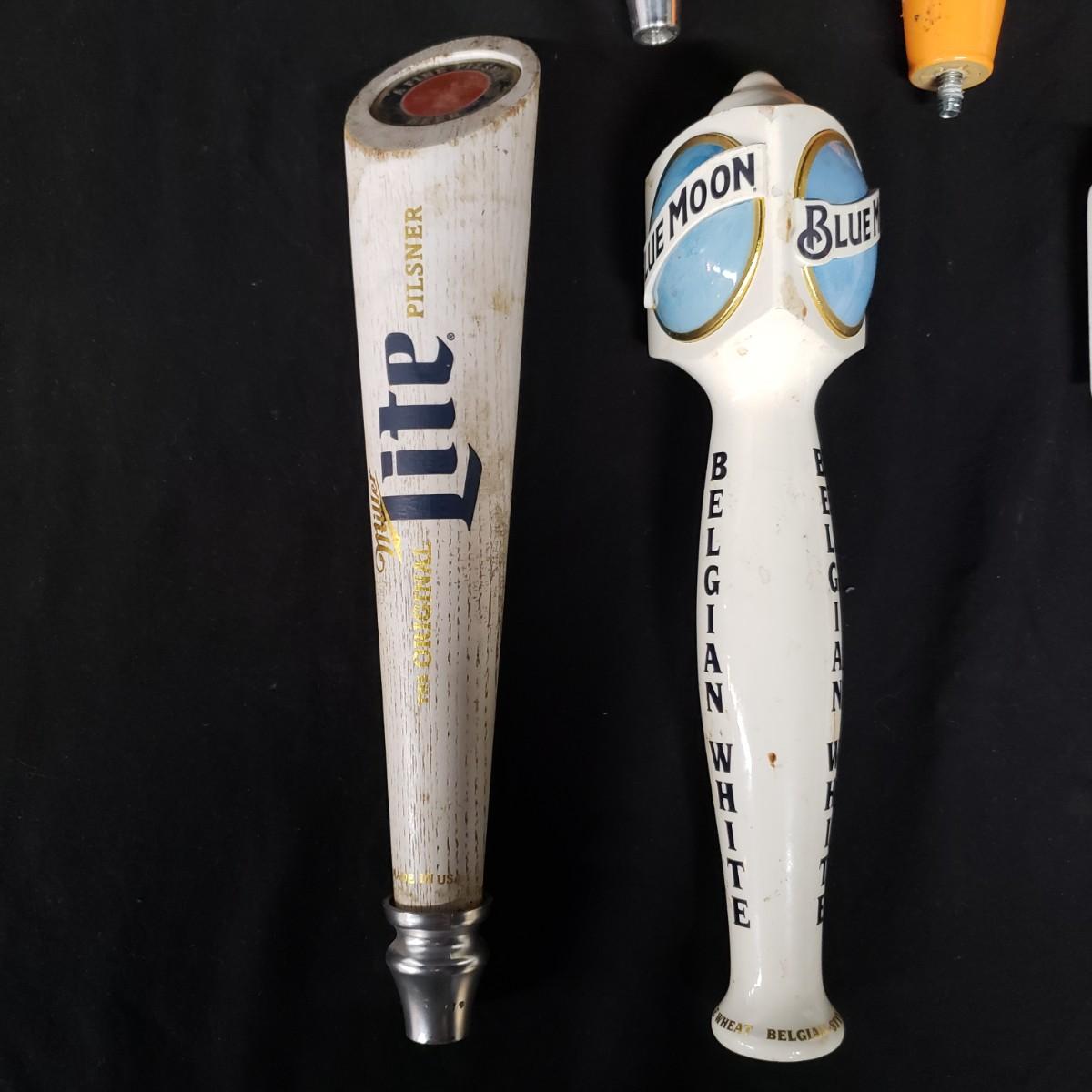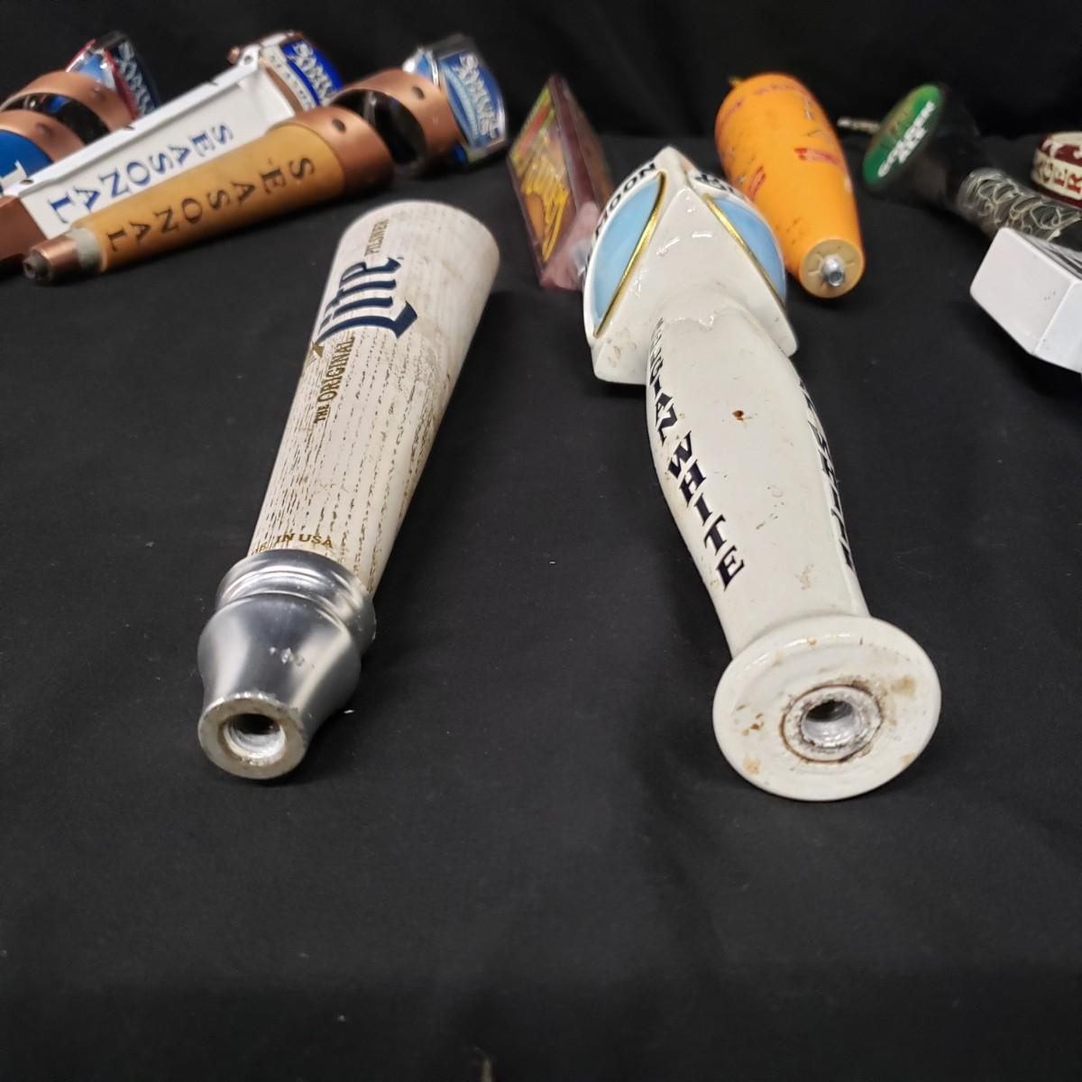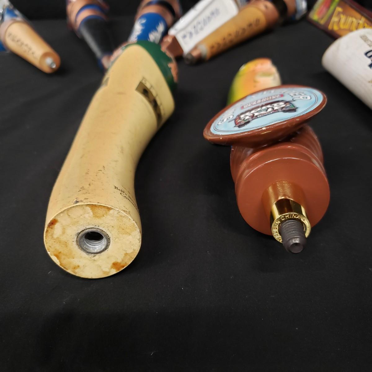 19 Beer taps ready for you! There are 5 Samuel Adams taps ranging from 9 inches tall to 13 inches tall, 1 Founders 11 inches tall, 1 Bell's 10 inches tall, 1 Sweet Water 11.5 inches tall, 1 Miller Lite 13 inches tall that looks like part of a baseball bat, 1 Blue Moon 11 inches tall, 1 Harpoon 14 inches tall, 2 Yuengling 12 inches tall, 1 Tire Bite 13 inches tall, 2 Lagunitas 10 inches tall. 2 Woodchuck 13 inches, and 1 Red Hook 12 inches. All taps are made from wood and some with metal embellishments. Shipping available.