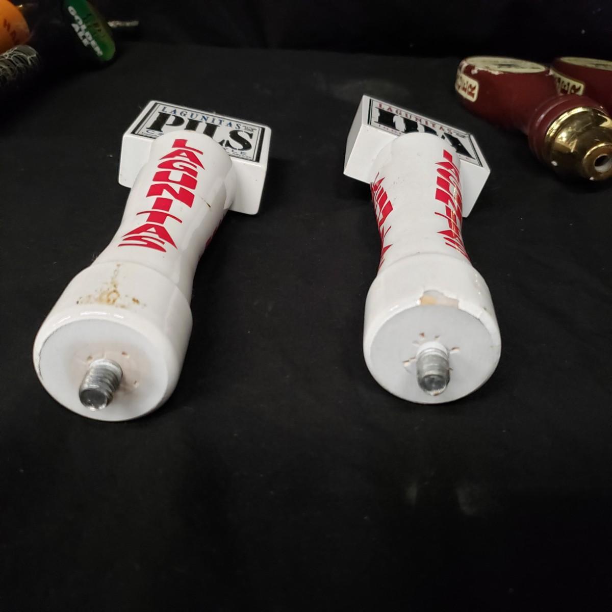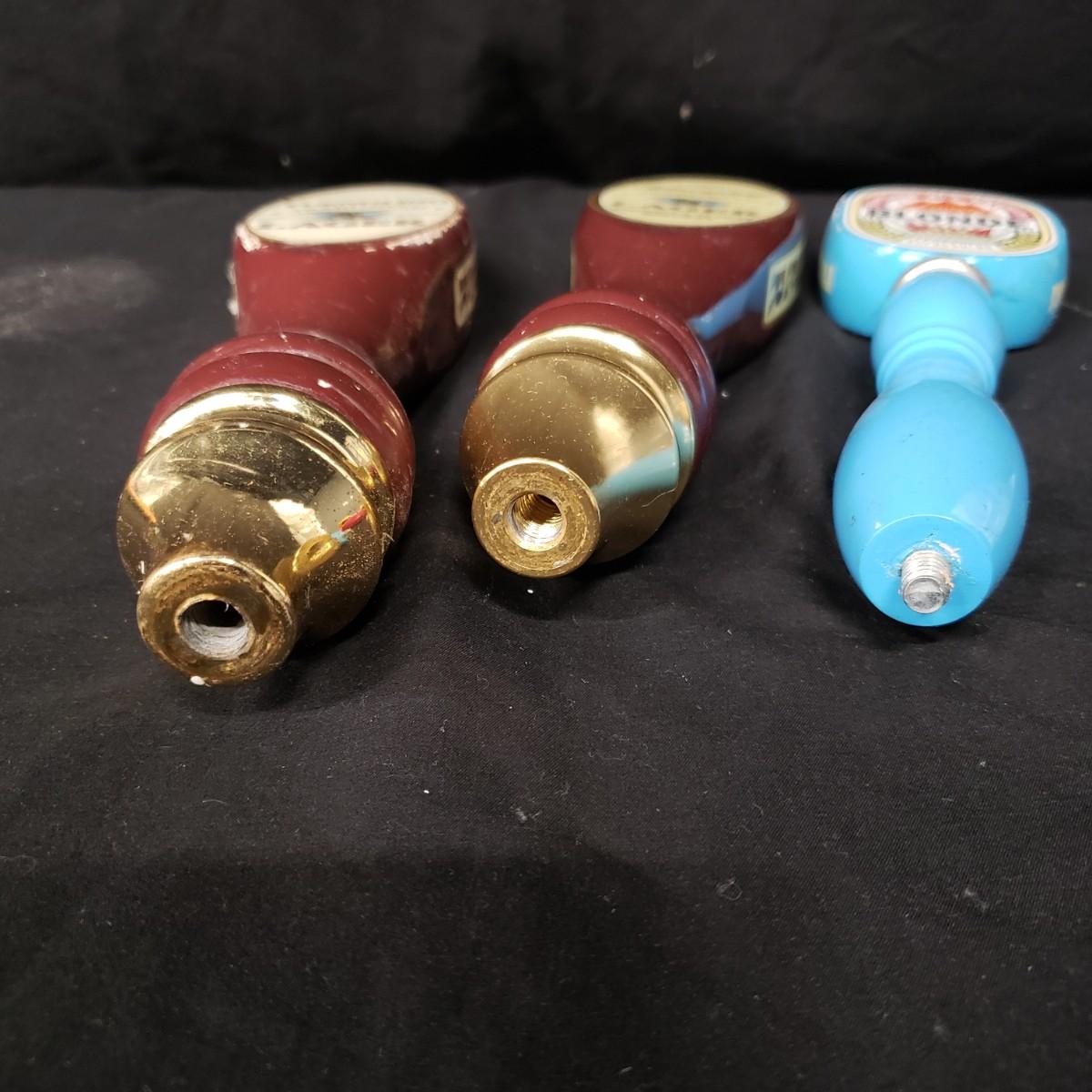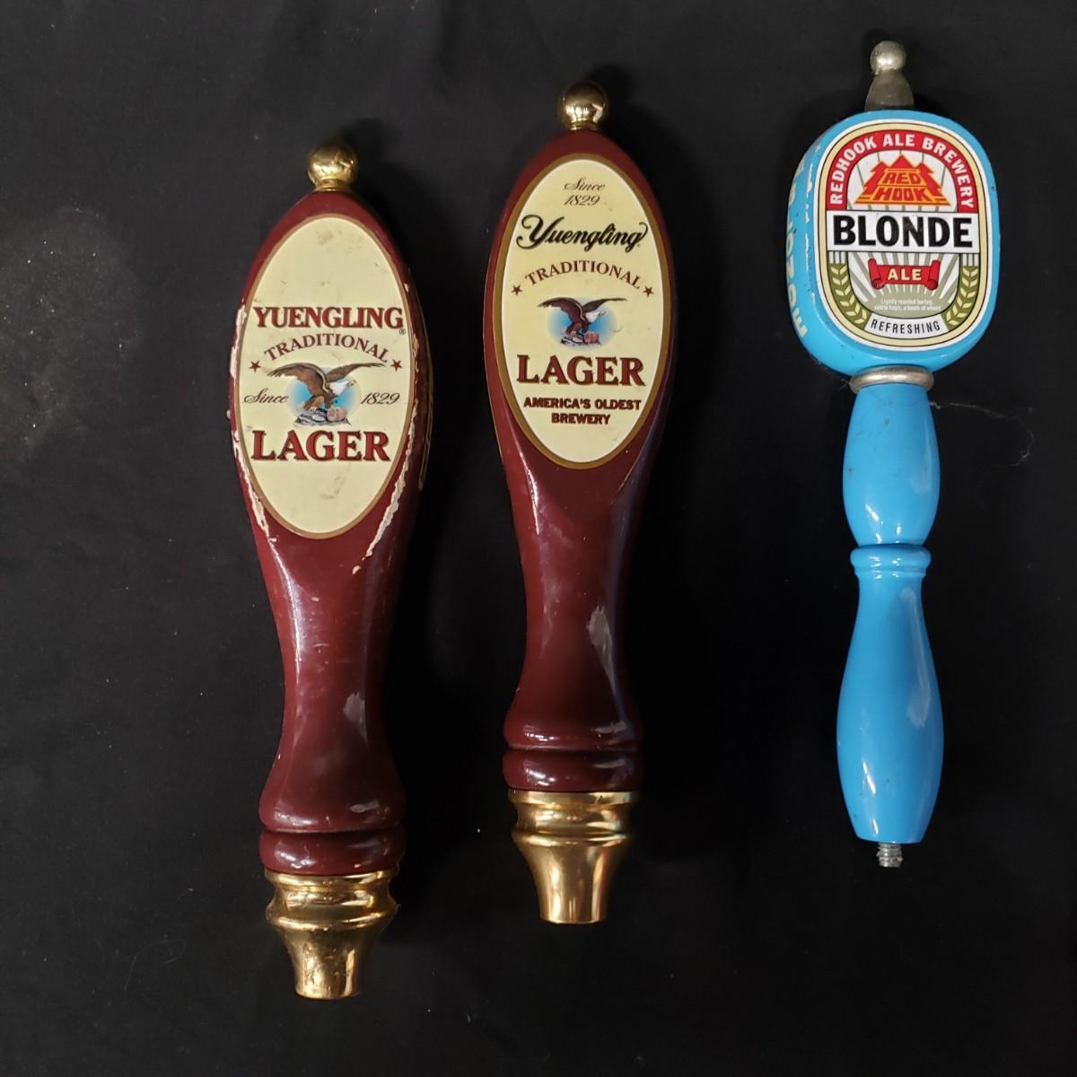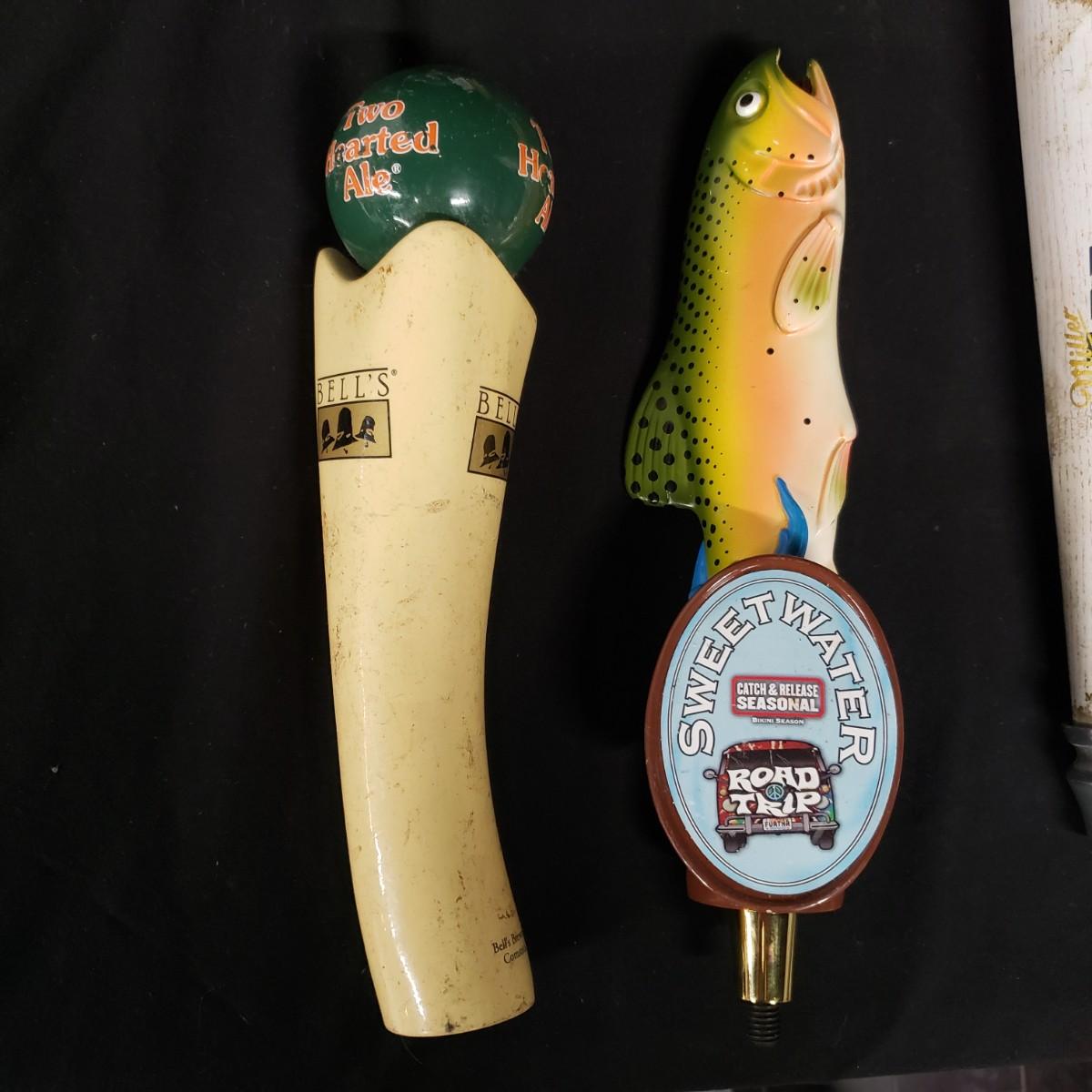 19 Beer taps ready for you! There are 5 Samuel Adams taps ranging from 9 inches tall to 13 inches tall, 1 Founders 11 inches tall, 1 Bell's 10 inches tall, 1 Sweet Water 11.5 inches tall, 1 Miller Lite 13 inches tall that looks like part of a baseball bat, 1 Blue Moon 11 inches tall, 1 Harpoon 14 inches tall, 2 Yuengling 12 inches tall, 1 Tire Bite 13 inches tall, 2 Lagunitas 10 inches tall. 2 Woodchuck 13 inches, and 1 Red Hook 12 inches. All taps are made from wood and some with metal embellishments. Shipping available.
