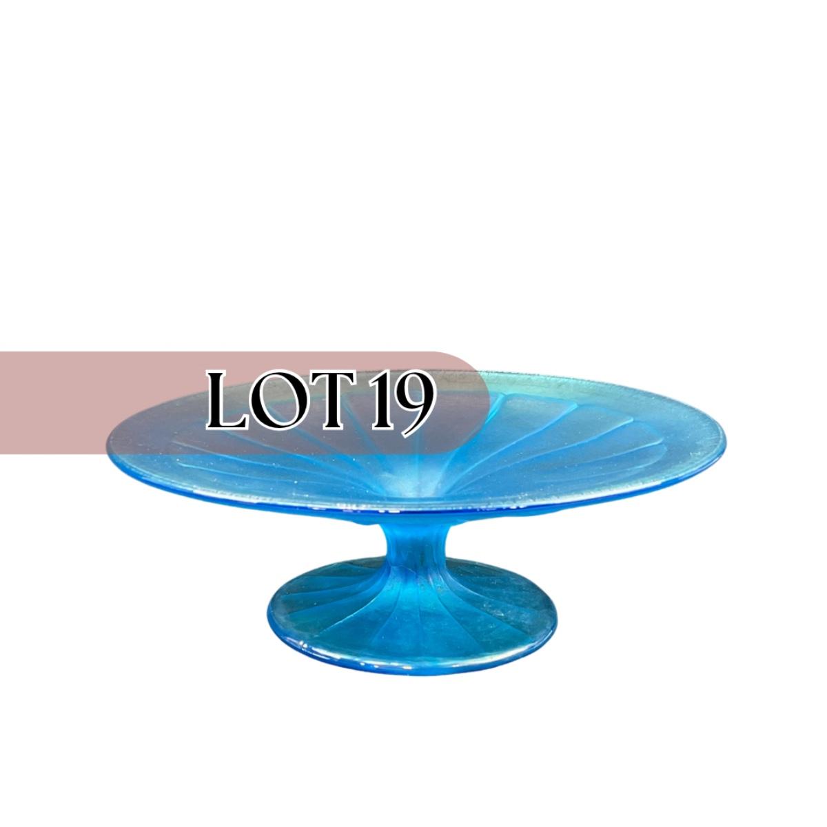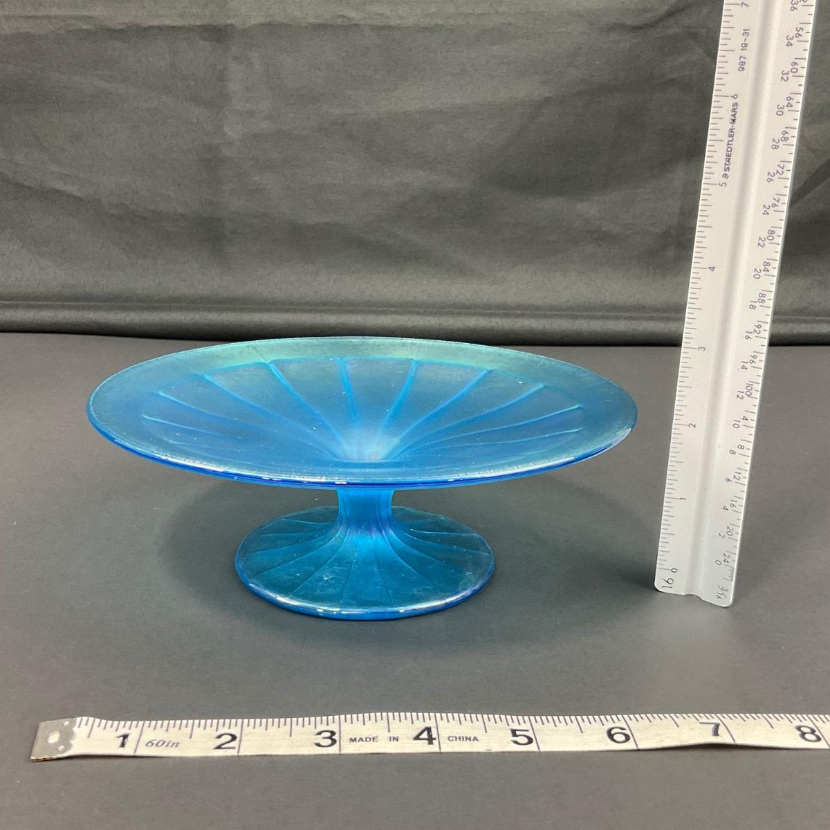 One vintage Fenton wheel cut Celeste blue iridescent pedestal dish. This piece does have some scuffs, scratches, marks, or slight damage, but otherwise appears to be in great shape. Please see photos for details and condition. Any condition statement is given as a courtesy to a client, is an opinion, and should not be treated as a statement of fact. Reference to condition written, oral or within a condition report shall not be regarded as a full account of condition and may not include all defects, alterations, or restorations. Absence of a condition report does not imply a lot is flawless or lacking imperfections or damage. Katherine’s Auction & Appraisal Service shall have no responsibility for any error or omission. Returns shall not be accepted on the basis of condition. ::: Shipping is available on this lot. If you require shipping you must let us know at the close of the auction. We will coordinate with you after the item has been won. Shipping fees will include insurance up to or exceeding the value of all items being mailed. If you have any questions regarding this lot please contact the auctioneer either via this website, by direct email or by phone. PICK UP TIMES and other important information can be found in the TERMS and DESCRIPTION of the auction. Please take a look for pertinent information. Thanks!