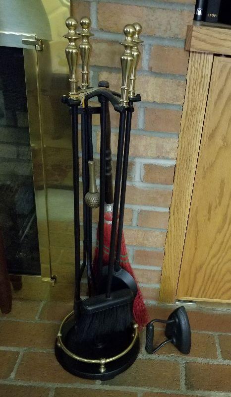 Modern black fireplace tools with brass colored accents. Lot includes a #5 iron.