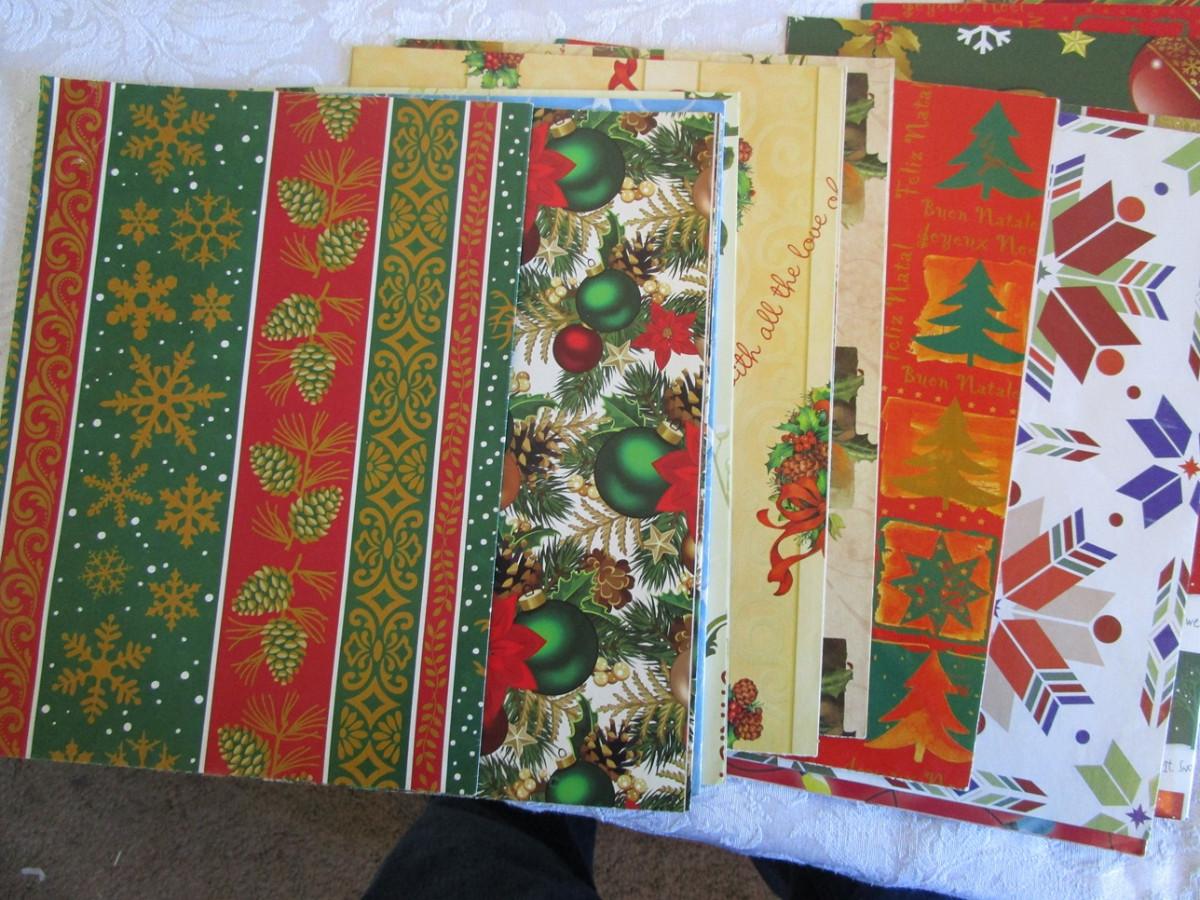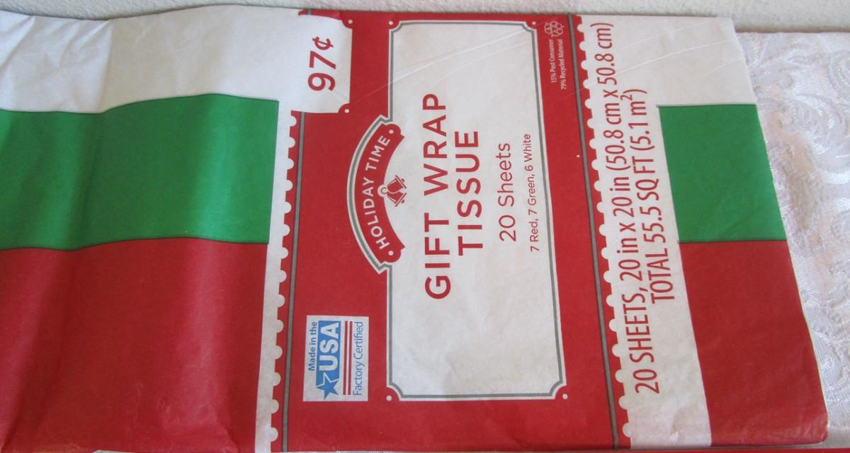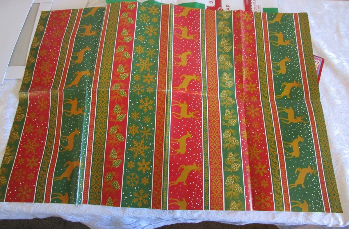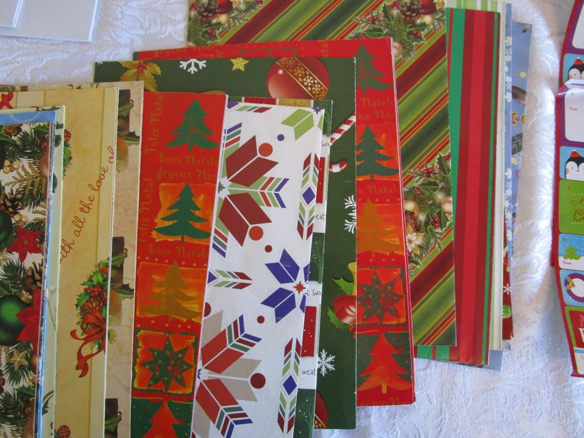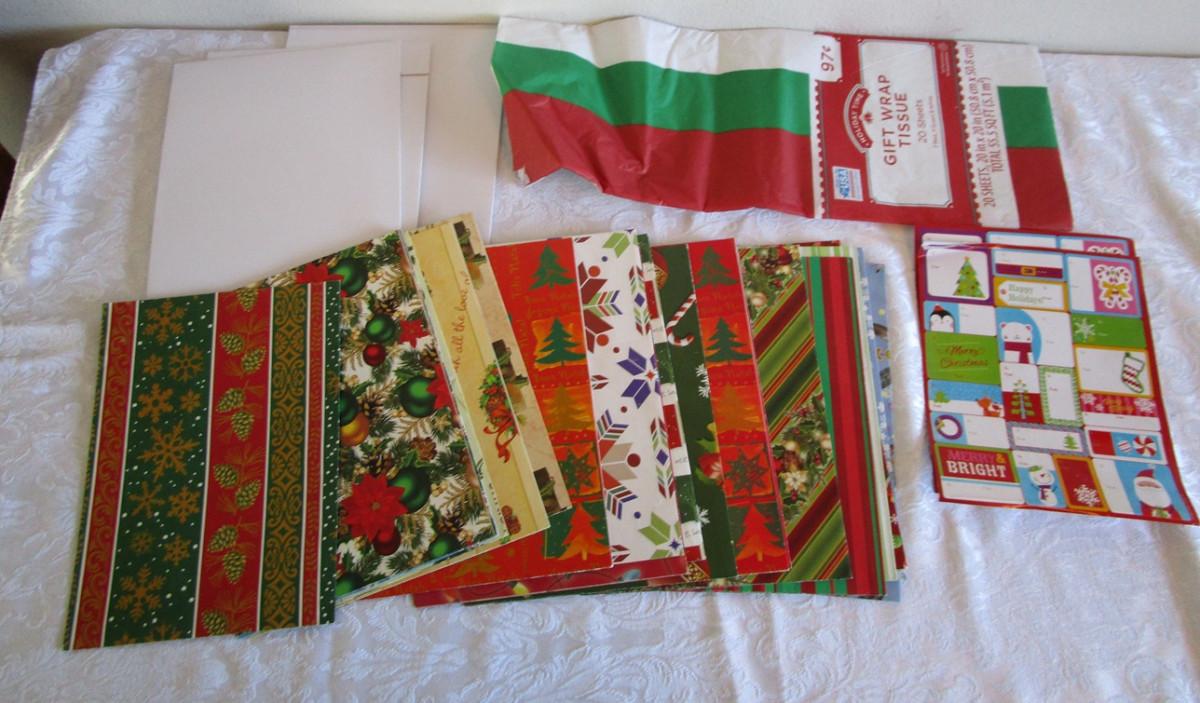 19 folded Christmas gift wrap sheets, 1 pkg Christmas tissue paper, 2 white gift boxes