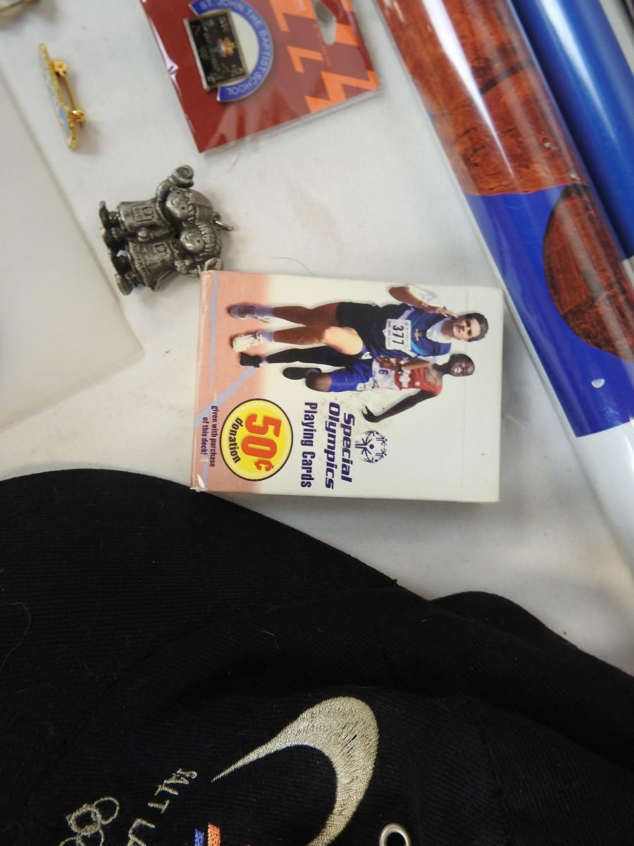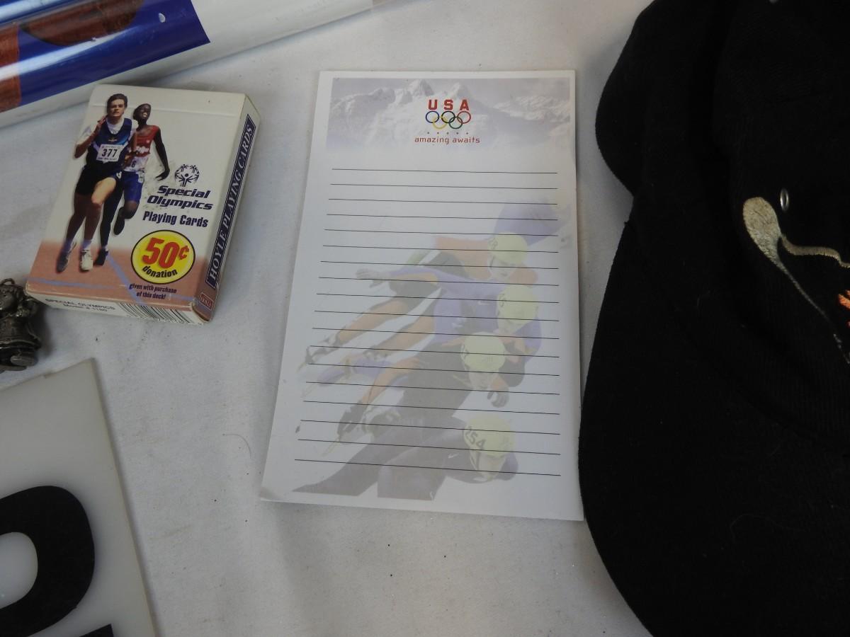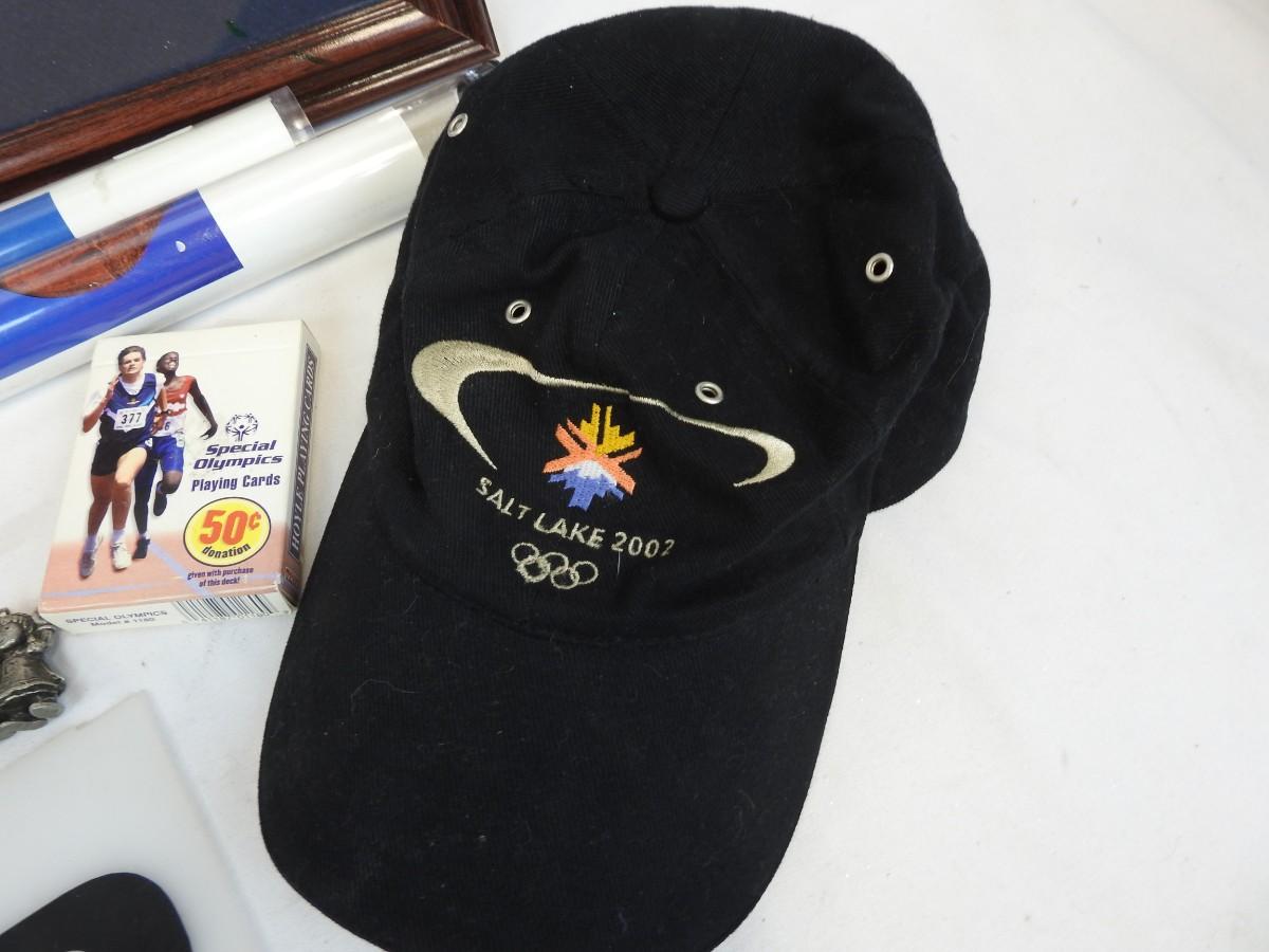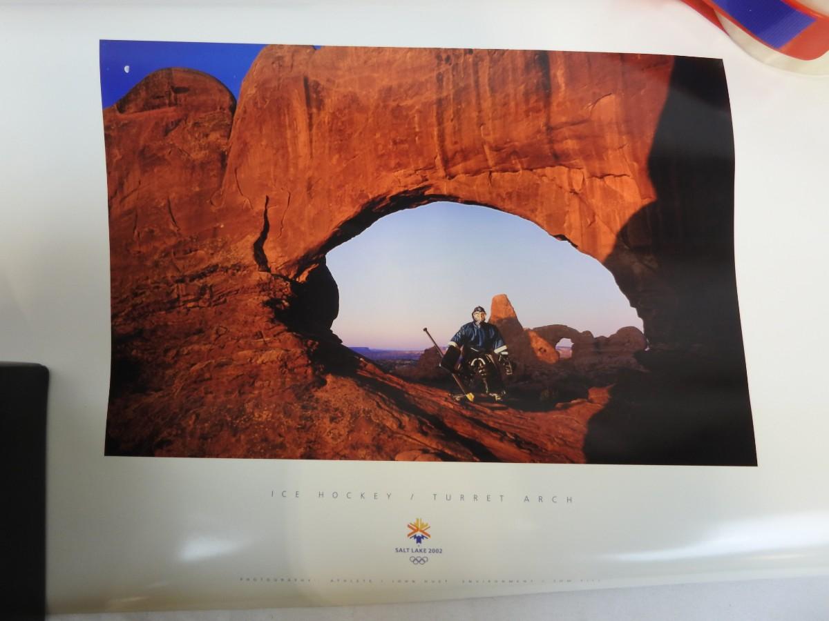 19 pc Salt Lake Olympics Memorabilia: 3 Posters, 1 Framed, 13 pins, Cards, Hat, Keychain