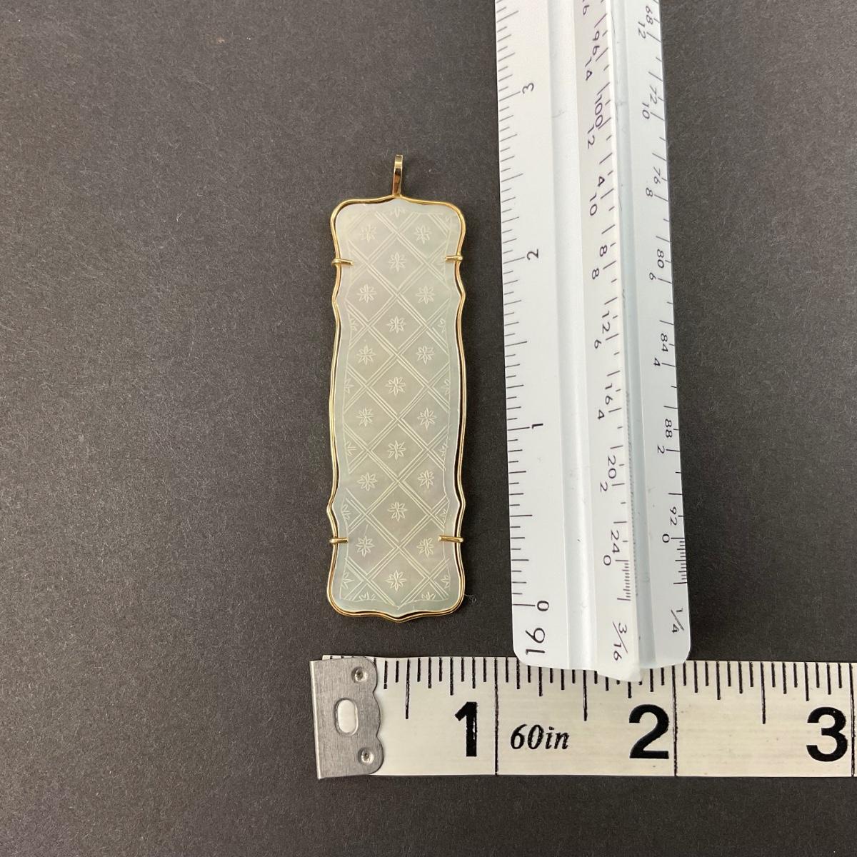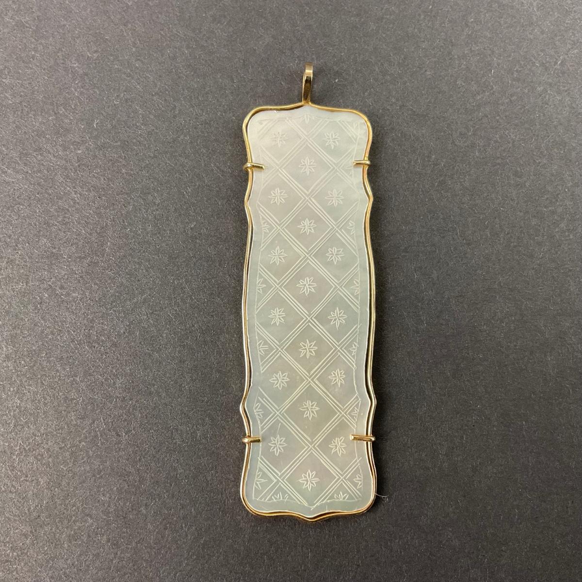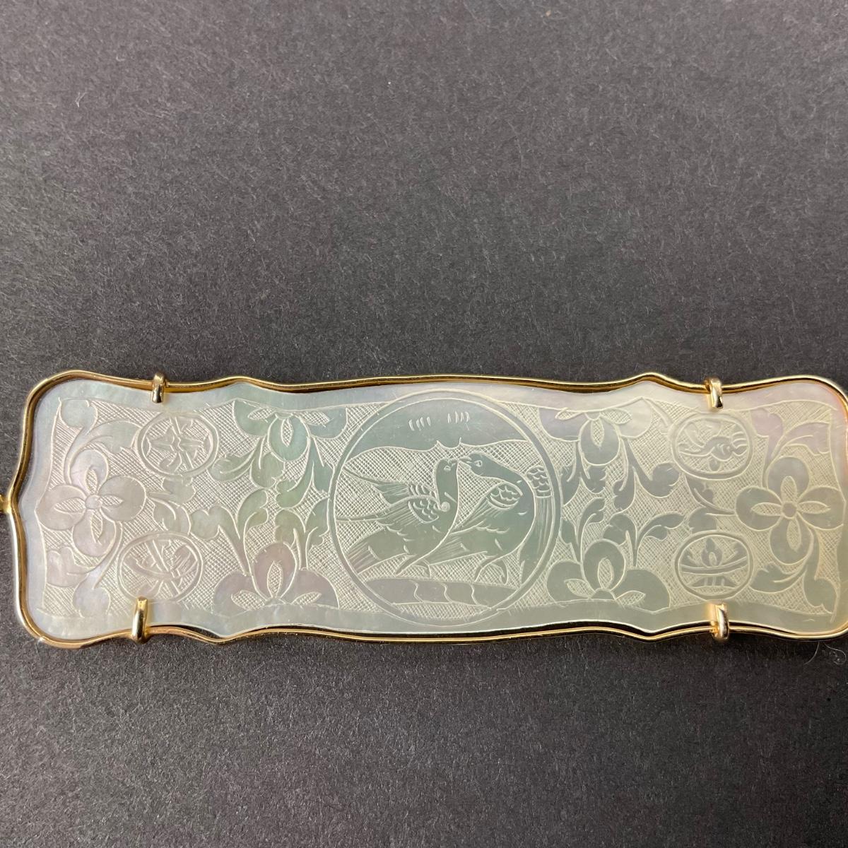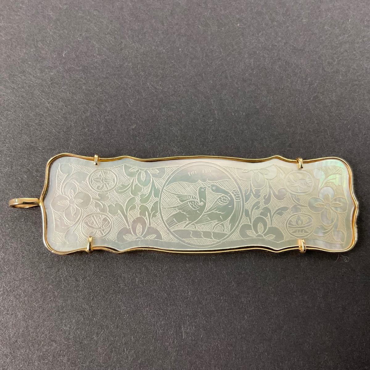 one vintage double sided hand etched mother of pearl pendant. This piece appears to be gold filled but if not marked. Please see photos for details and condition. Any condition statement is given as a courtesy to a client, is an opinion, and should not be treated as a statement of fact. Reference to condition written, oral or within a condition report shall not be regarded as a full account of condition and may not include all defects, alterations, or restorations. Absence of a condition report does not imply a lot is flawless or lacking imperfections or damage. Katherine’s Auction & Appraisal Service shall have no responsibility for any error or omission. Returns shall not be accepted on the basis of condition. ::: Shipping is available on this lot. If you require shipping you must let us know at the close of the auction. We will coordinate with you after the item has been won. Shipping fees will include insurance up to or exceeding the value of all items being mailed. If you have any questions regarding this lot please contact the auctioneer either via this website, by direct email or by phone. PICK UP TIMES and other important information can be found in the TERMS and DESCRIPTION of the auction. Please take a look for pertinent information. Thanks!