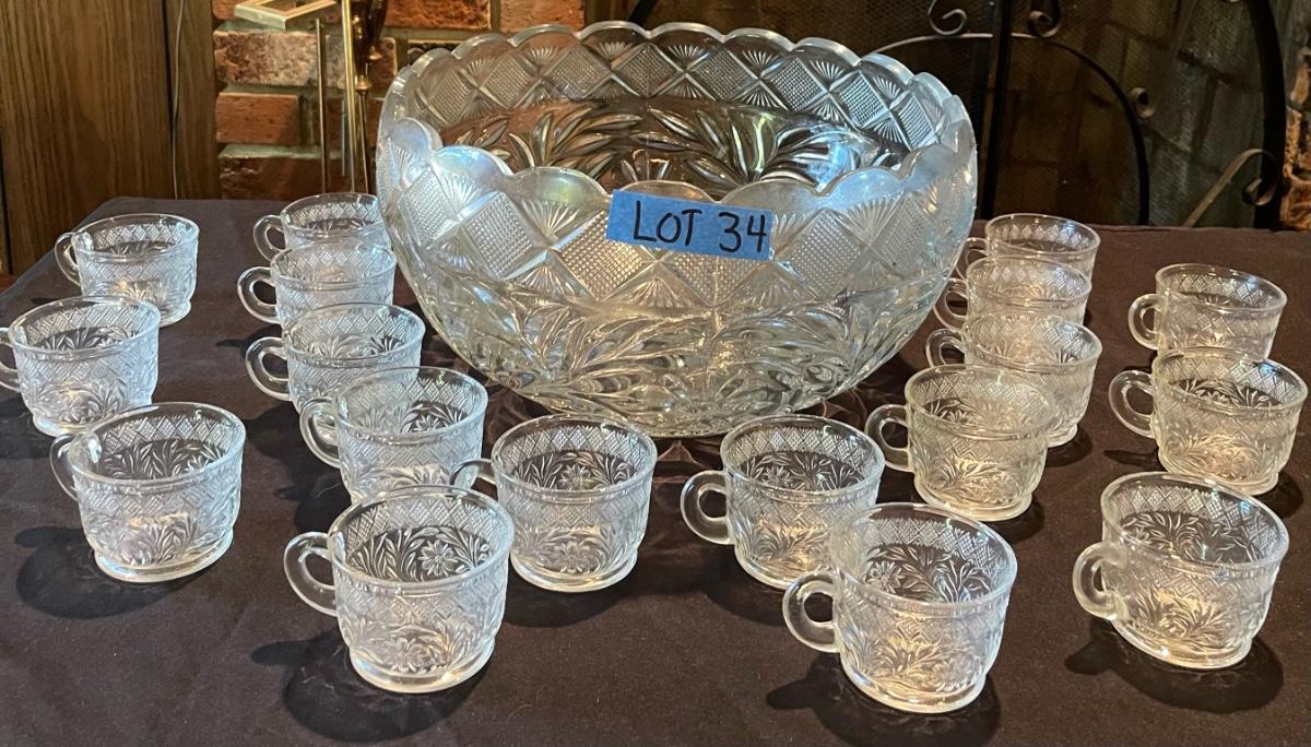 (19 piece) Etched Glass Punch Bowl & Glasses