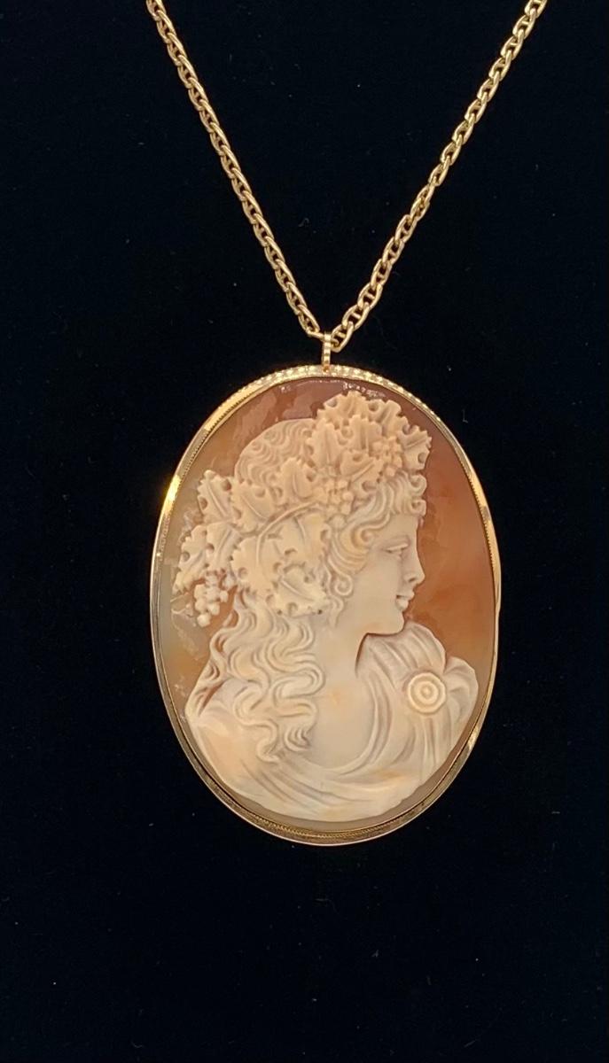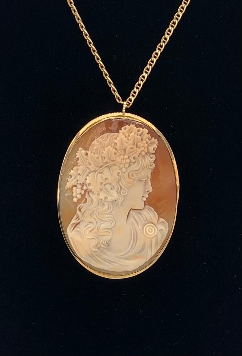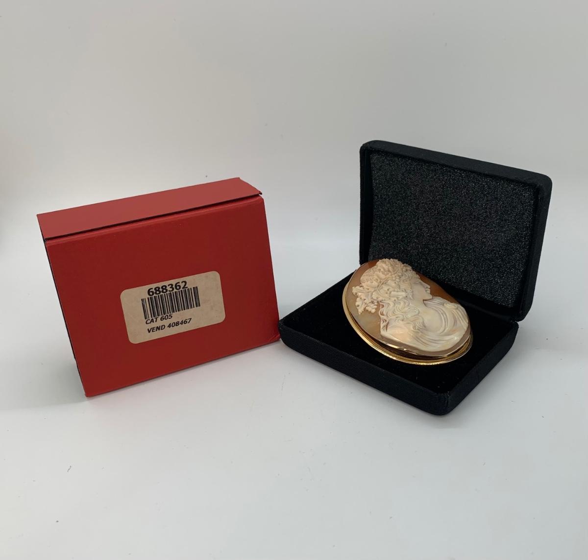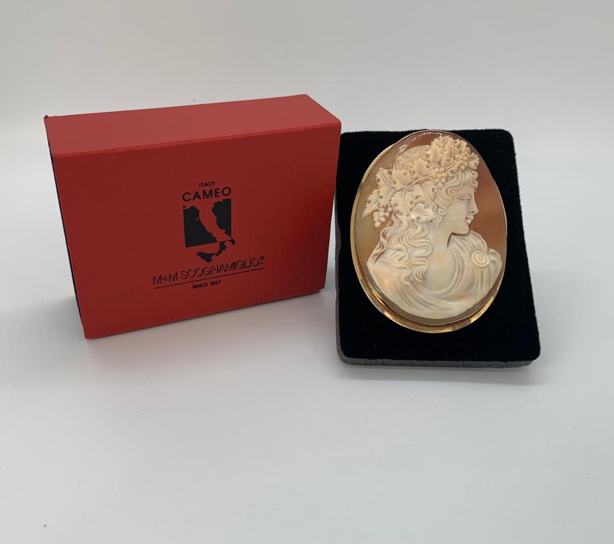 19: New with box Large and Lovely Sardonyx Shell Cameo M&M Scognamiglio Cameo Pendant/Brooch