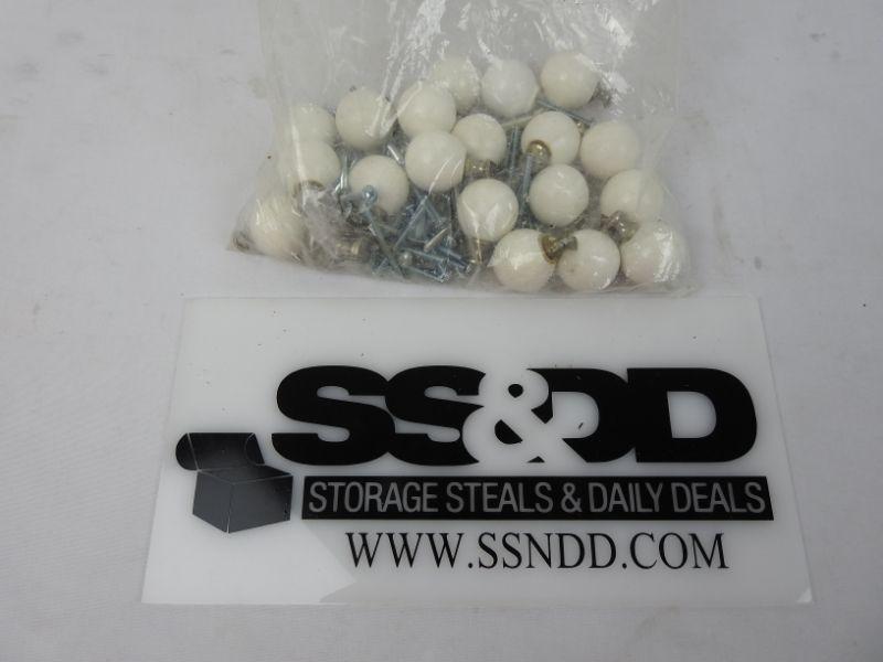 19 Spherical White Drawer Pulls with Hardware, Roughly 1.25" x 1.25" x 1.75"