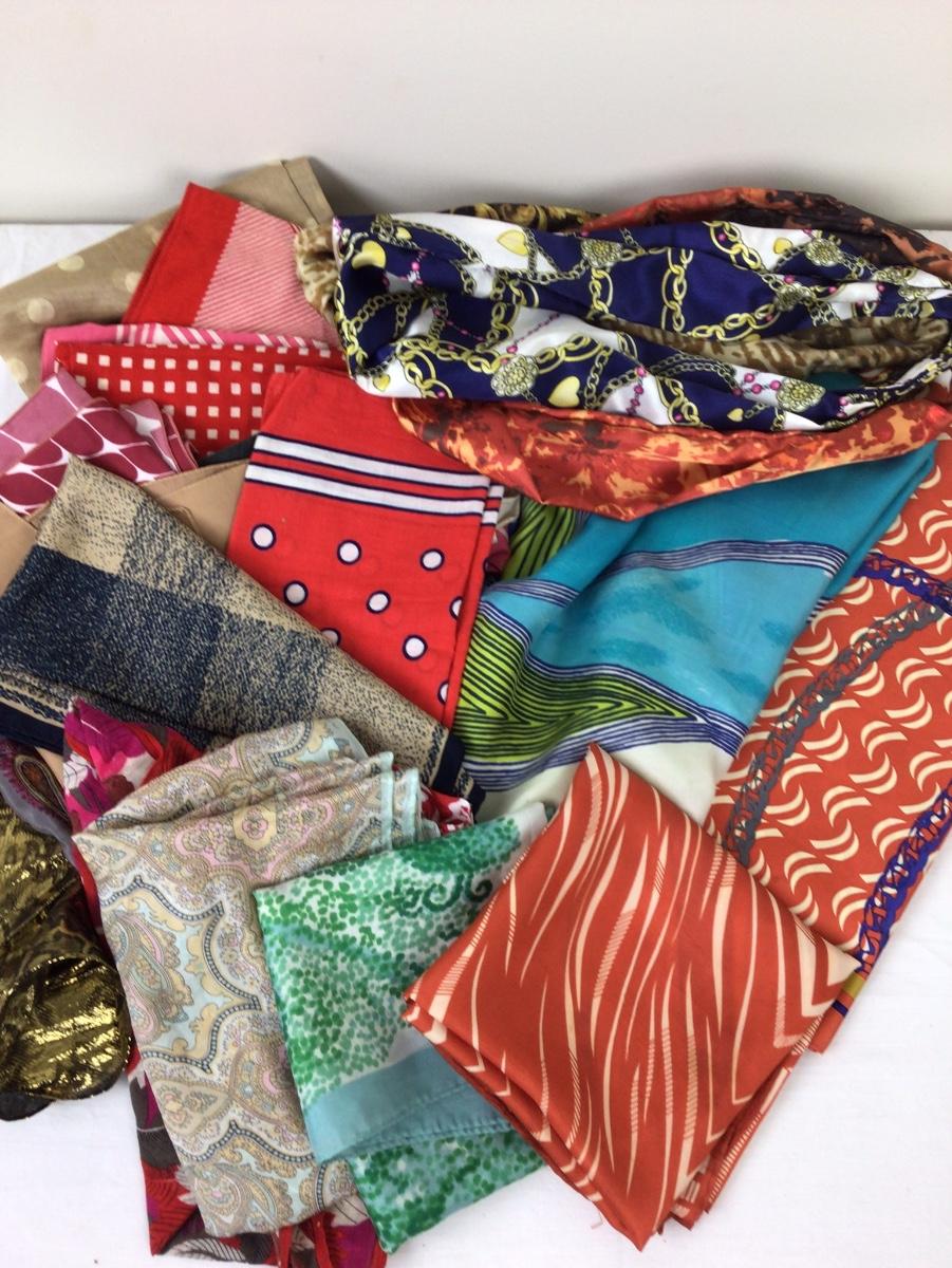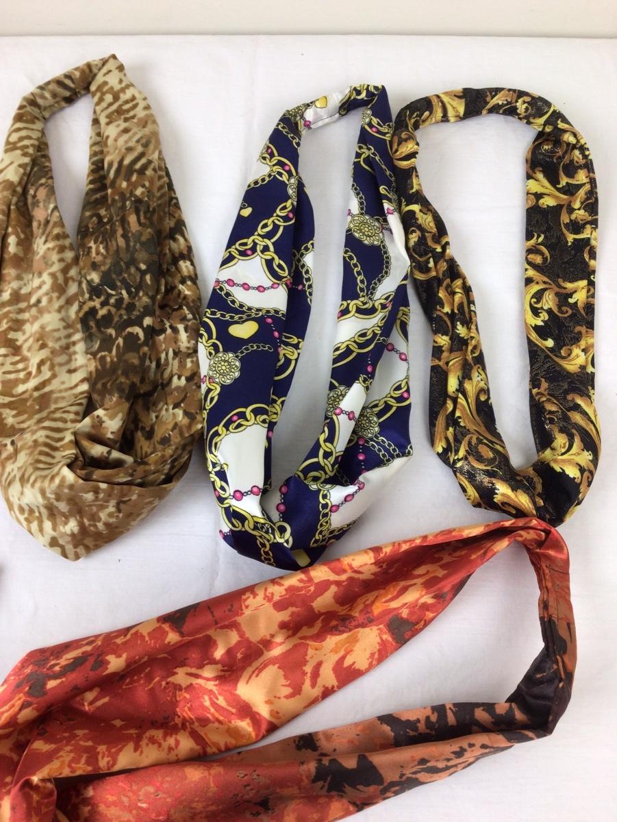 Lot contains round neck scarves, head wraps, scarves, Vena, Sean Combs and more.