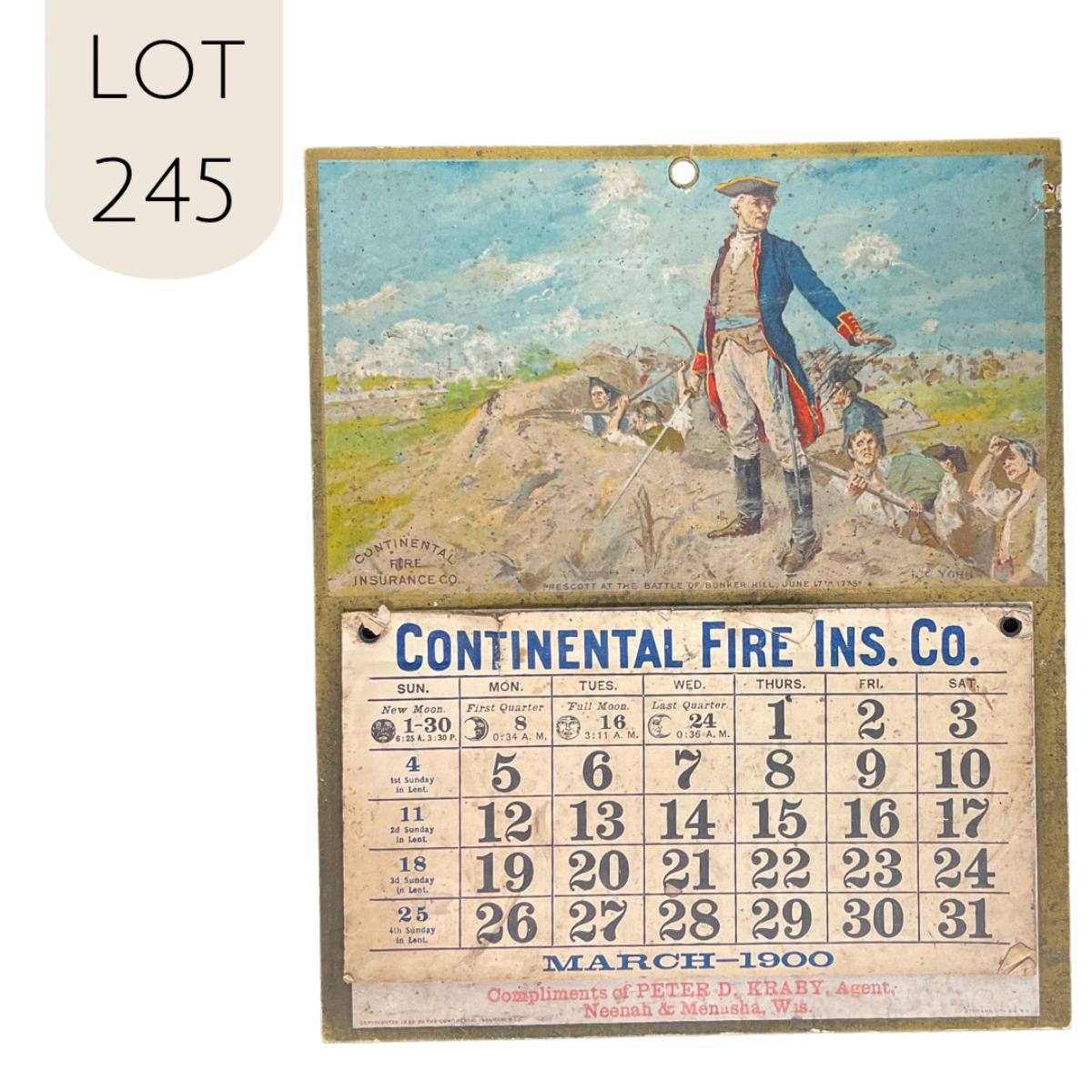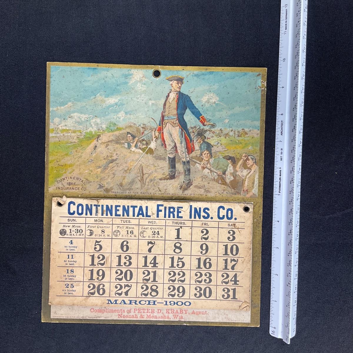 This calendar was compliments of Peter D Kraby, an agent in Neenah and Menasha Wisconsin for the Continental Fire Insurance Company. This calendar features a picture of a battle scene titled "Prescott at the Battle of Bunker Hill", copyright 1899, J Ottman Litho Company. The original of the painting was by F C Yohn. This calendar is incomplete, showing March 1900. This calendar measures 8 1/4" x 9 3/4". **|** Please see photos for details and condition. ::: Shipping is available on this lot. If you require shipping you must let us know at the close of the auction. We will coordinate with you after the item has been won. Shipping fees will include insurance up to or exceeding the value of all items being mailed. If you have any questions regarding this lot please contact the auctioneer either via this website, by direct email or by phone. PICK UP TIMES and other important information can be found in the TERMS and DESCRIPTION of the auction. Please take a look for pertinent information. Thanks!