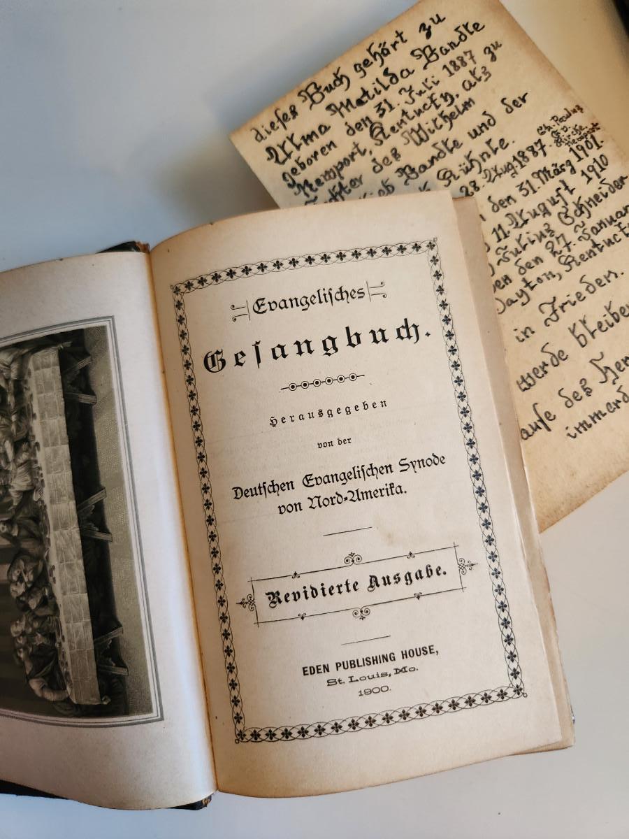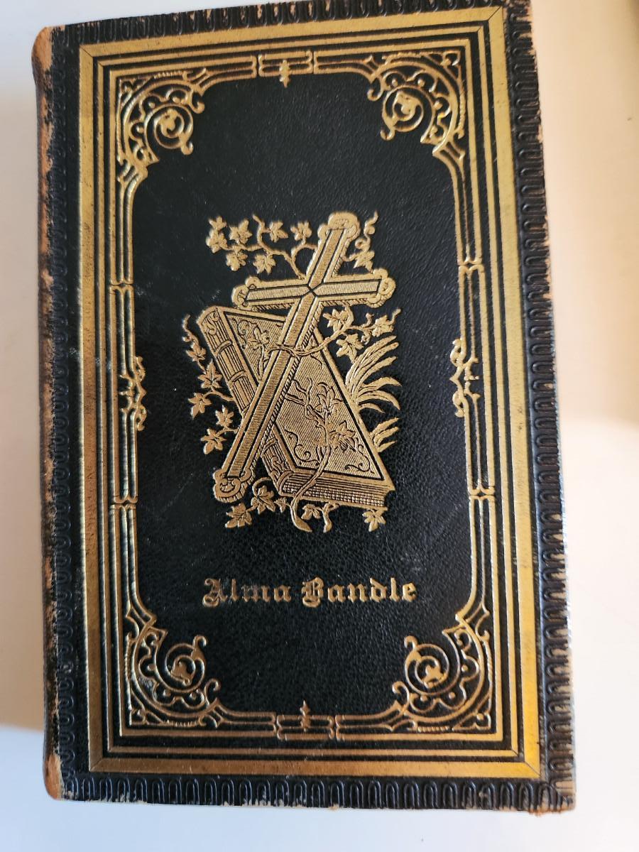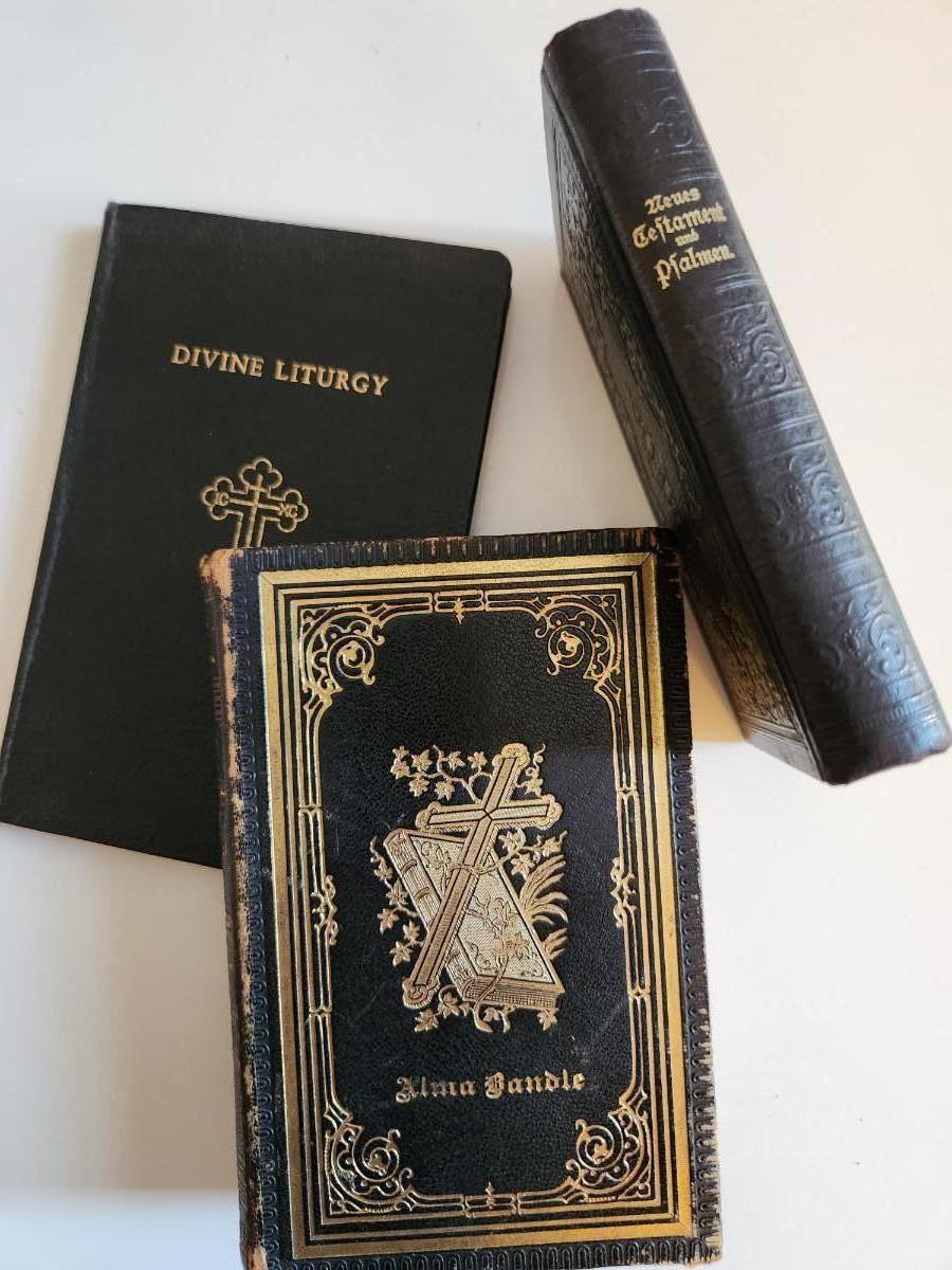 This auction lot is for a 1900 German Evangelical Missal with the name Alma Bandle inscribed on the cover. This beautiful book is a treasure with an included written note in nice script telling of her birth in 1887 in Newport, KY and a listing of her various relatives. There is a nameplate of her great grandson on the flyleaf. This offering also includes a copy of Divine Liturgy 1967 and another wonderful small Testament dated 1899 printed in German.
