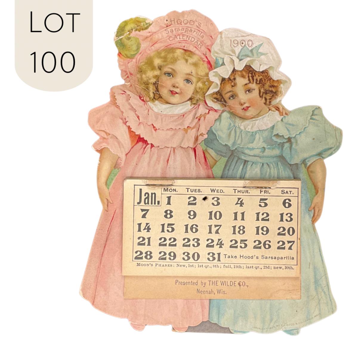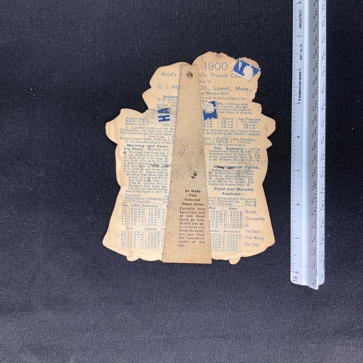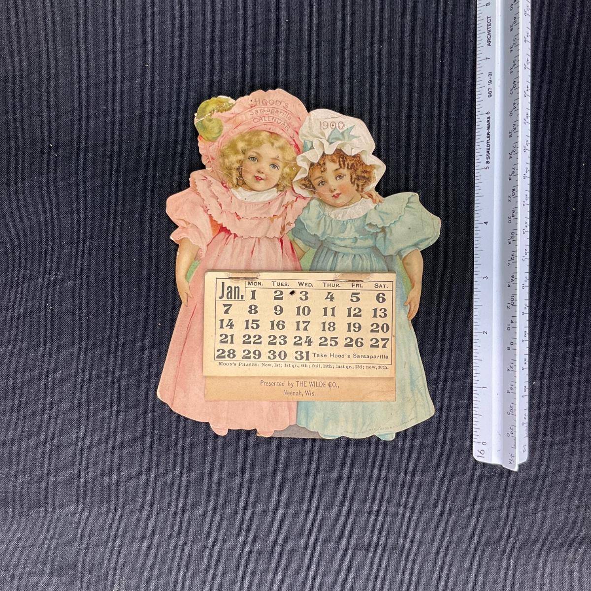 This calendar was courtesy of The Wilde Company, located in Neenah Wisconsin. This calendar, dated 1900 and designed to promote Hood's Sarsaparilla is copyright 1899 by CI Hood Co. Lowell, Massachusetts. This Die-Cut Calendar features two young girls, side by side. One in pink, one in blue. This PROVERB CALENDAR is complete, without the cover page, showing January 1900. This calendar is 125 years old - just to double check the math on that. The calendar measures approximately 5" x 6 3/8". **|** Please see photos for details and condition. ::: Shipping is available on this lot. If you require shipping you must let us know at the close of the auction. We will coordinate with you after the item has been won. Shipping fees will include insurance up to or exceeding the value of all items being mailed. If you have any questions regarding this lot please contact the auctioneer either via this website, by direct email or by phone. PICK UP TIMES and other important information can be found in the TERMS and DESCRIPTION of the auction. Please take a look for pertinent information. Thanks!
