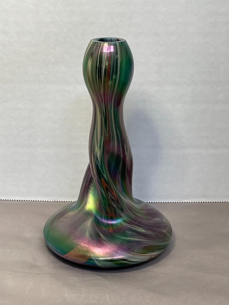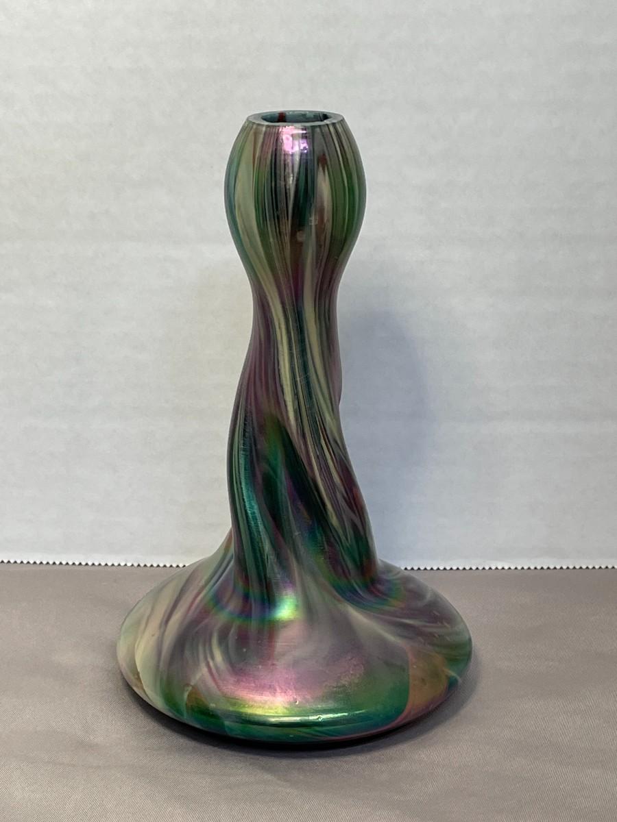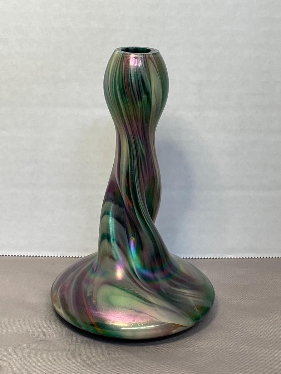 This iridescent glass vase has a twisted form and made of glass with a green, purple, white mixture of colors. It measures about 6.5 inches tall and 4 inches wide. Other than a minor flea bite at the inner neck, it is in excellent condition.