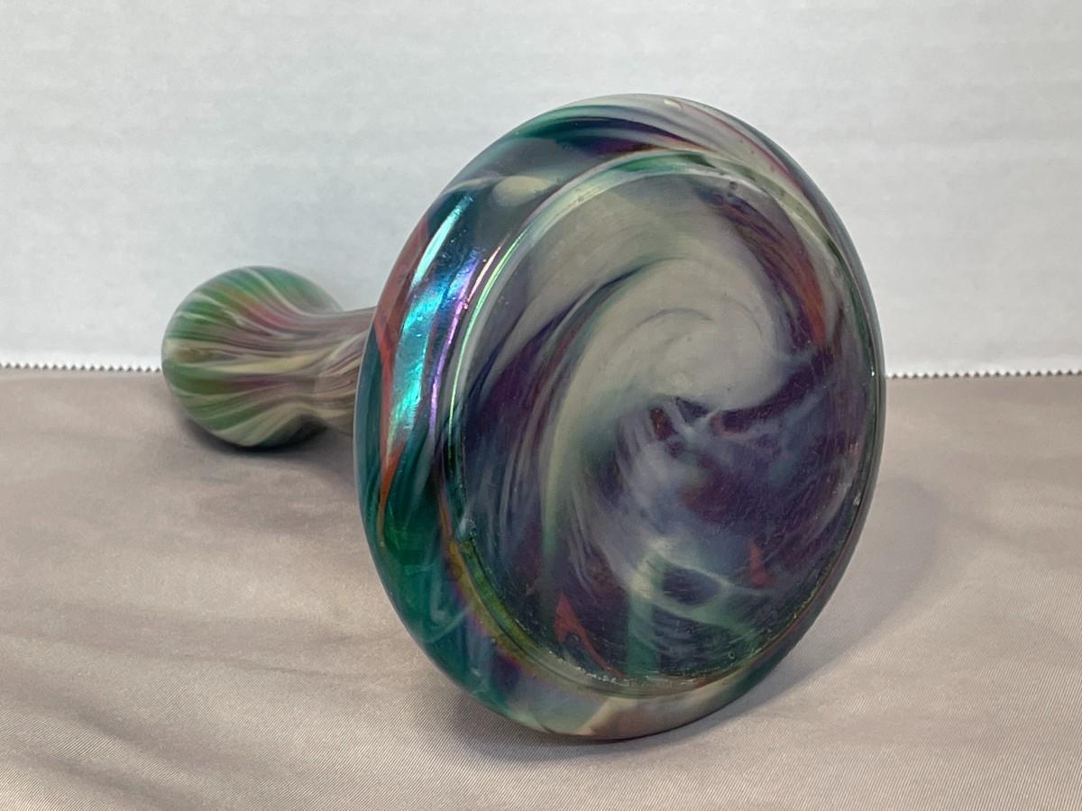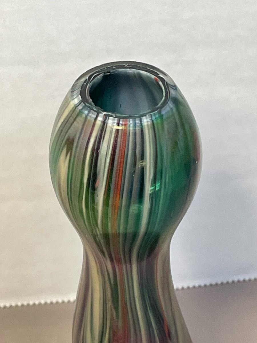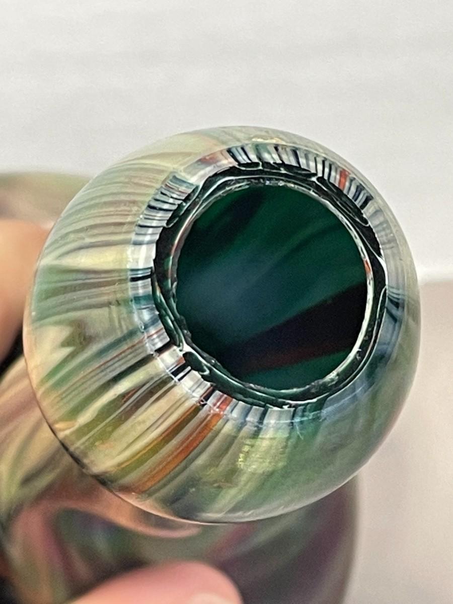 This iridescent glass vase has a twisted form and made of glass with a green, purple, white mixture of colors. It measures about 6.5 inches tall and 4 inches wide. Other than a minor flea bite at the inner neck, it is in excellent condition.