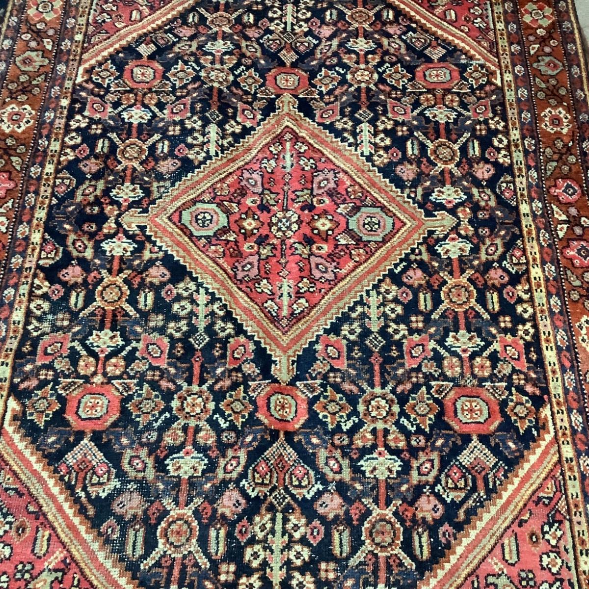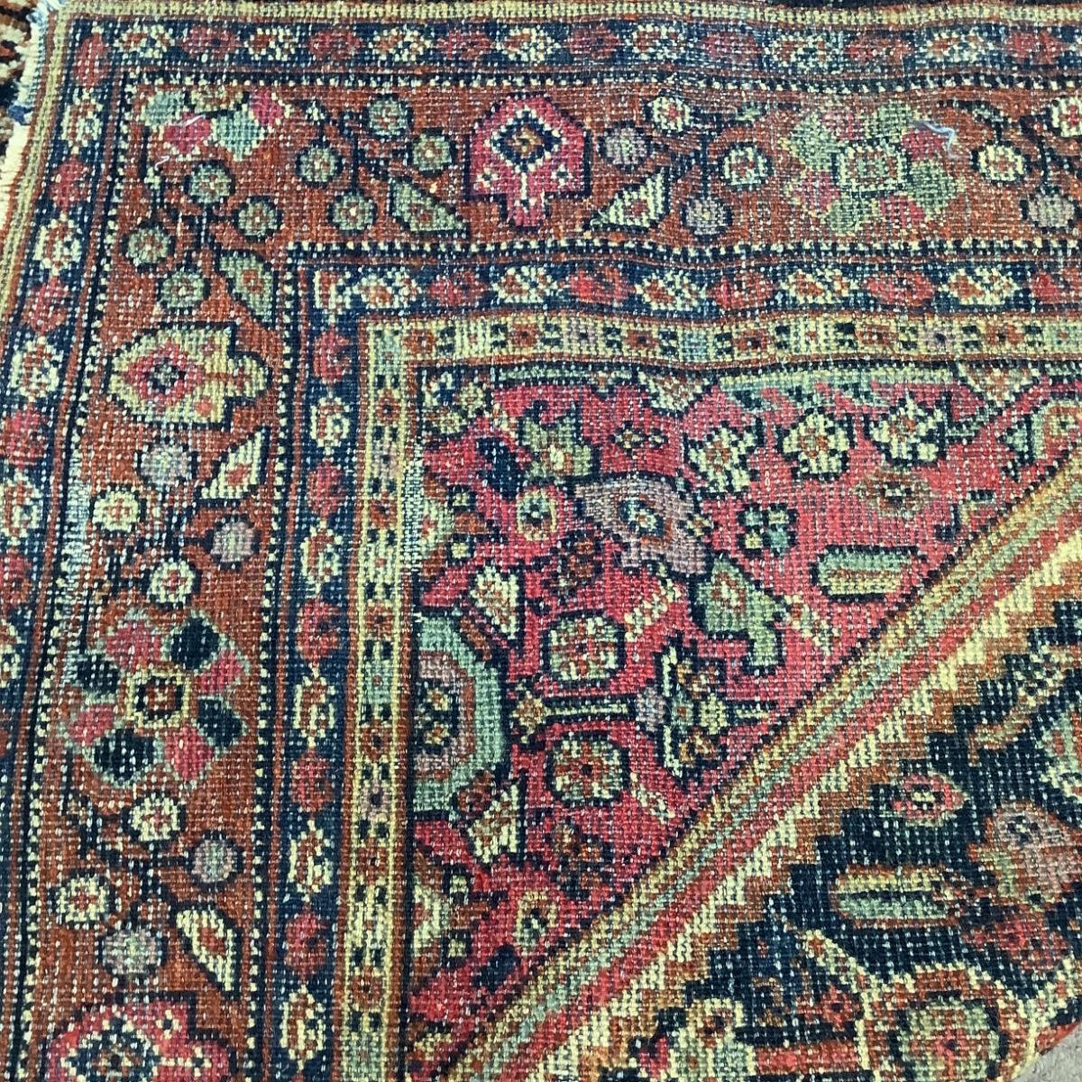 The rug has signs of wear and the fringe is worn off. It measures 82" x 54" and has coloring of red, pink and navy.