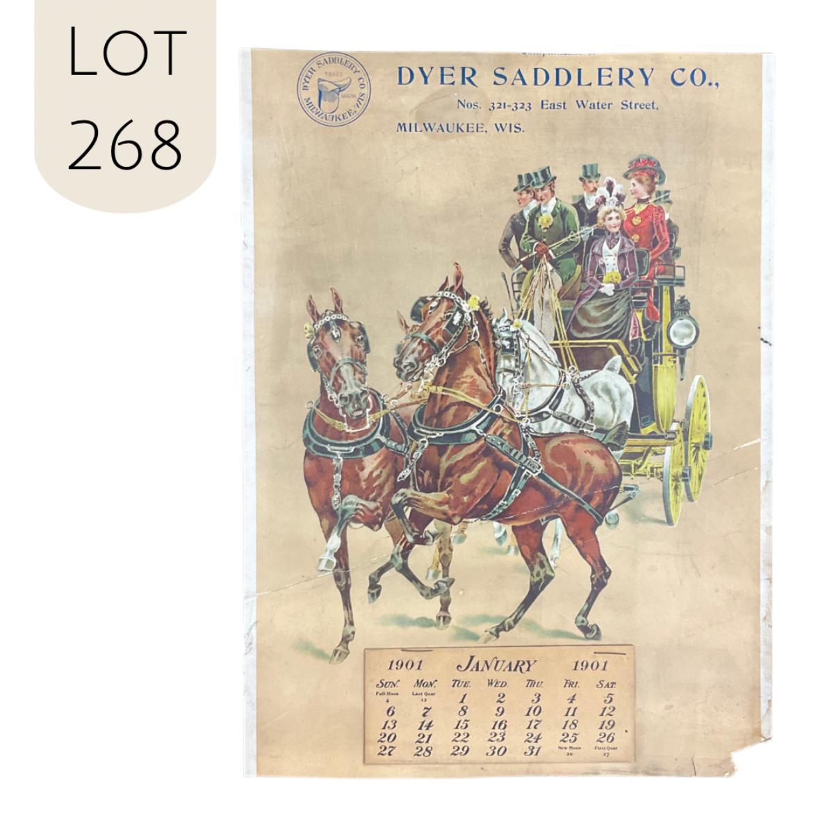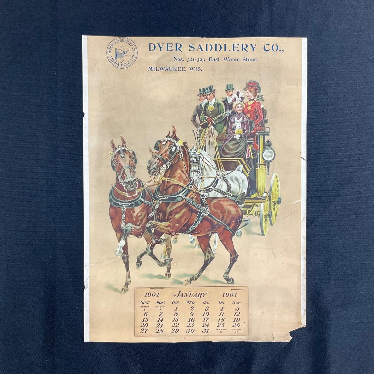 This calendar was compliments of the Dyer Saddlery Company on East Water Street in Milwaukee, Wisconsin. (It's a nice street). This calendar is complete, showing January 1901. This calendar features a very full Horse-drawn carriage with three men and two women riding along. This calendar has been trimmed perviously and measures now, 11" x 15". **|** Please see photos for details and condition. ::: Shipping is available on this lot. If you require shipping you must let us know at the close of the auction. We will coordinate with you after the item has been won. Shipping fees will include insurance up to or exceeding the value of all items being mailed. If you have any questions regarding this lot please contact the auctioneer either via this website, by direct email or by phone. PICK UP TIMES and other important information can be found in the TERMS and DESCRIPTION of the auction. Please take a look for pertinent information. Thanks!